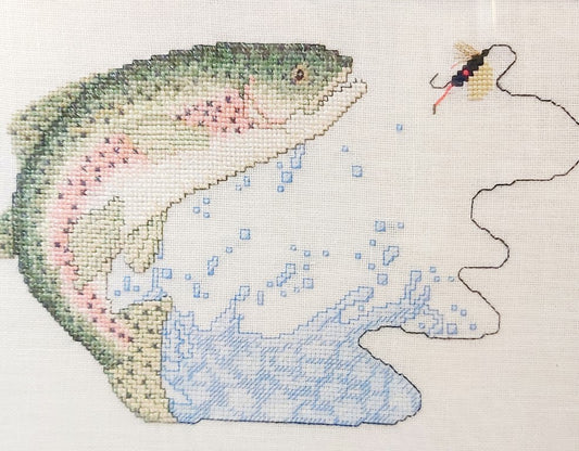 Vintage Framed Jumping Trout Cross Stitch with Lure