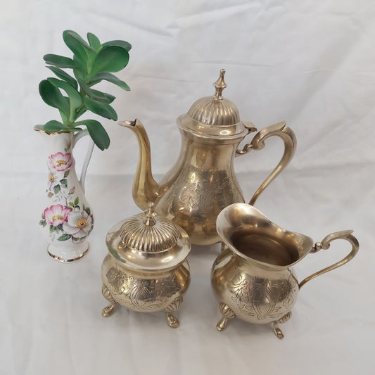 Mother of Pearl Inlaid Brass Salt & Pepper Shakers with Tray