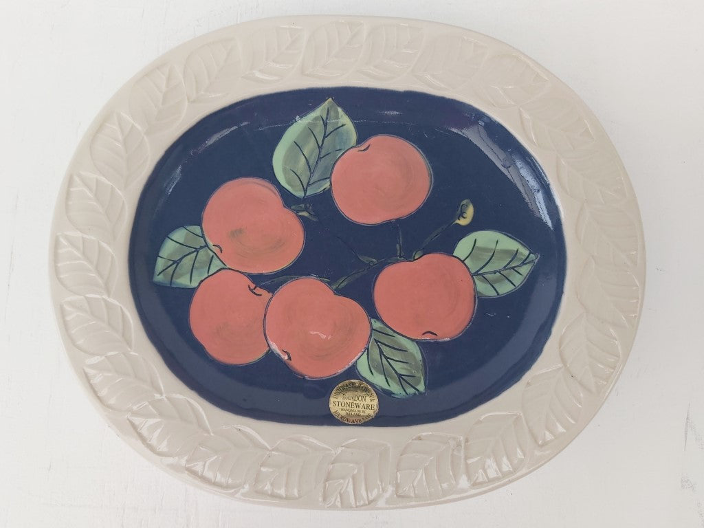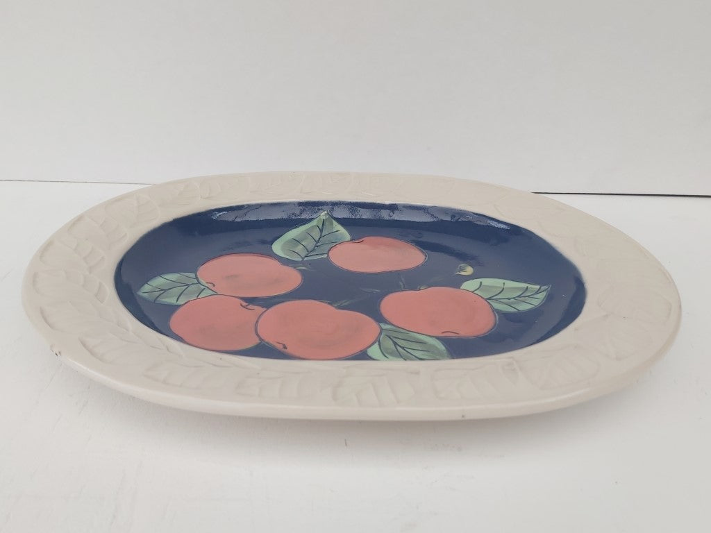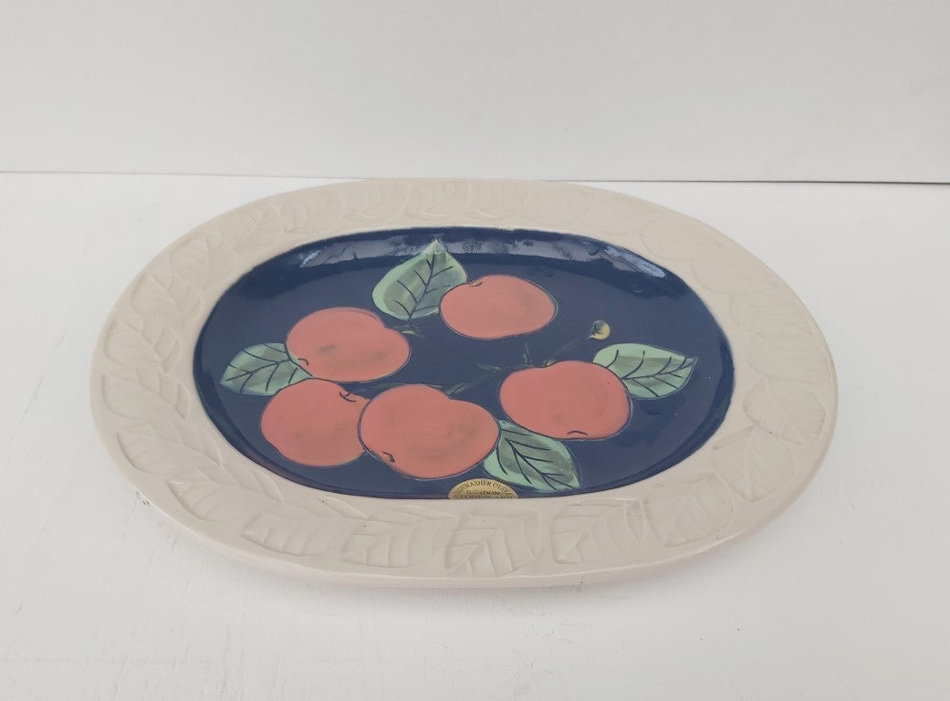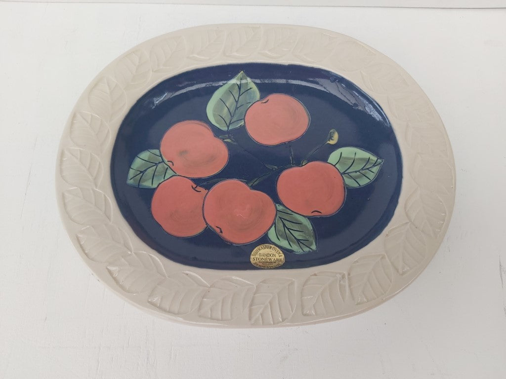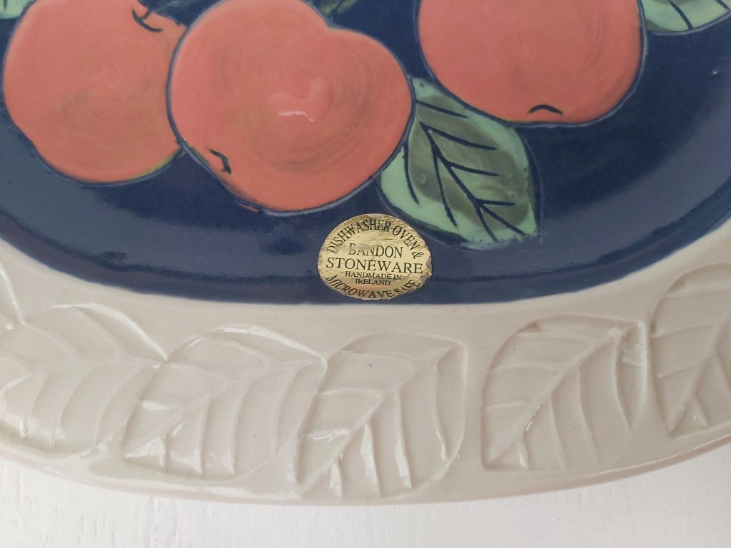 This Bandon Irish Stoneware Apple Dish makes a perfect condition to your kitchen! Perfect for baking and serving your favorite dishes, this microwave, oven, and dishwasher safe dish features beautiful hand painted embossed apples on a blue background. With the original label still attached and in excellent condition, this dish makes a great gift for any occasion.