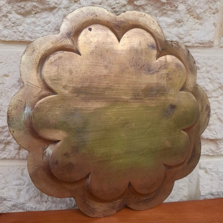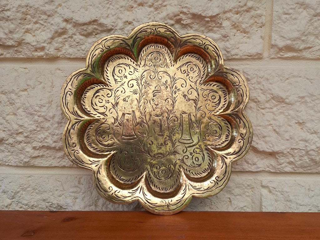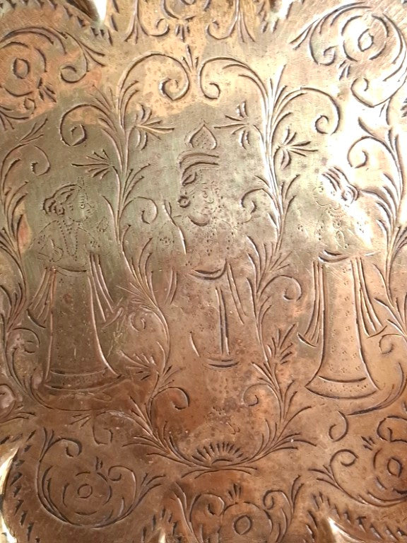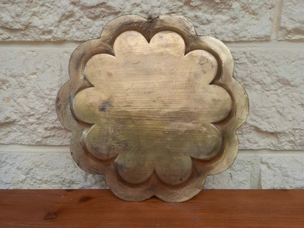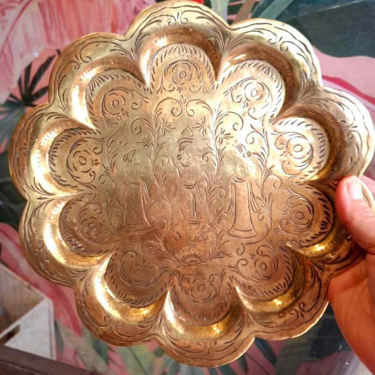 Add a touch of vintage elegance to your home with our Beautiful Brass Flower Shaped Tray. Featuring an intricately engraved design with three charming figures, this tray is shaped with 10 scalloped petals. Perfect for serving or displaying small items.