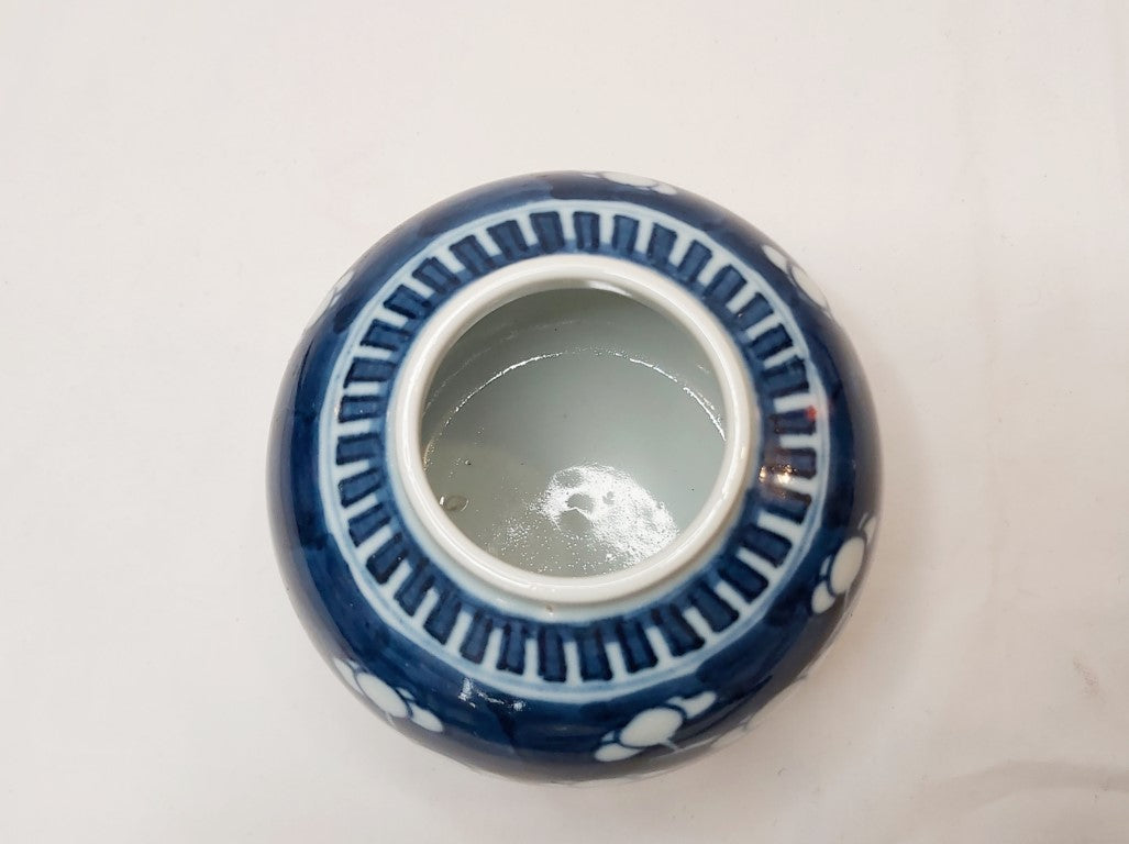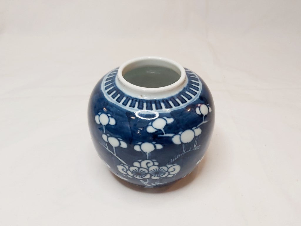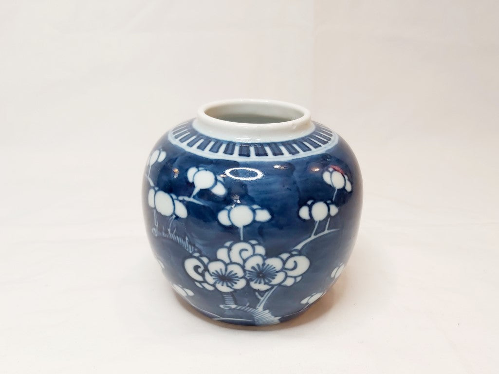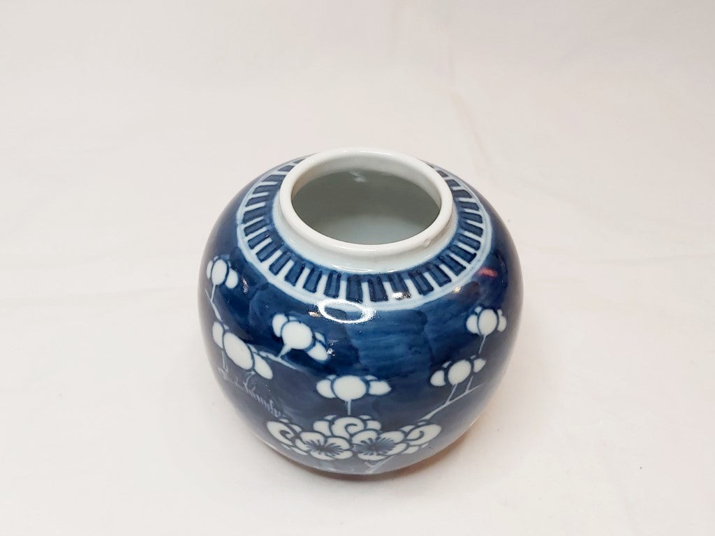 Simple and elegant, this Chinese Blue Prunus Ginger Jar is in excellent condition and appears to be a more contemporary piece. No chips or cracks but is missing it's lid. Use it as a stunning vase to add a touch of sophistication to any room.