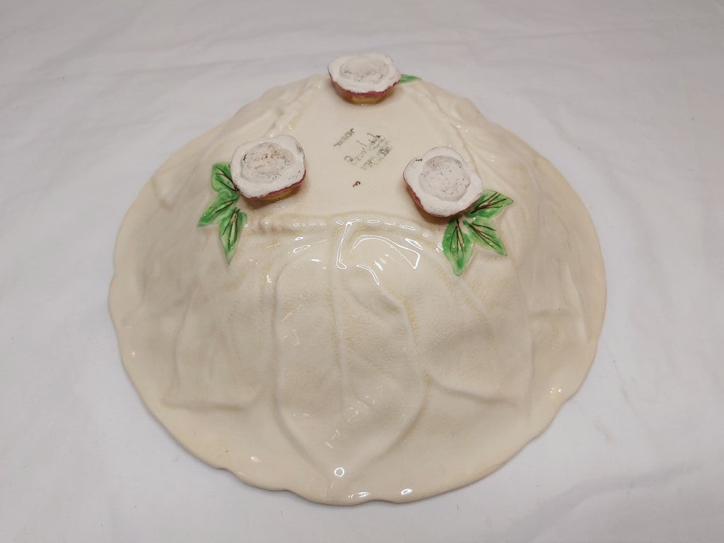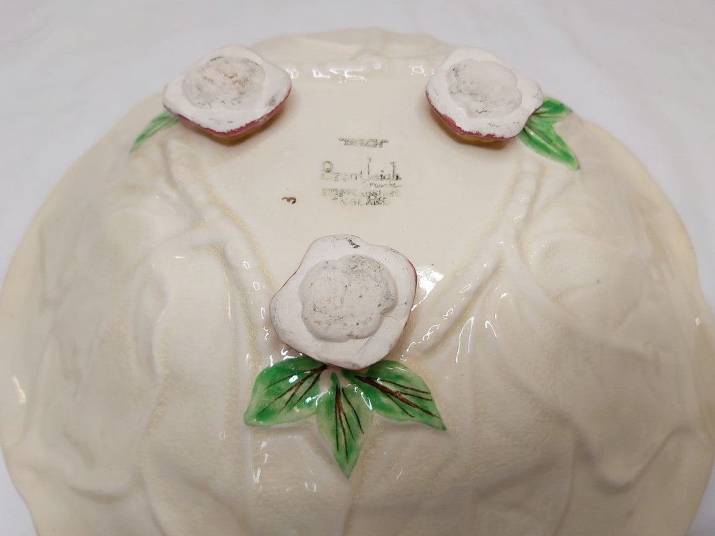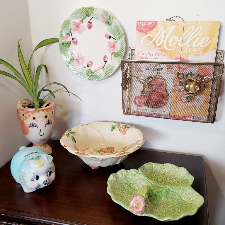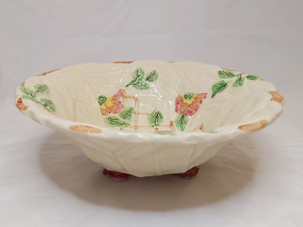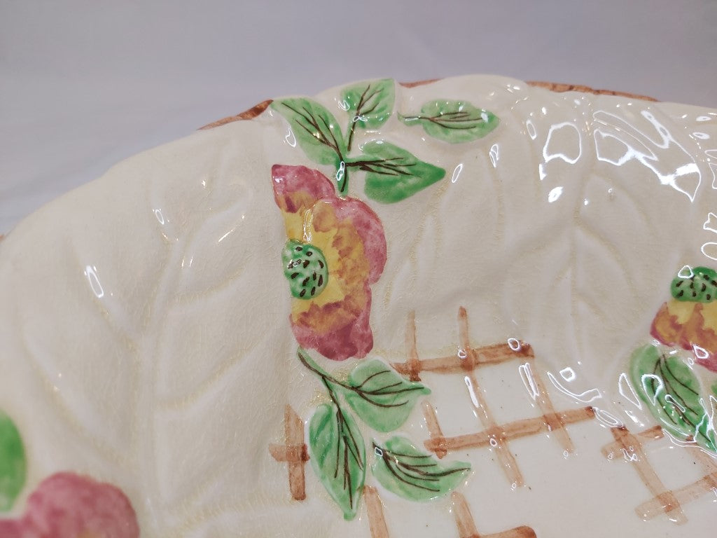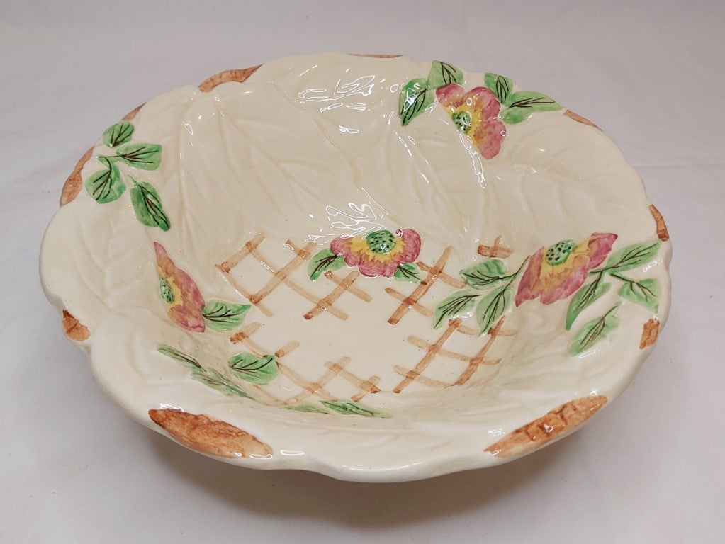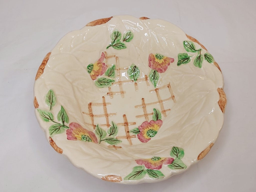 1950's Staffordshire majolica bowl with a pretty raised leaves and pink flowers pattern with a trellis background. Brentleigh produced pottery in Stoke between the 1920's and the 1970's. A really pretty piece to use as decor, fruit bowl, hung on the wall or for its intended use as a salad bowl. Just remember that these older pieces are hand wash only.