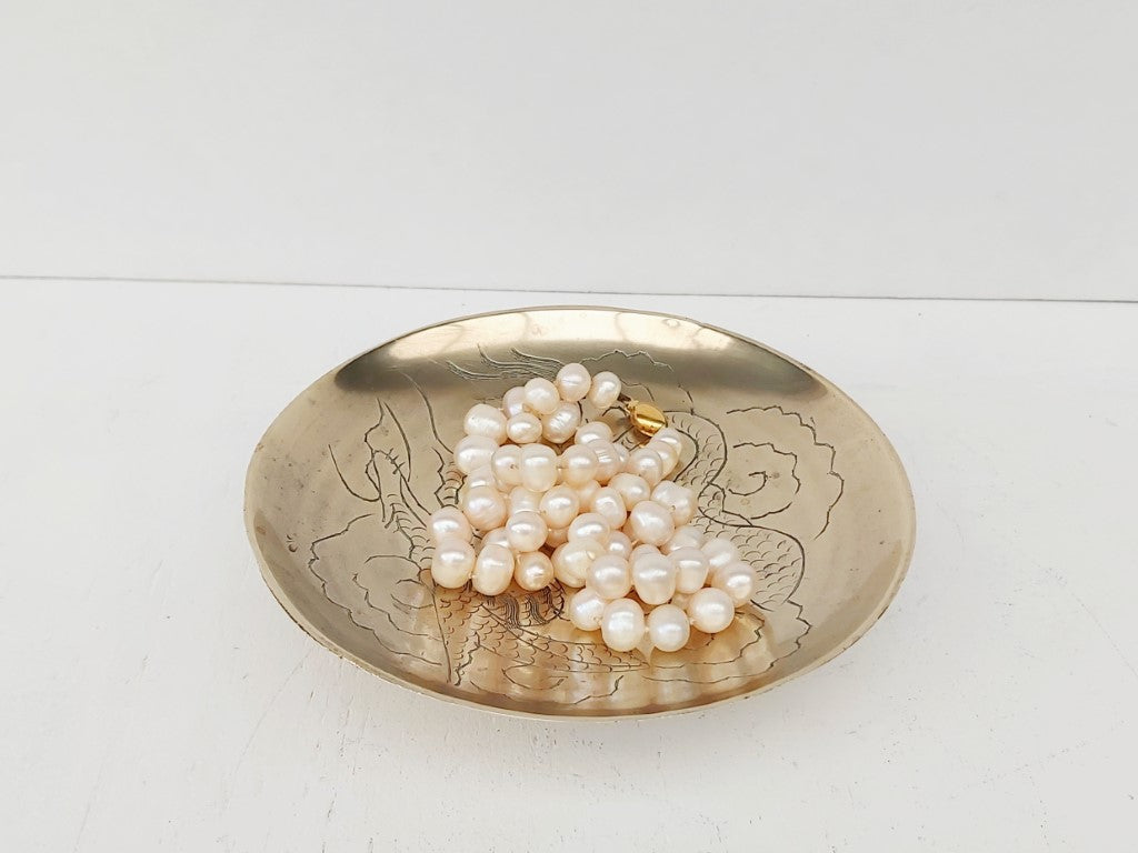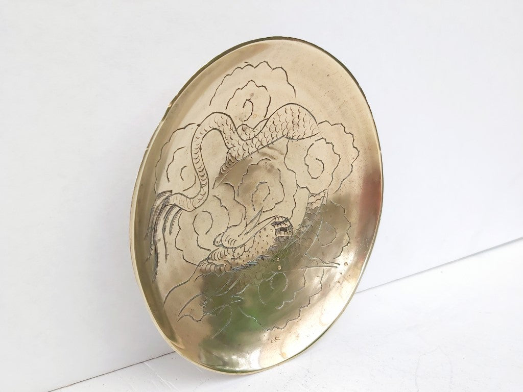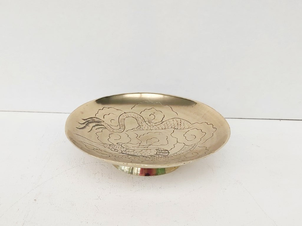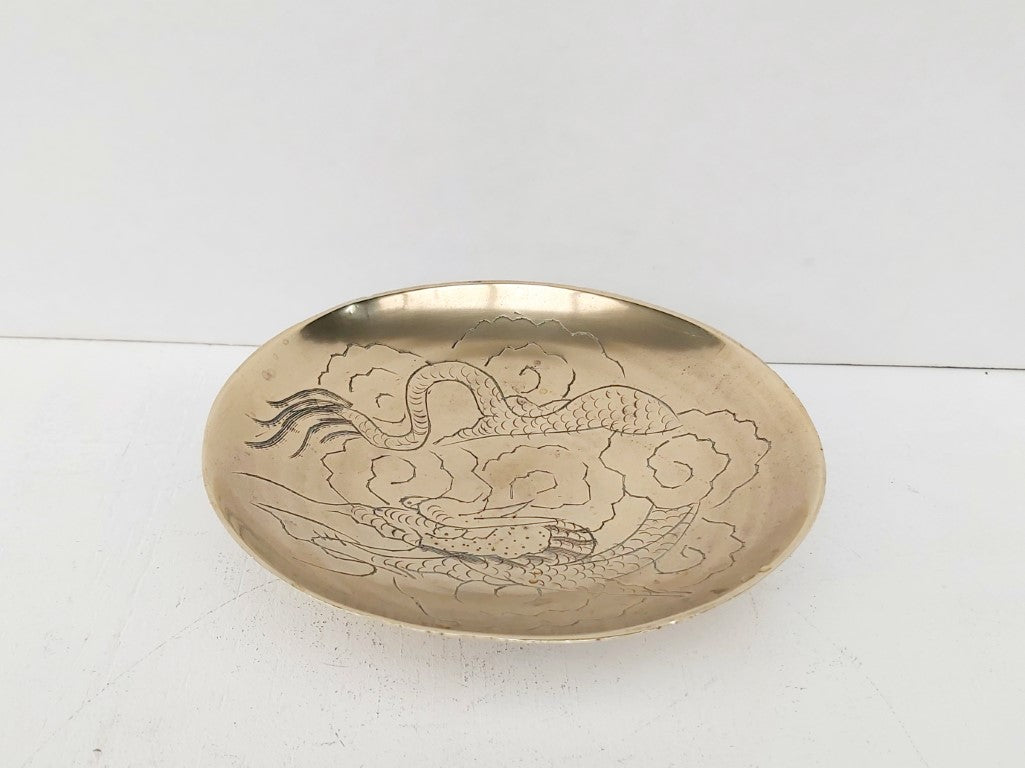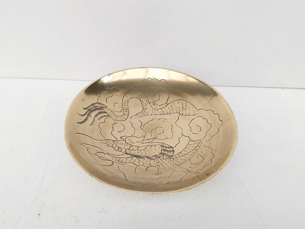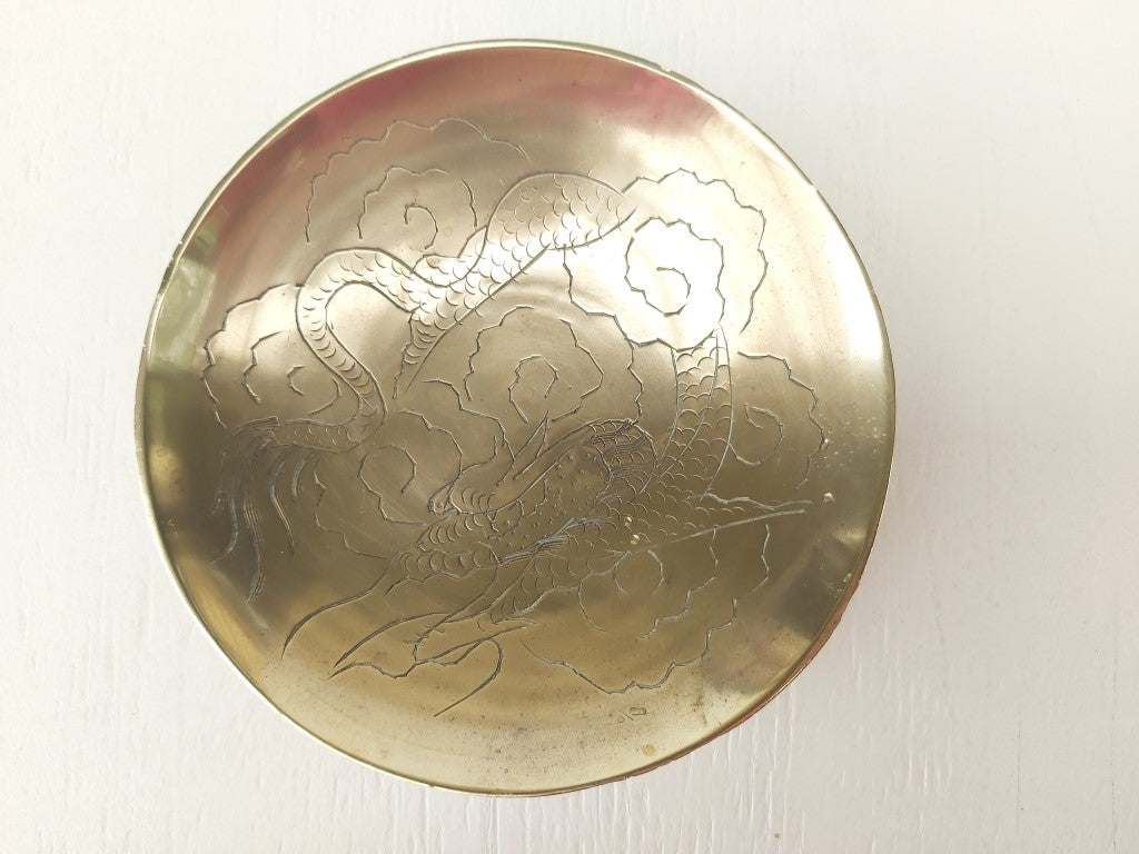 Engraved with a dragon, this chinese brass open dish is perfect for trinkets, keys, loose change, or just pure decoration.