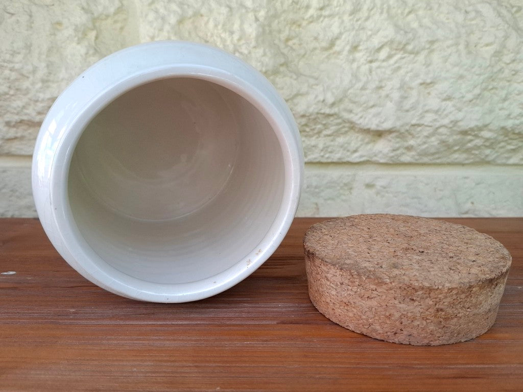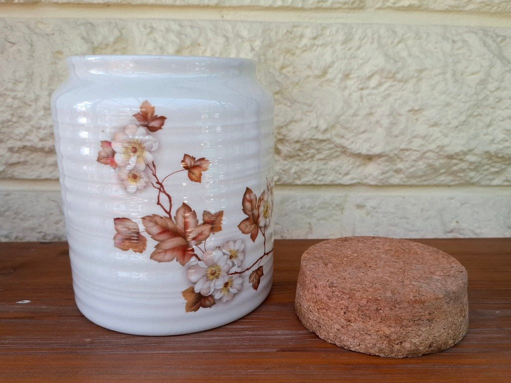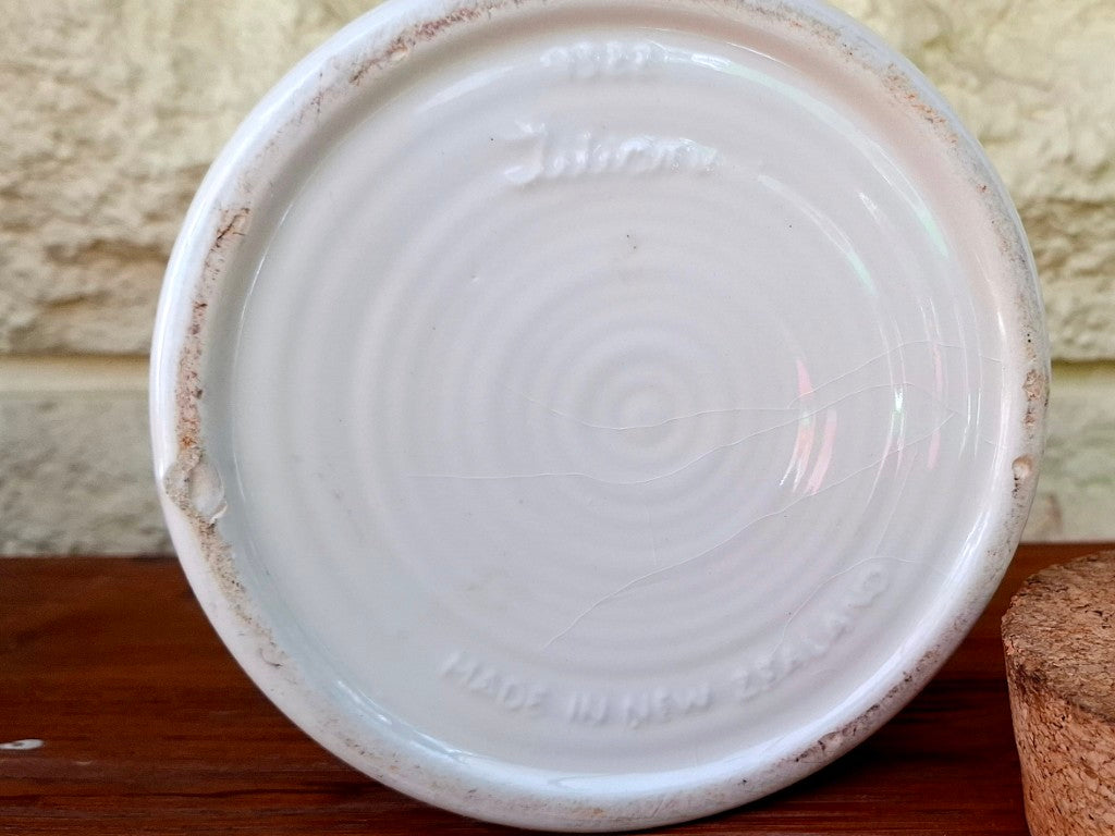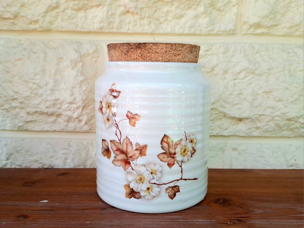 This vintage Crown Lynn Titianware canister, featuring the charming Hazelwood pattern, is a must-have for any collector. It is in good condition with a cork lid, though there is a lot of surface crazing and a small chip on the base, none of which affects the use. Don't miss out on adding this unique piece to your collection!