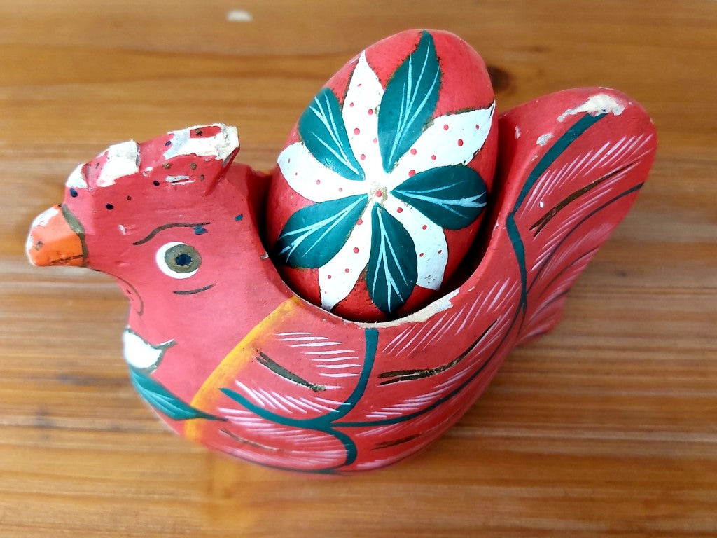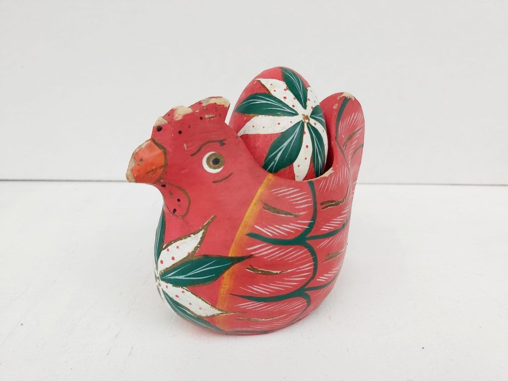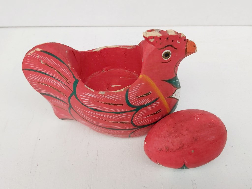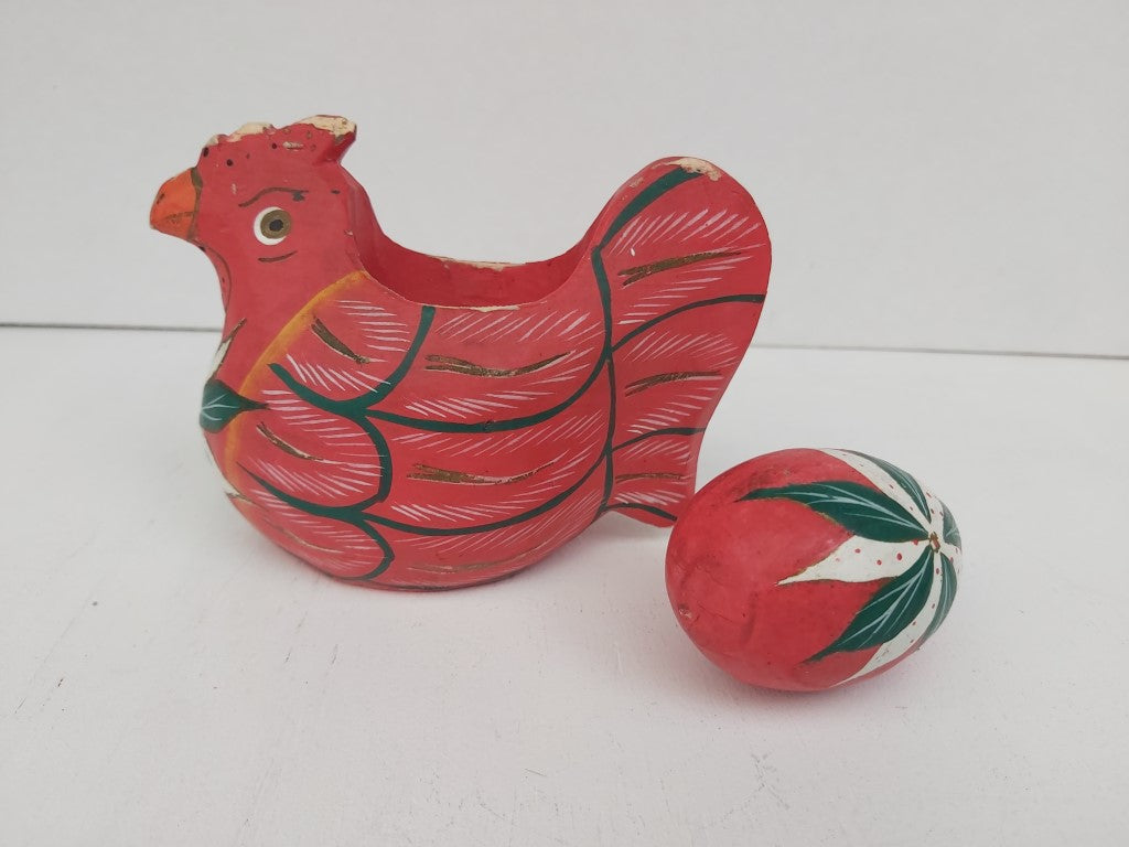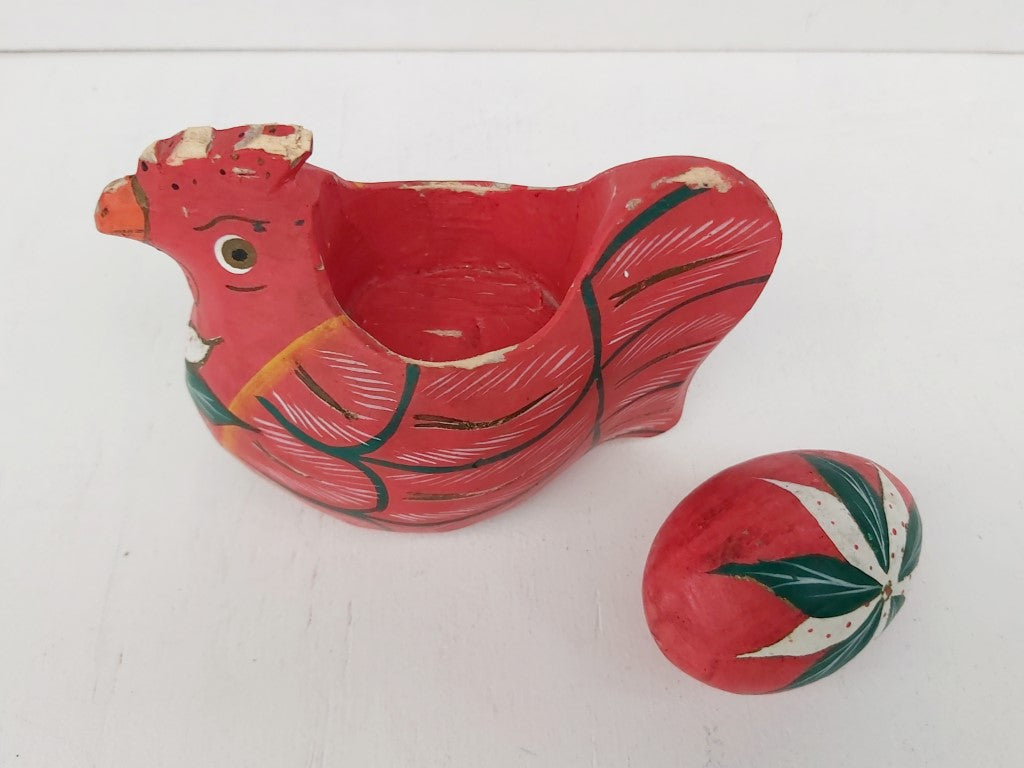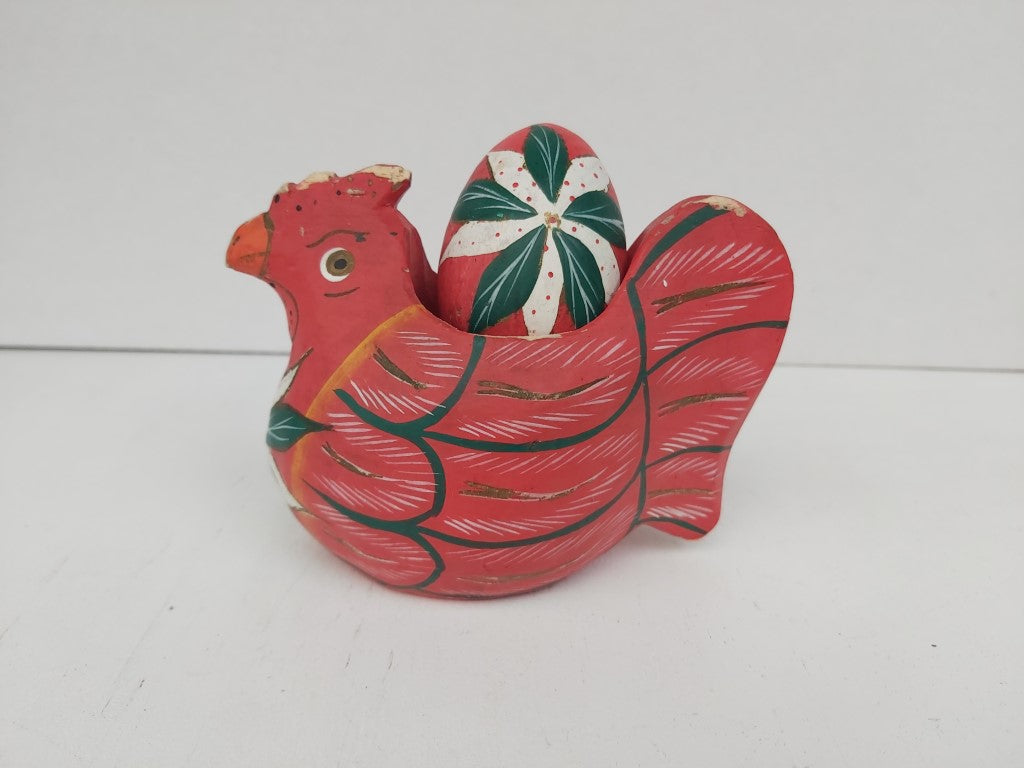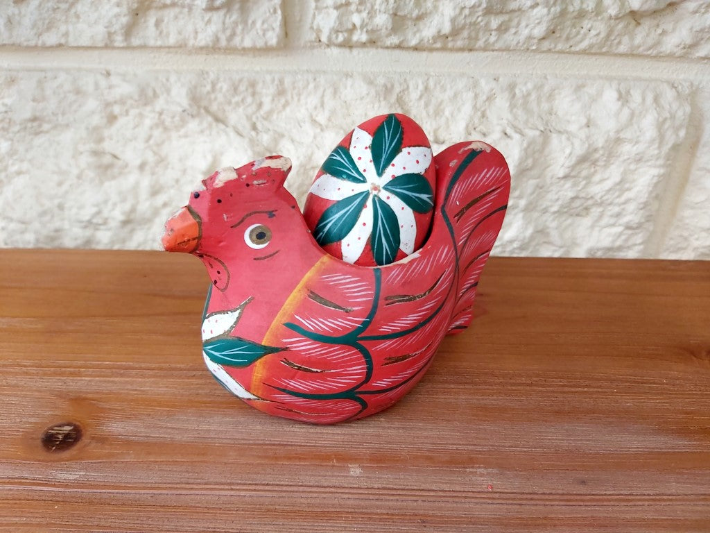 Add a touch of charm and whimsy to your home with our Folk Art Wooden Chicken and Egg. This rustic, cottage style piece is intricately hand-painted, making it a unique addition to any decor. Perfect for those who love Scandinavian design or appreciate traditional folk art. In great vintage condition with some patina and wear on the comb.