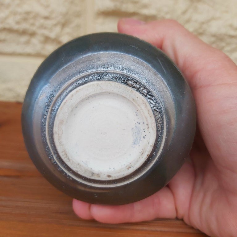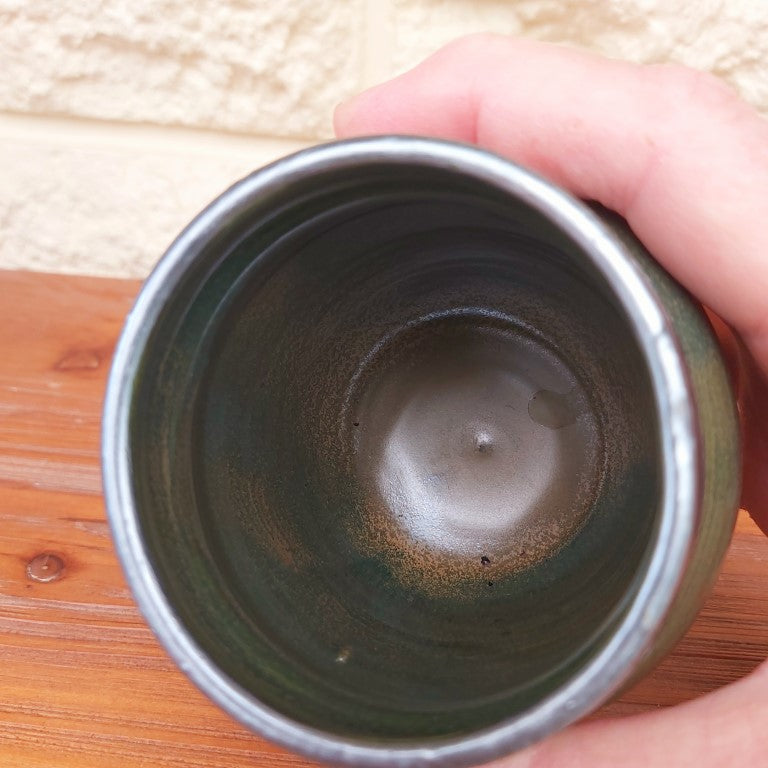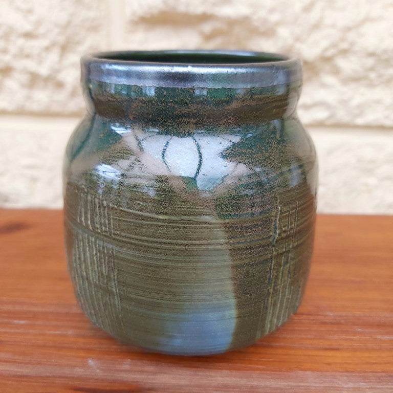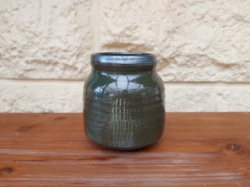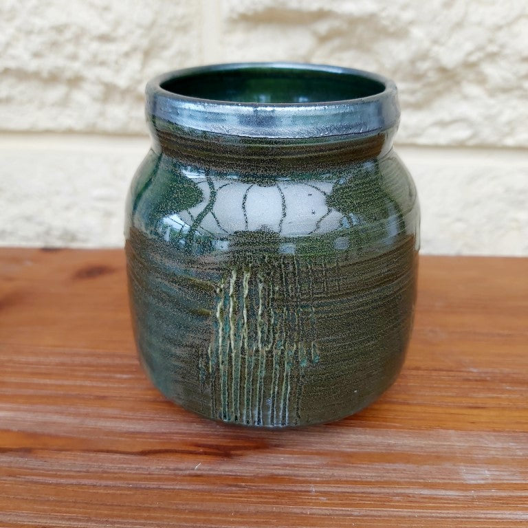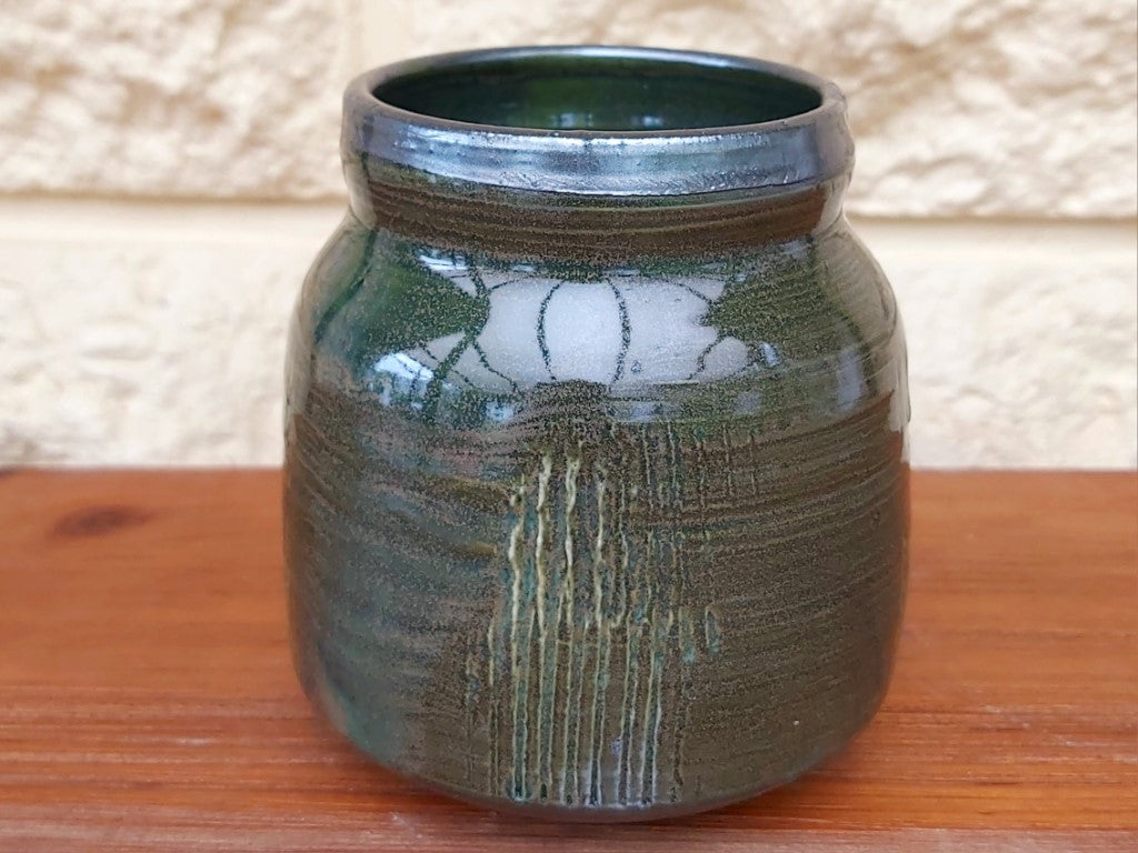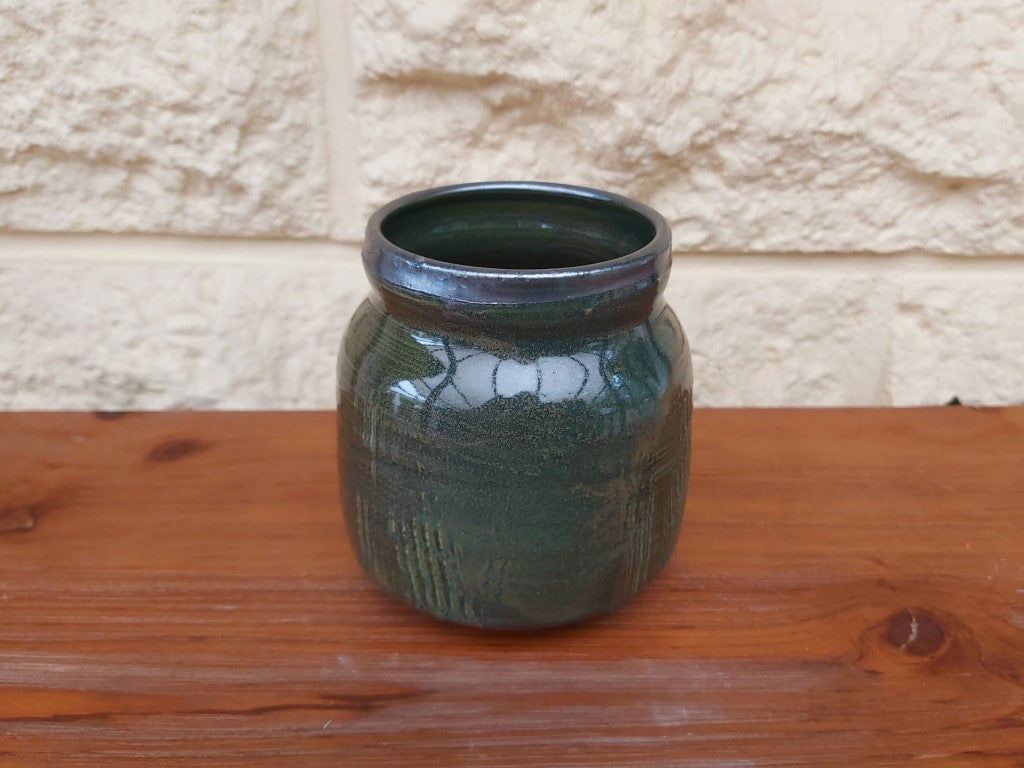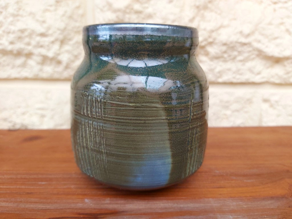 Experience the simple beauty of the Green Palladium Glazed Jar. Its native forest green color and metallic palladium glaze detail make it a unique addition to any space. Its textured surface adds a touch of sophistication, while its versatility allows you to use it as a vase, pen holder, planter, or even an open sugar bowl. In excellent condition, this ceramic jar is a must-have for any home.