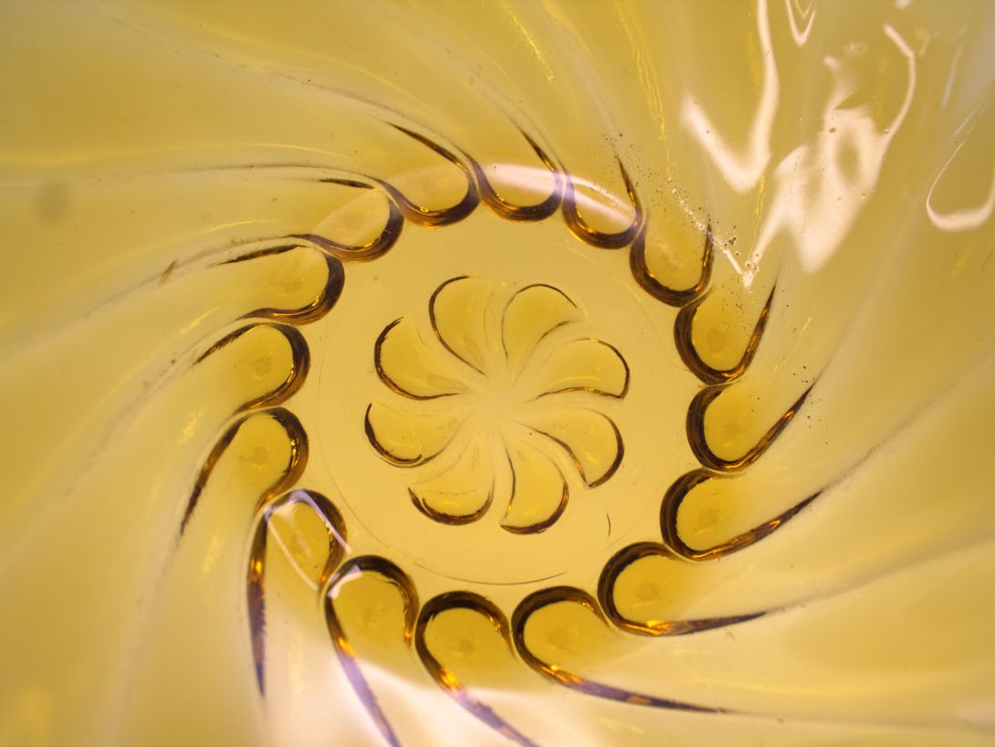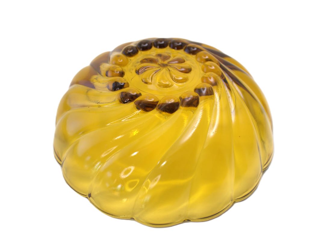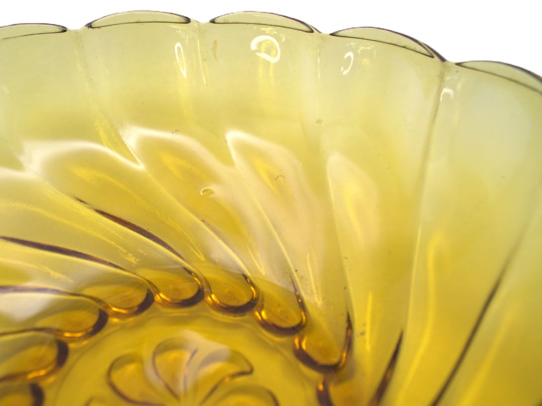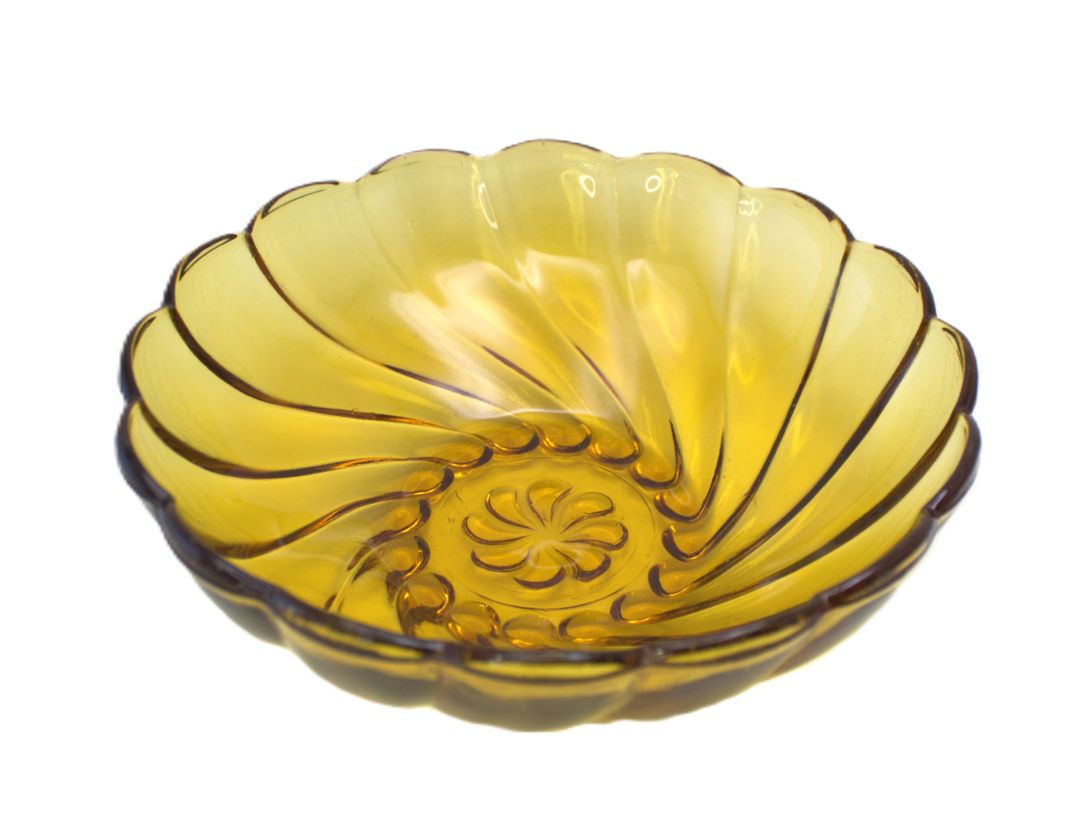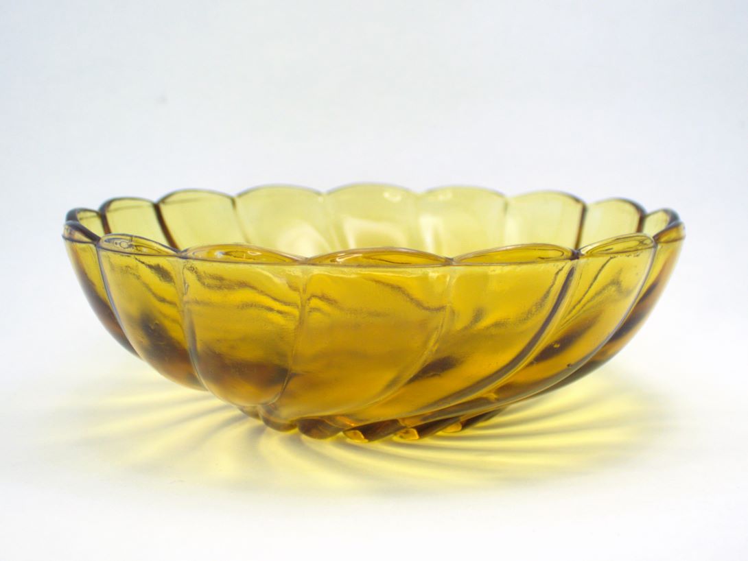 A beautiful amber coloured glass bowl featuring a scalloped top and flower base. It displays well and looks amazing when the light shines through it.