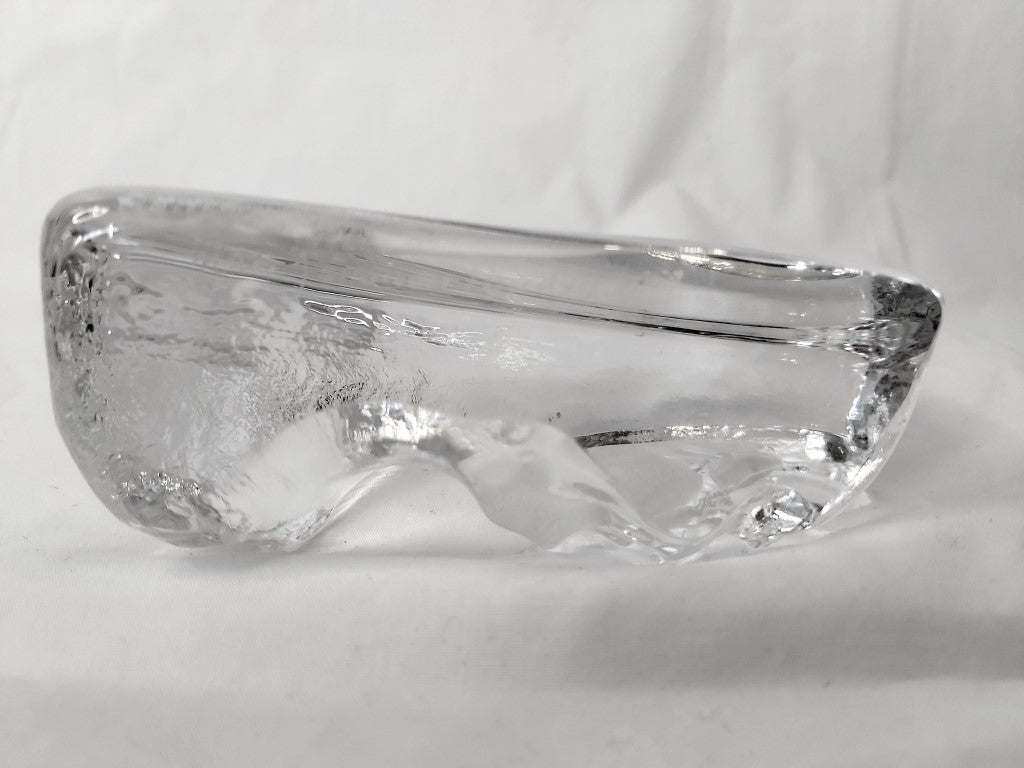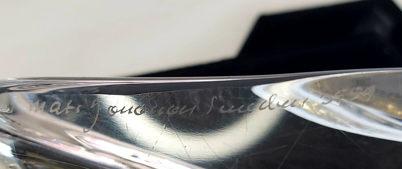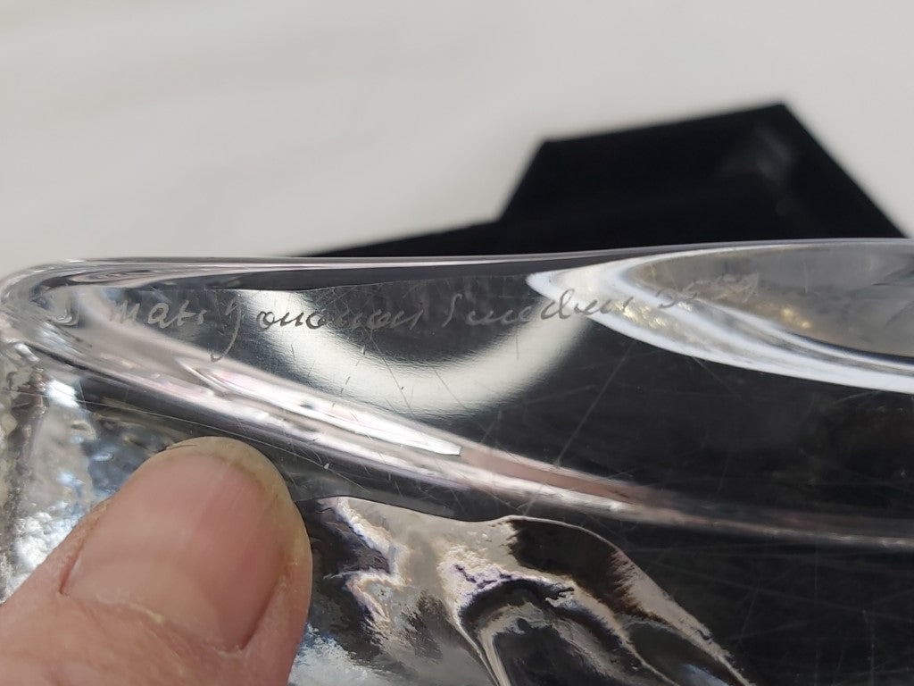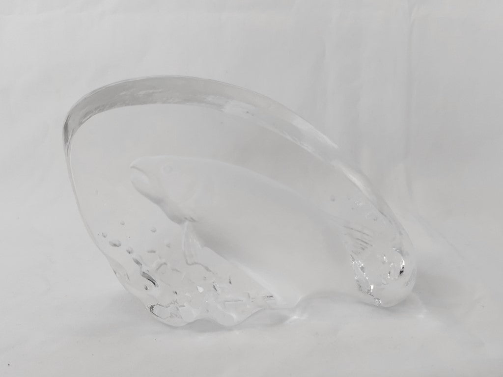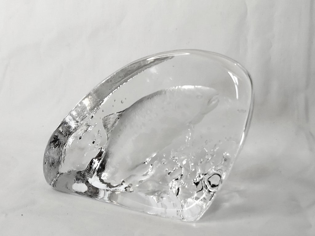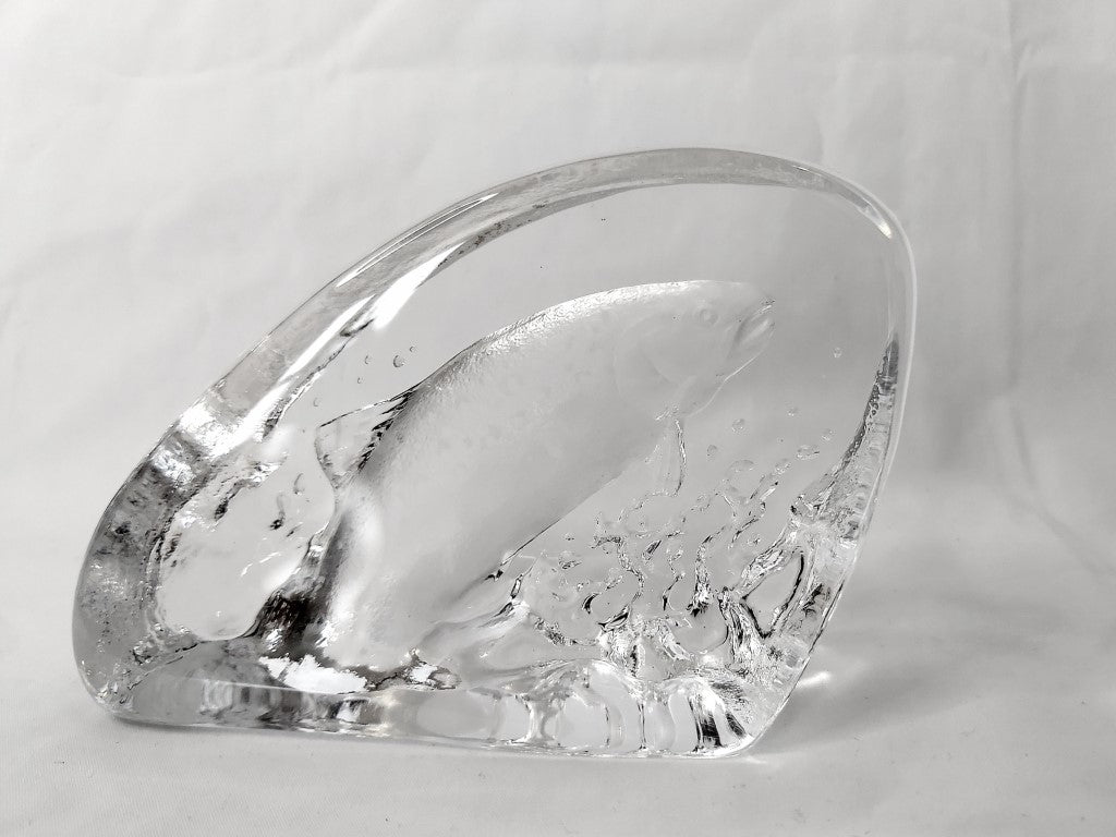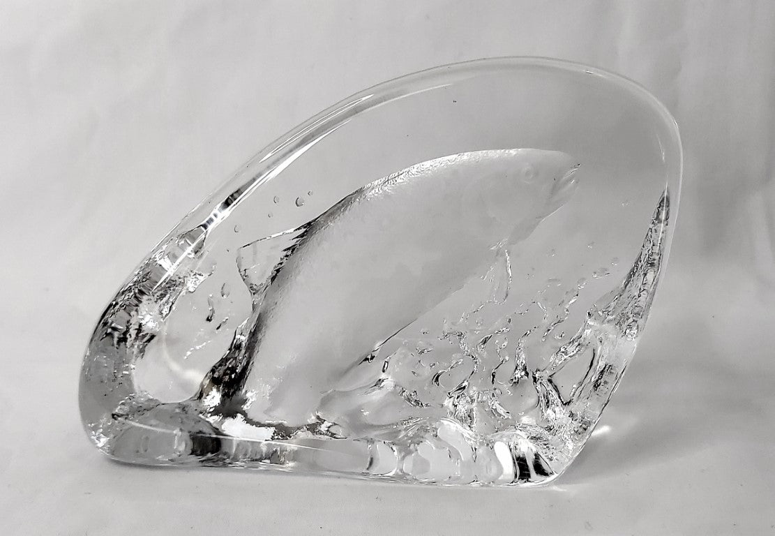 This vintage crystal paperweight was designed by famous Swedish designer Mats Jonassen. It is signed and numbered 0559. The base has a little light scratching but otherwise in excellent condition with no chips or cracks. The perfect gift for the fisherman or fisherwoman in your life!