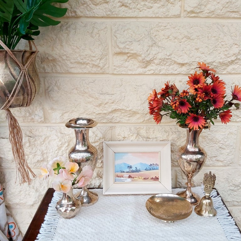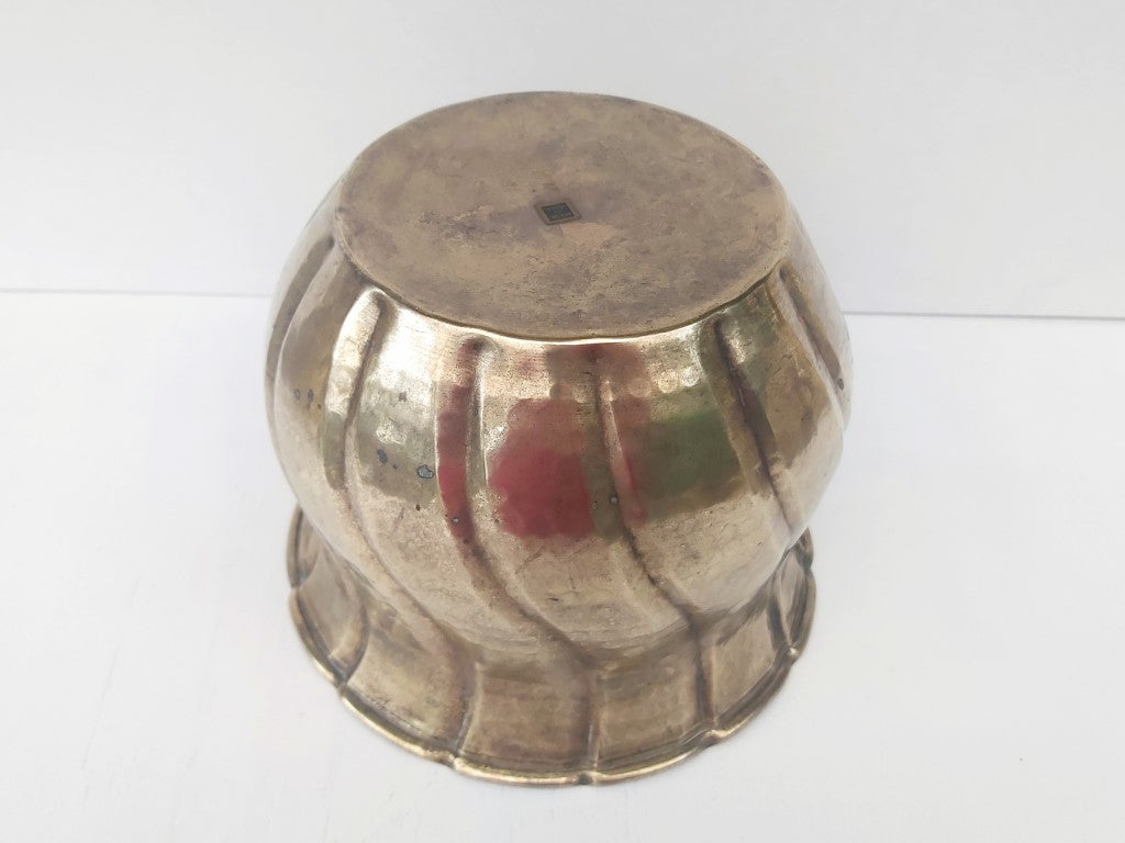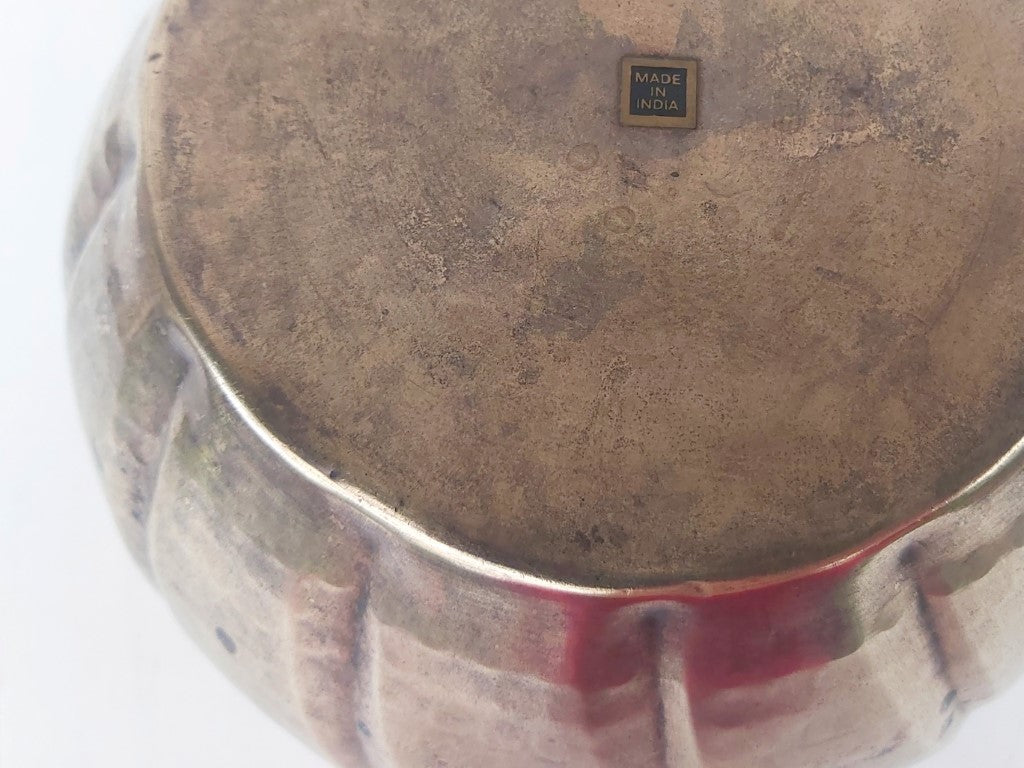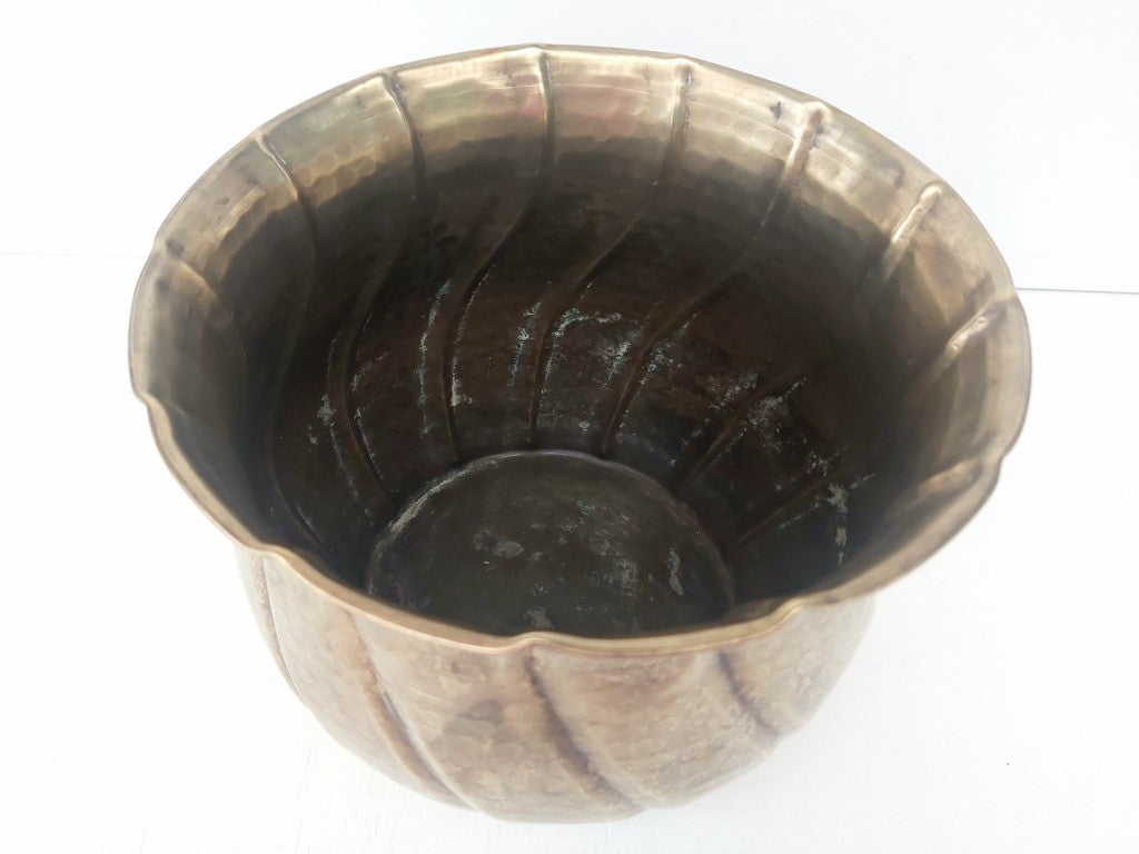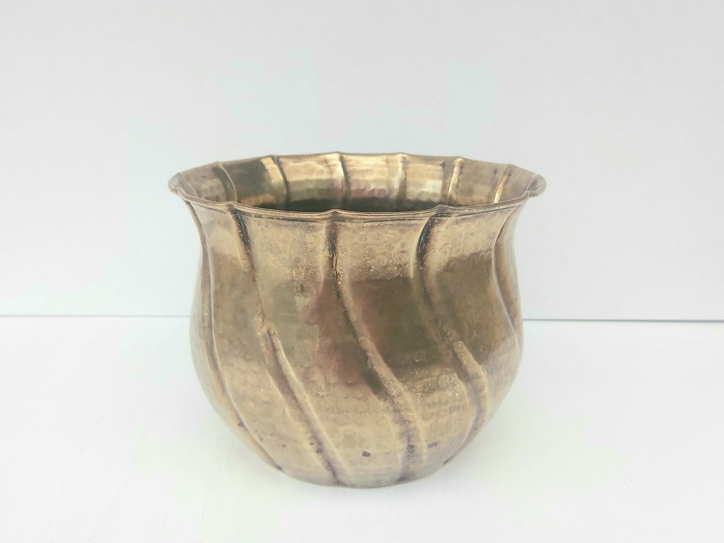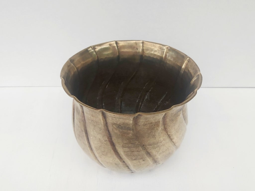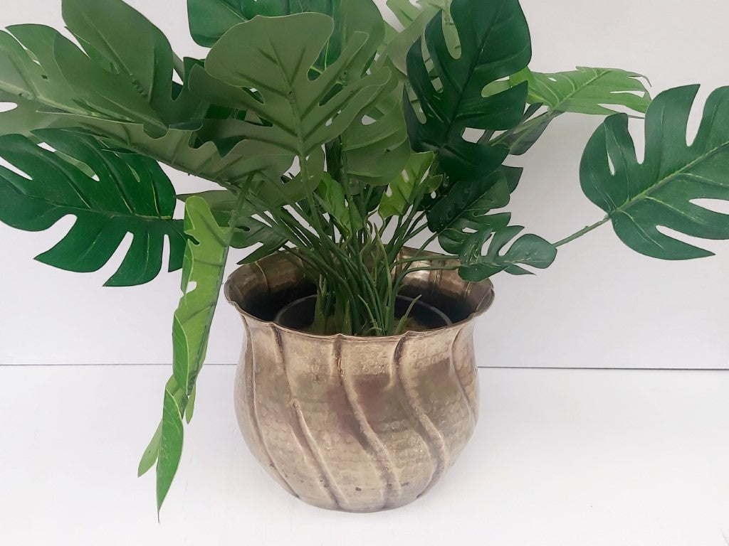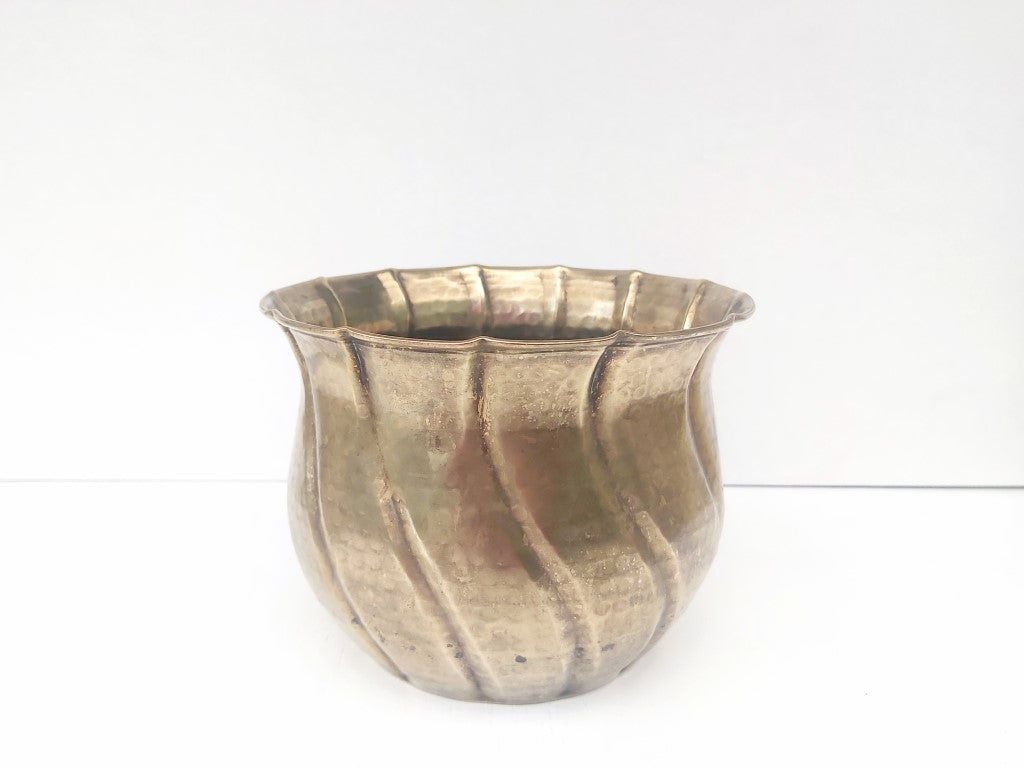 Get in the 'mid' century mindset with this MCM Hammered Brass Planter! The wave ridges add texture and flair to this unique piece, making it perfect for adding a touch of personality to any space. Say goodbye to boring planters, and hello to the groovy vibes of this one! (No parachute pants required). Clean and polished but with a lovely amount of patina. This would make a lovely gift paired with a plant!