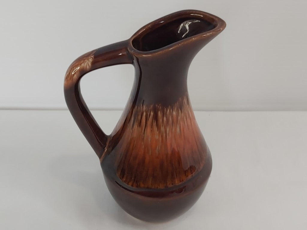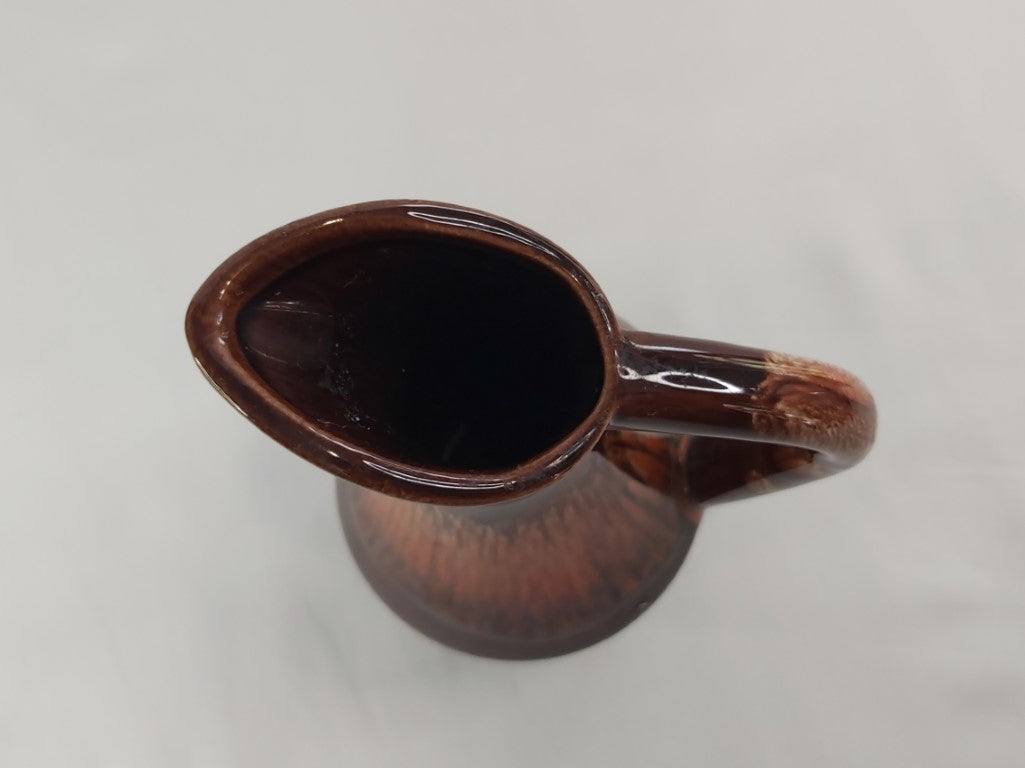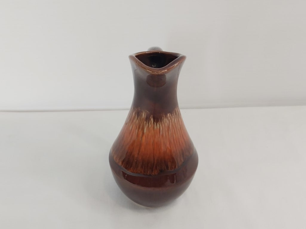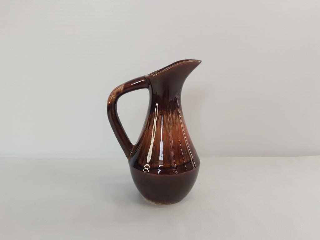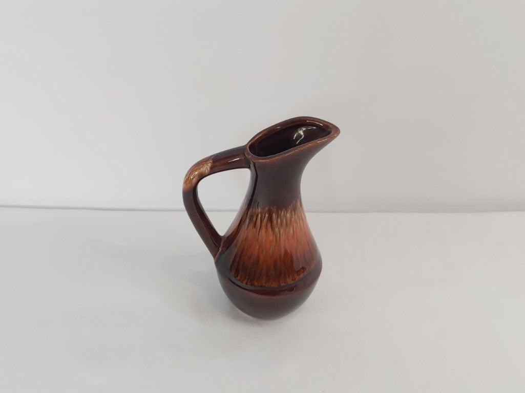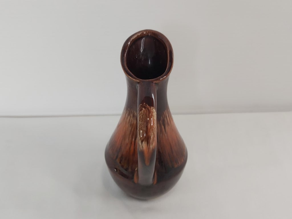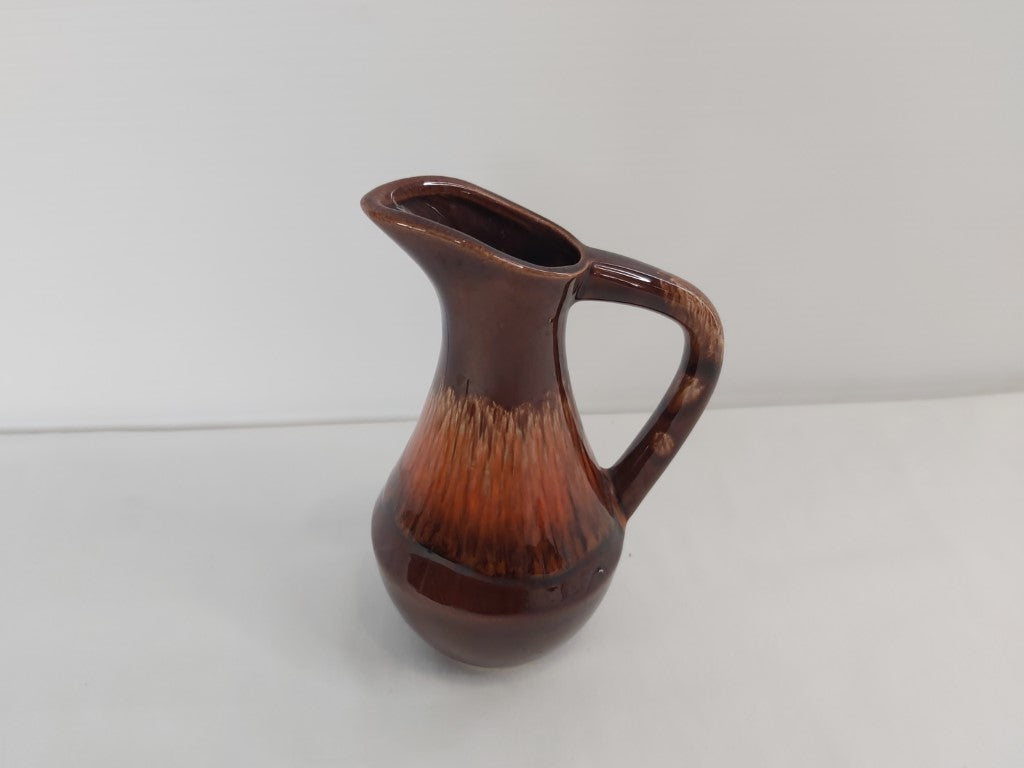 With its excellent condition and unique brown, orange, and ochre tones, this pitcher doubles as a great vase. The atomic style handle adds a touch of retro cool to any room. A must-have for those who love quirky decor. No chips or cracks.