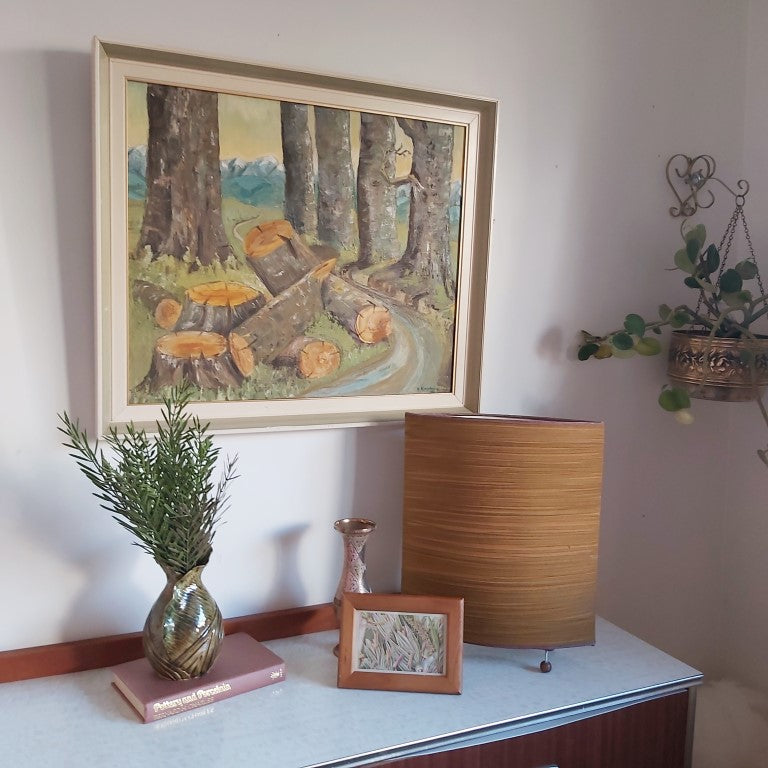 Very cool mid century vintage lamp. It will need rewiring, as the cord was cut previously but otherwise in great vintage condition. Please note that it is made to lean back slightly.