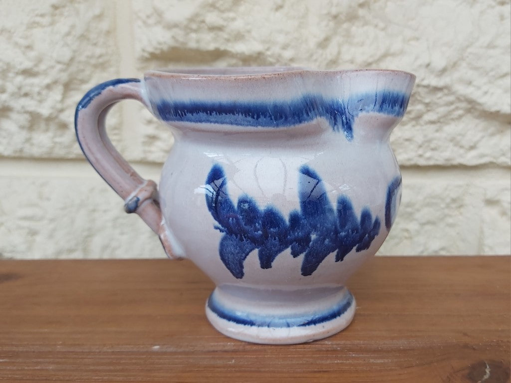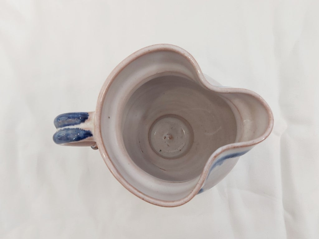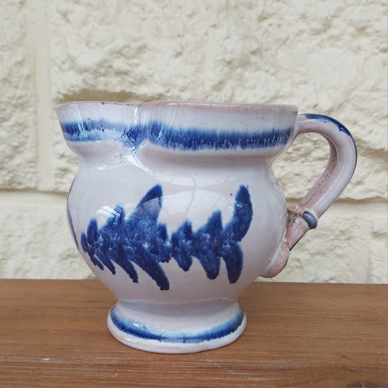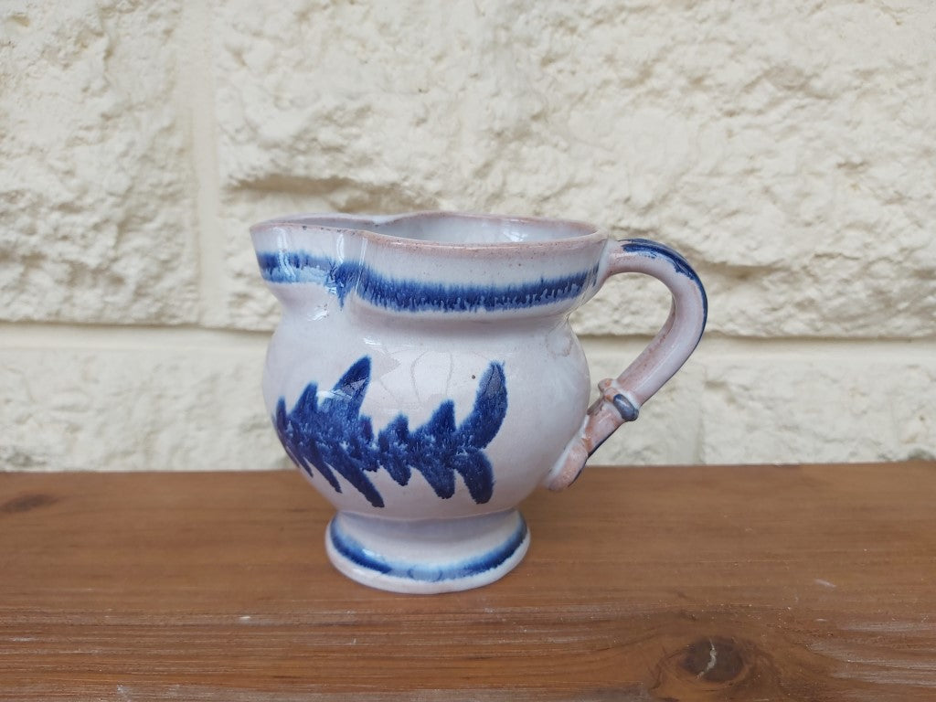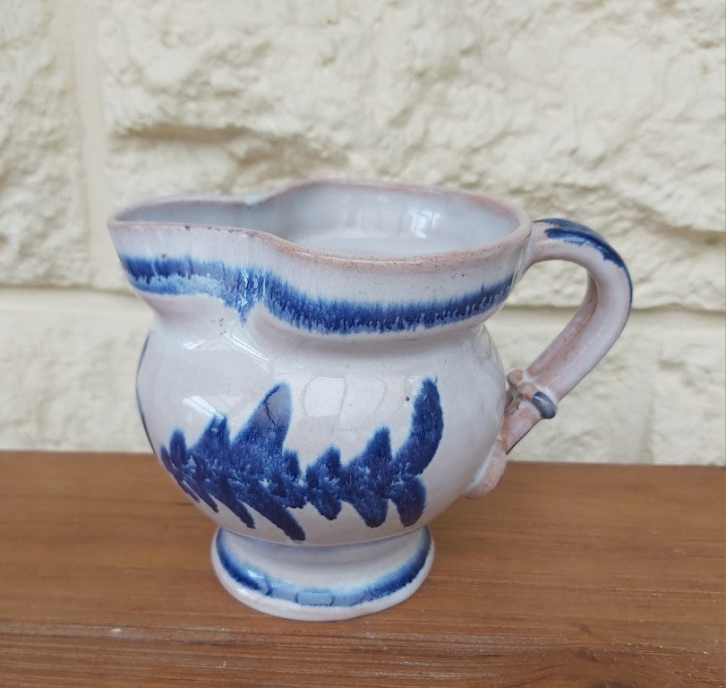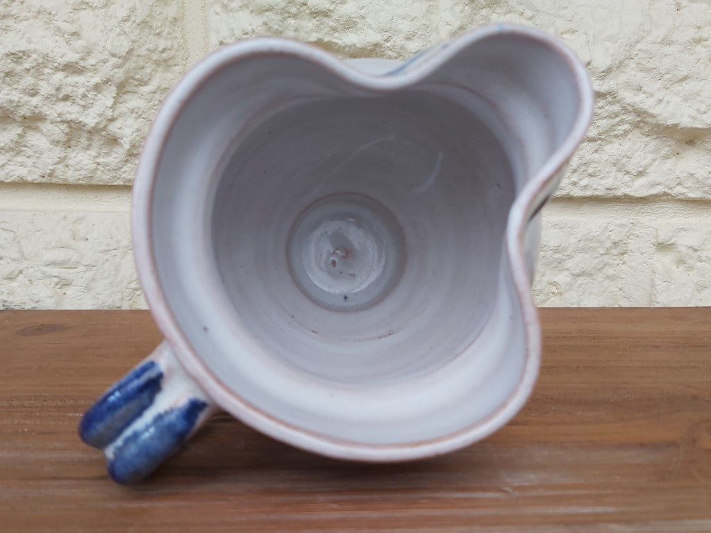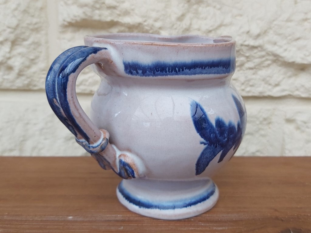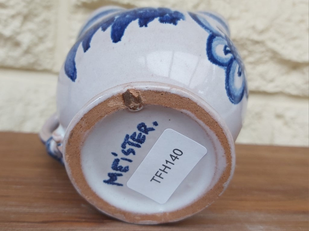 The Meister Blue and White Studio Pottery Jug is a charming addition to any home. With its beautiful blue and white floral design on terracotta, this piece is sure to catch the eye. Could be used as a beautiful cottagecore style vase! Crafted by the talented artist Meister, this jug is not only a stunning decoration but also a practical gift for any occasion. In excellent condition, no chips or cracks.