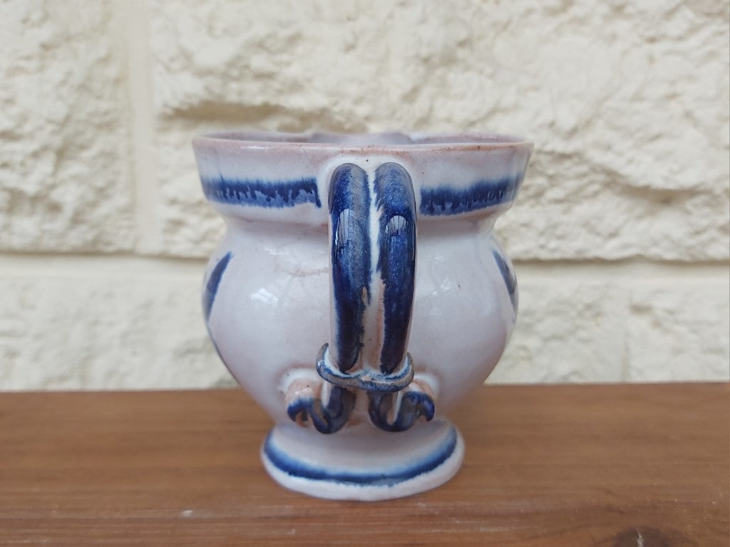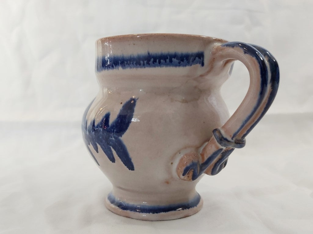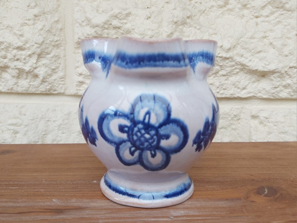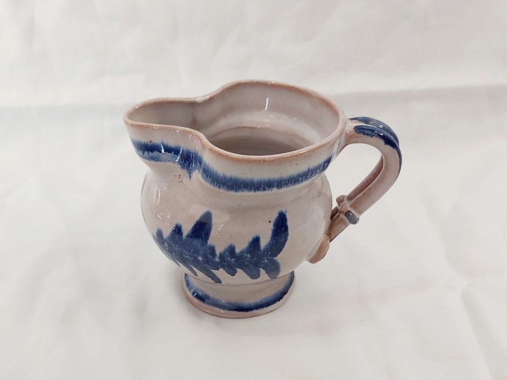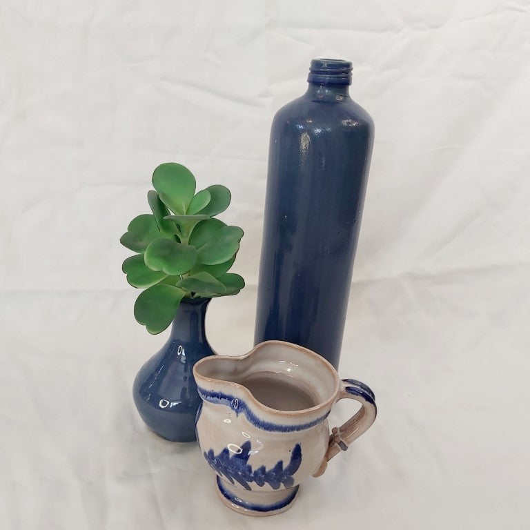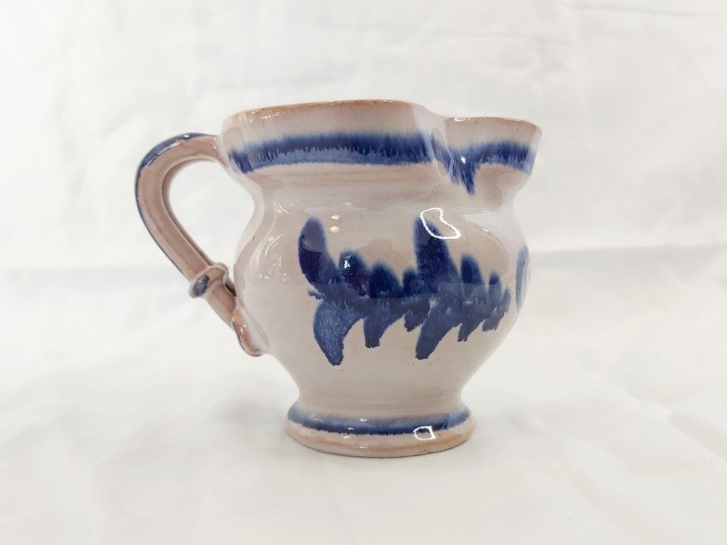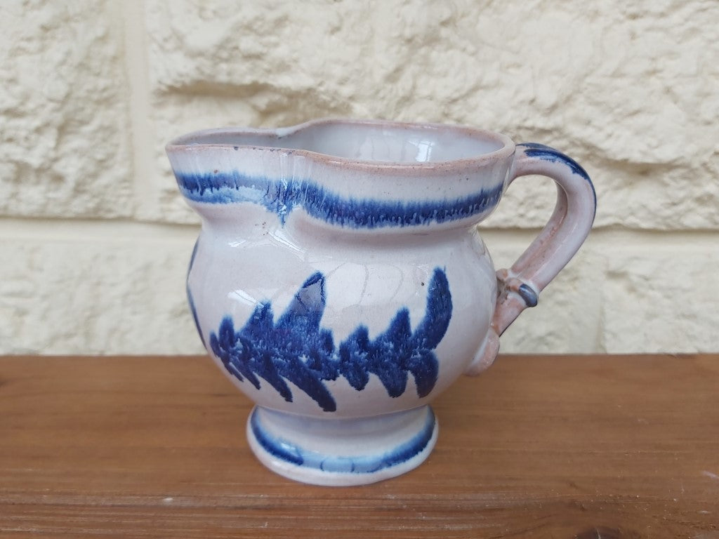 The Meister Blue and White Studio Pottery Jug is a charming addition to any home. With its beautiful blue and white floral design on terracotta, this piece is sure to catch the eye. Could be used as a beautiful cottagecore style vase! Crafted by the talented artist Meister, this jug is not only a stunning decoration but also a practical gift for any occasion. In excellent condition, no chips or cracks.