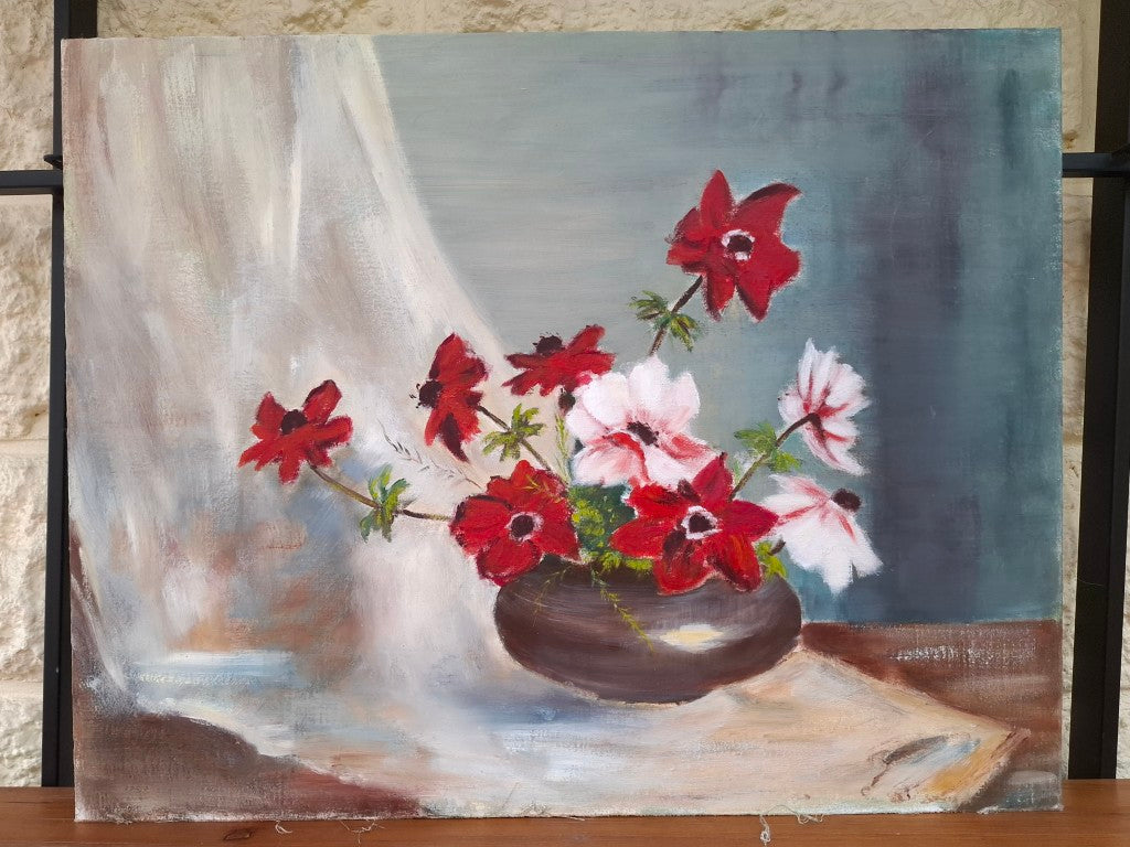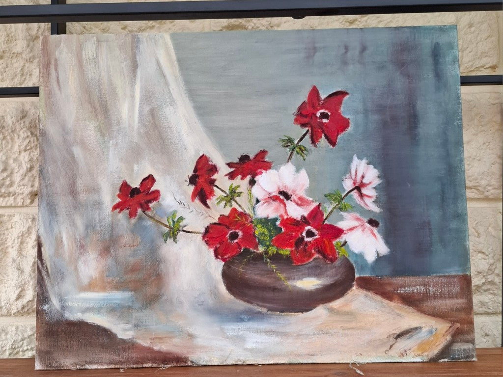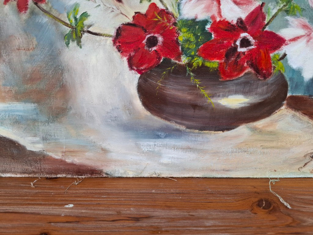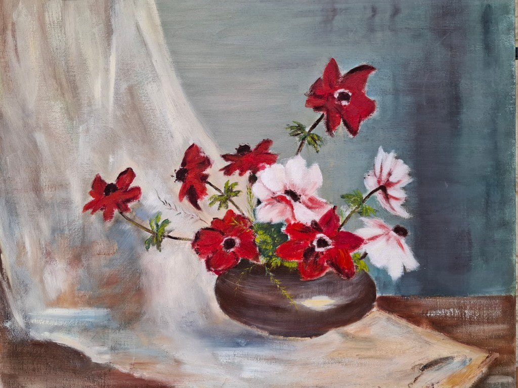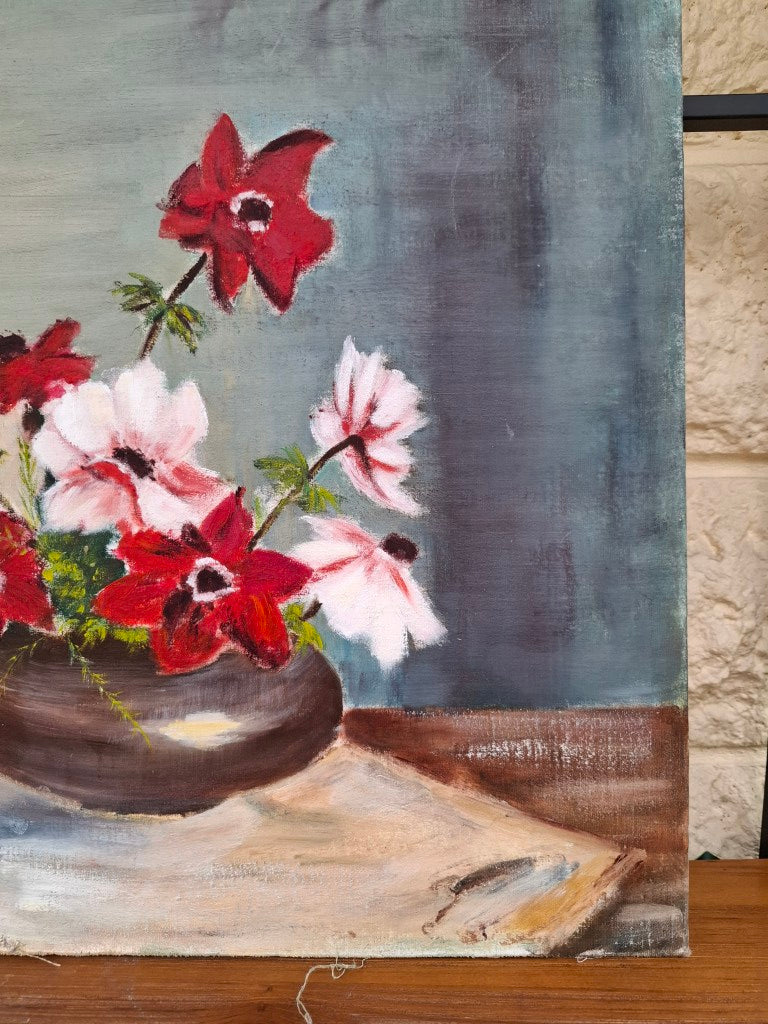 This Mid Century Style Painting of Poppies dazzles with bold colors and a fun, eye-catching composition. Painted on canvas glued over sturdy MDF, it is unframed ready for you to add your own flair.