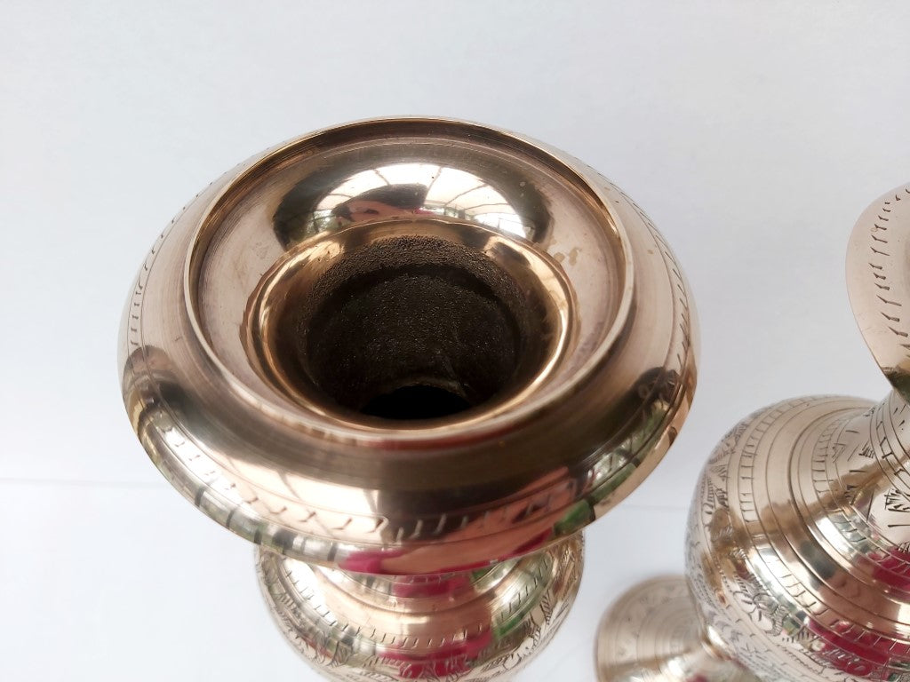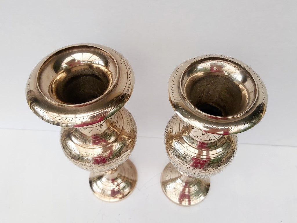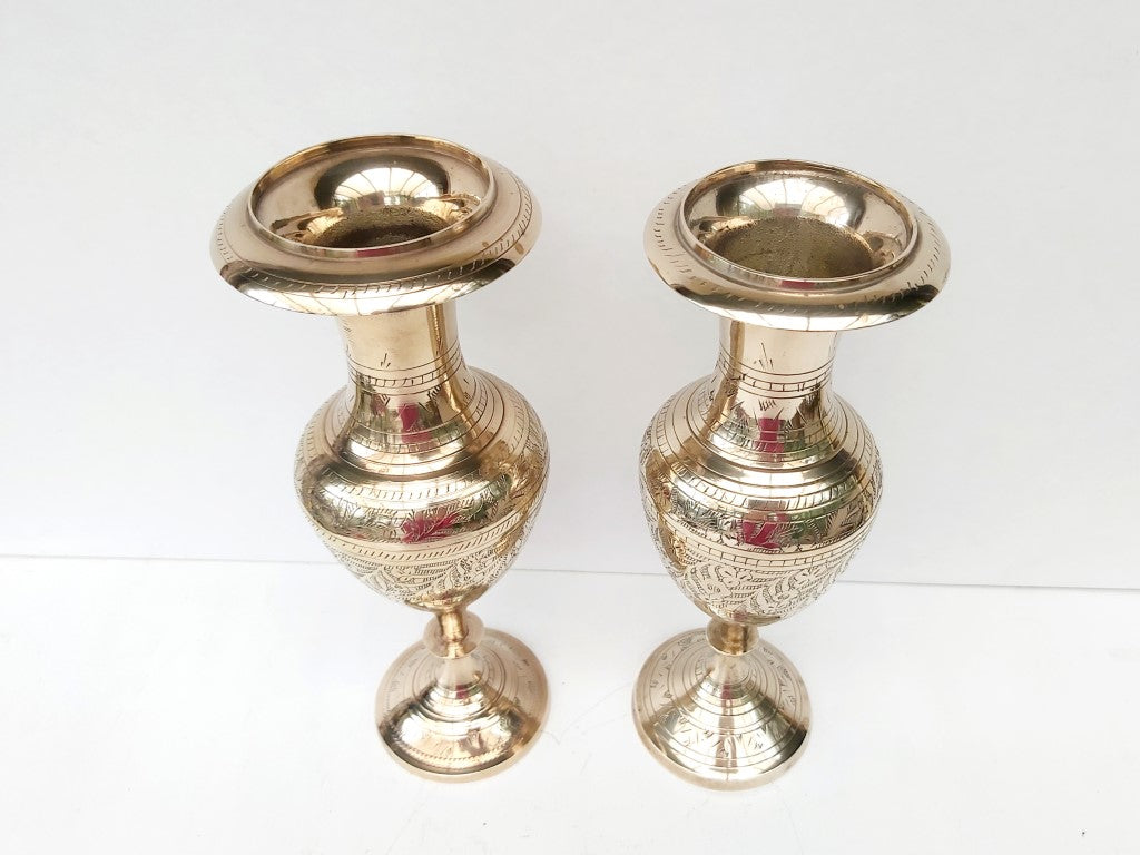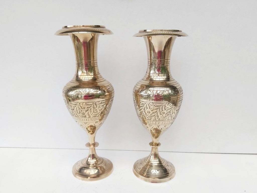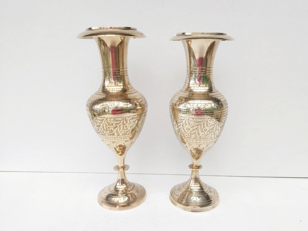 In great condition, this matching pair of brass vases are great for mantelpieces, dining tables, hall tables. The engraving on each vase is slightly different but the shape, size and product code labels are the same. I polished these vases a couple of weeks apart which shows in the colour a little but they will even out again. Price is for the pair. This pair qualify for free shipping!