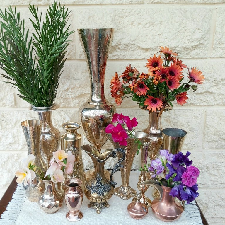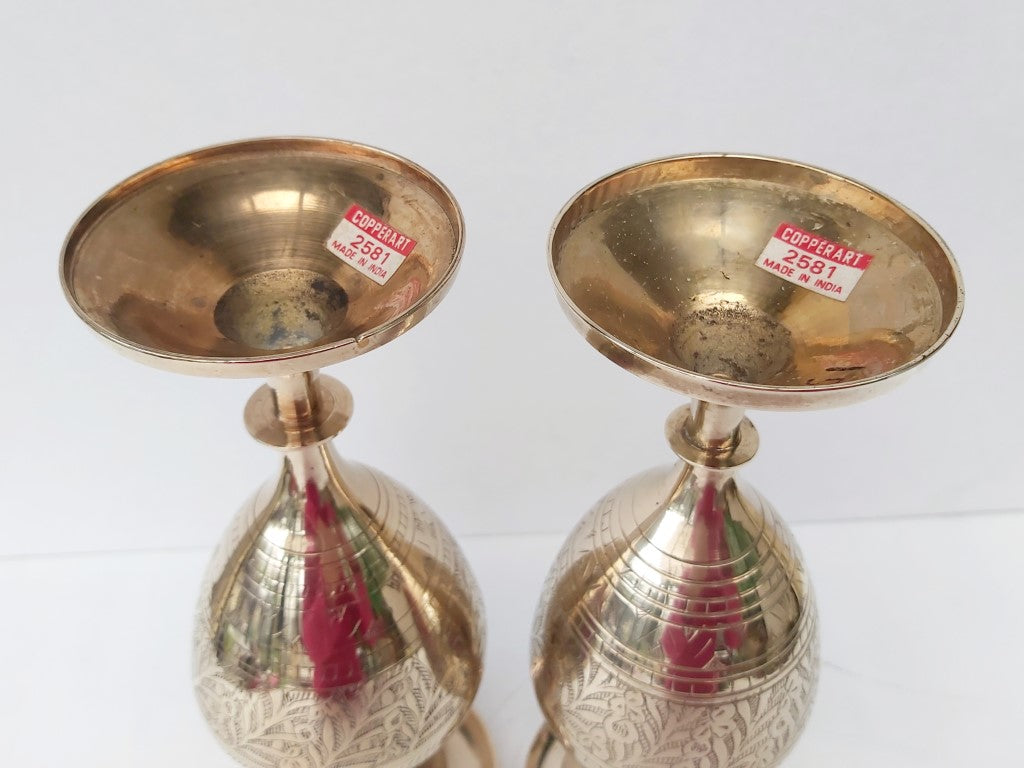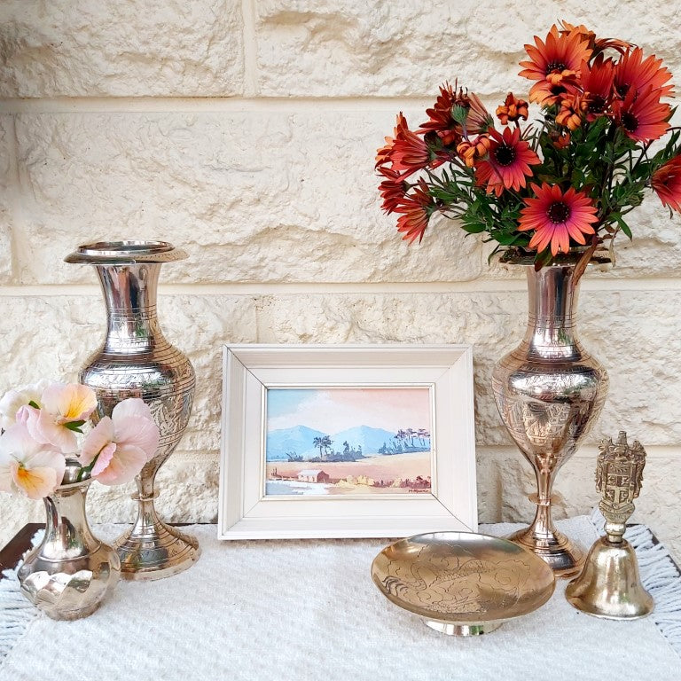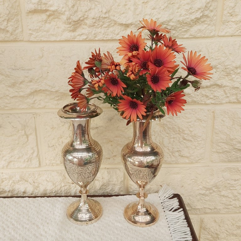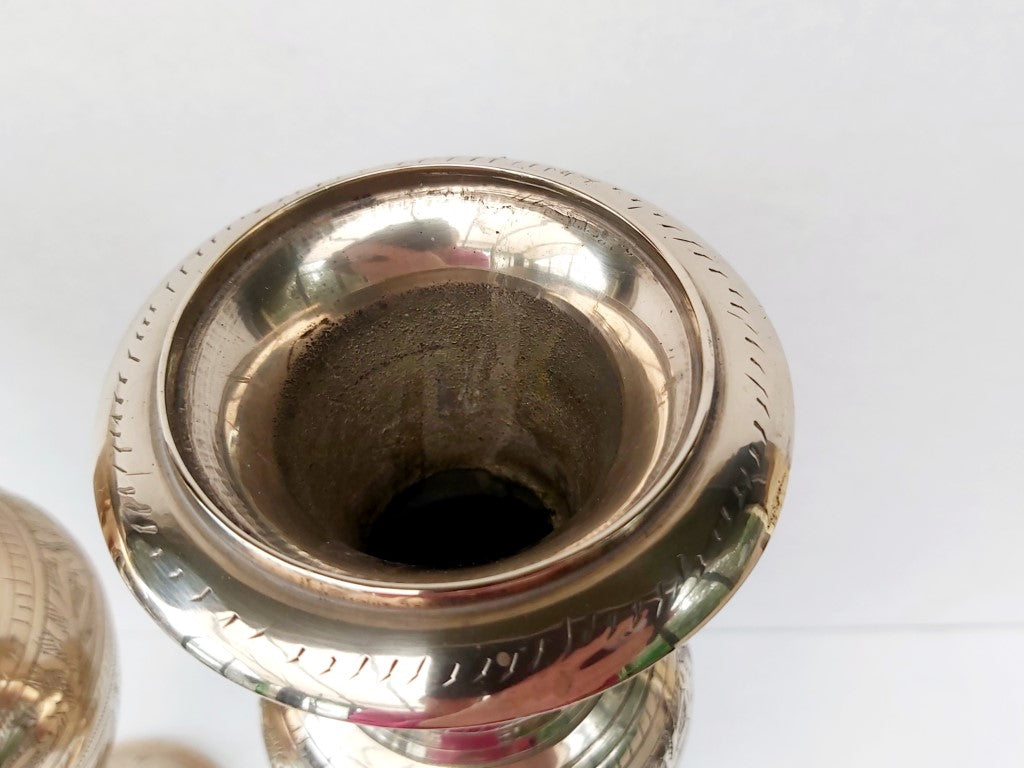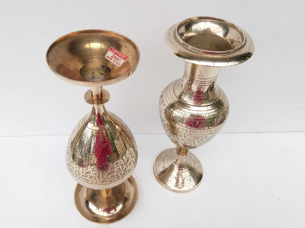 In great condition, this matching pair of brass vases are great for mantelpieces, dining tables, hall tables. The engraving on each vase is slightly different but the shape, size and product code labels are the same. I polished these vases a couple of weeks apart which shows in the colour a little but they will even out again. Price is for the pair. This pair qualify for free shipping!