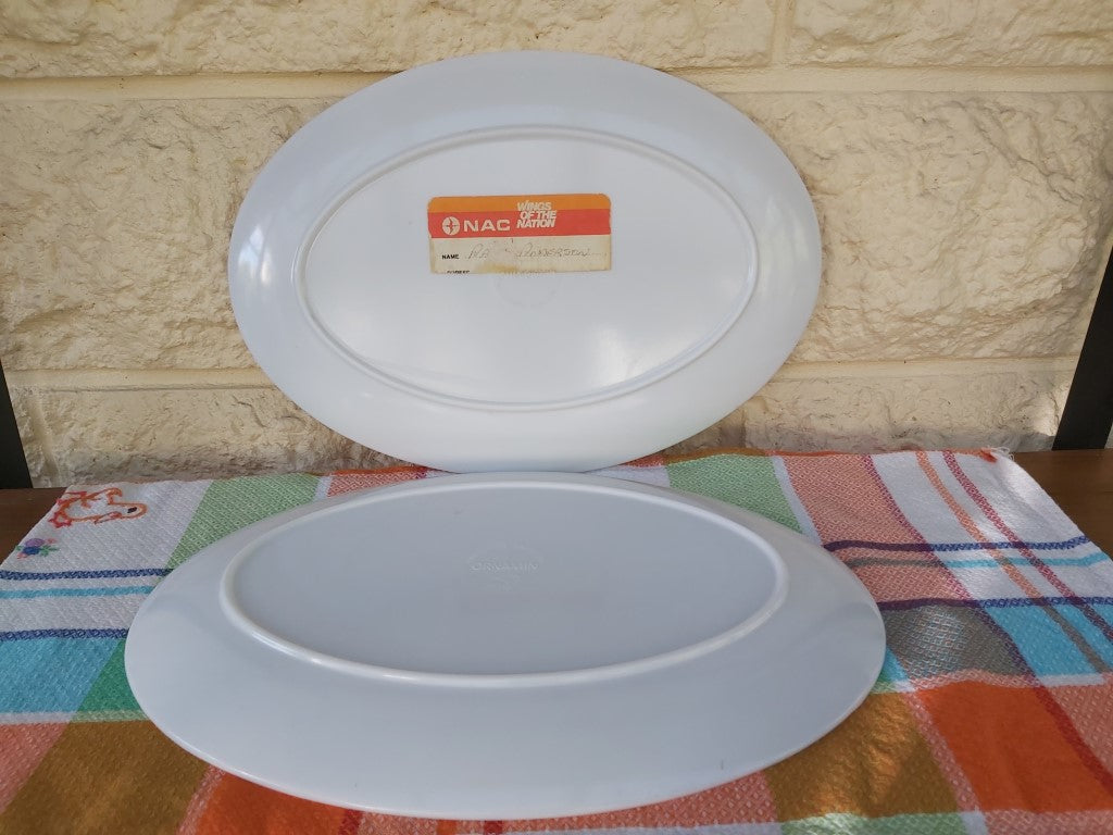 Turn up the heat with this pair of vintage oval BBQ themed Melamine plates! In good condition with a quirky NAC sticker on one plate. Perfect for picnics, camping, or caravanning. Spice up your outdoor dining in a fun and unique way.