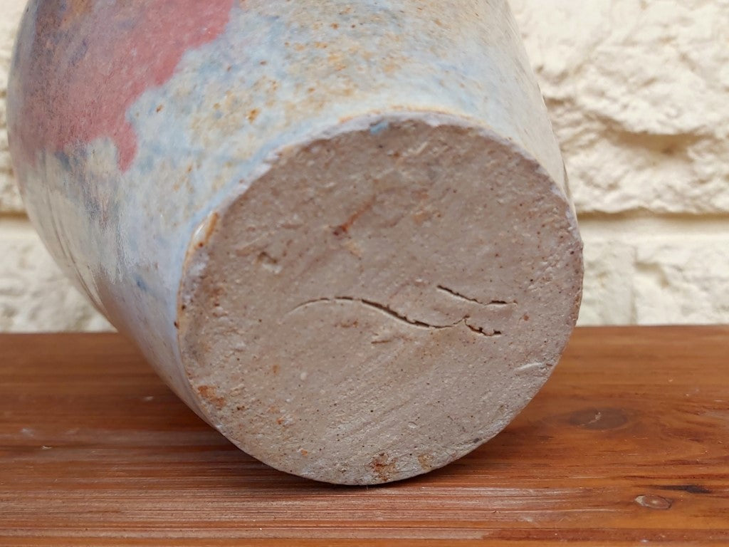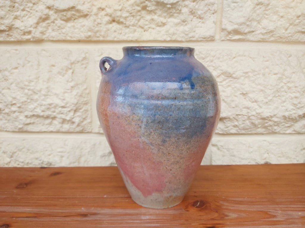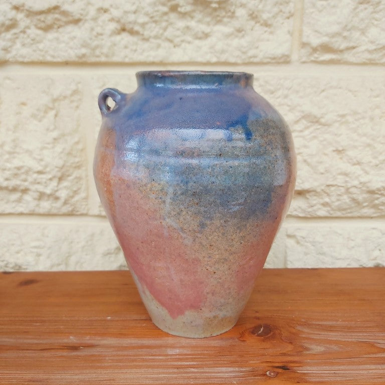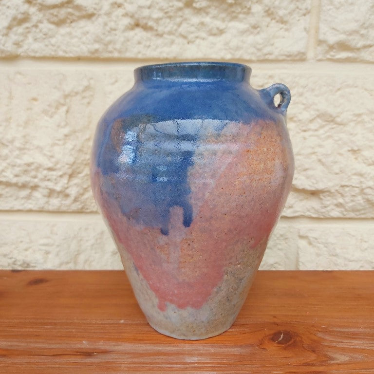 This pink & blue stoneware urn is a beautiful addition to any home. This studio pottery has a pink, blue & mauve drip glaze adds a unique touch. Signed by the artist, this vase is a one-of-a-kind piece that will add character to any room.