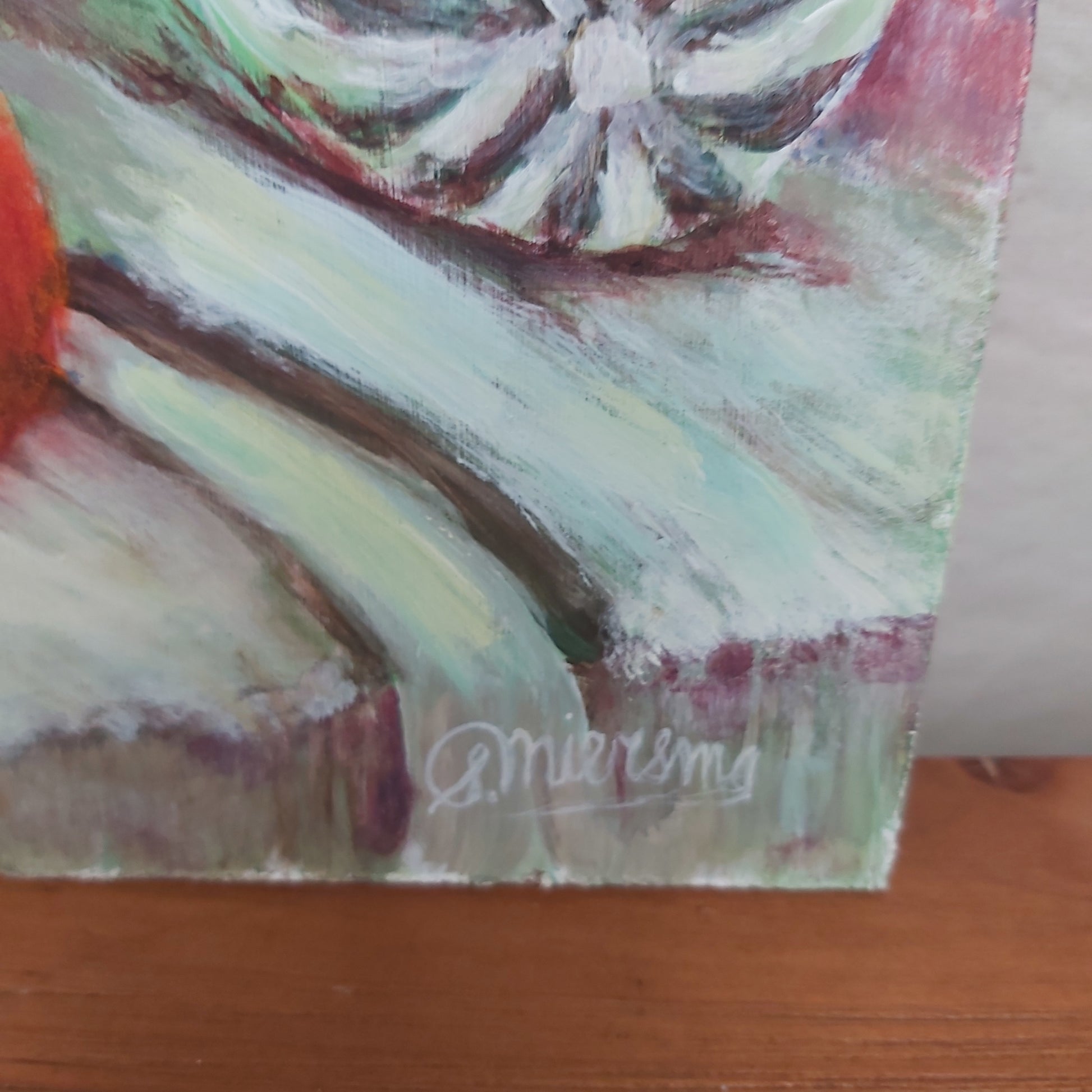 This is a version of the Still life project from the Alwyn Crawshaw Learn to Paint with Acrylic Colours 1979 book. Its colours a beautiful, dreamy and soft with little pops from the tomato and lemon. Would be a lovely addition to a gallery wall! It is signed S Miersma but I was unable to find any information on the painter.