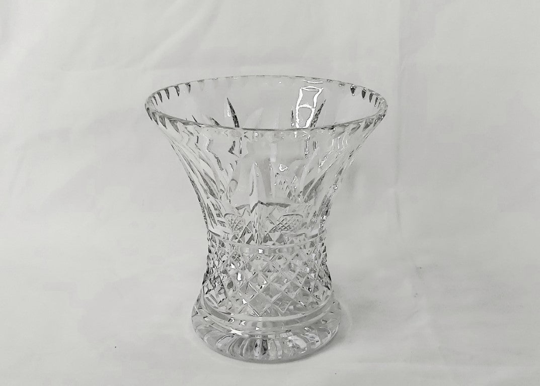 Harbridge Crystal makers closed down in the late 1950's and I have managed to find 2 ads that show the same pattern as this vase, one from 1958 and the other from the late 40's. Harbridge had a distinct v shape to the cuts in the rim, unlike most other makers who used a more U shape. This piece is in excellent condition for its age, with a couple of very discreet rust spots (maybe from a flower frog?) and light scratching on the base. Unfortunately there is no makers mark on this piece, however, after about 2 hours of research I am confident that they were the only ones to use this design of a circle with 3 leaves out the top. There are no chips or cracks and its still got its glorious shine!