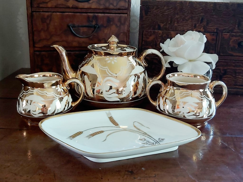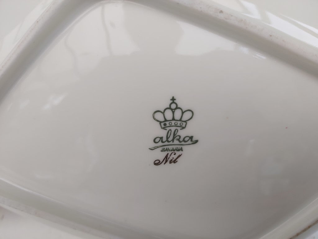 This mid-century modern Alka Bavaria dish features a unique diamond shape and an elegant wheat-and-clover motif in metallic gold. Framed by a gleaming gold rim, this piece exudes timeless sophistication, perfect for display or serving small treats. Made in Bavaria, Germany, it reflects the exquisite craftsmanship associated with Alka ceramics. In excellent condition with no chips or cracks. Would make a great gift with a pile of ferrero rocher!