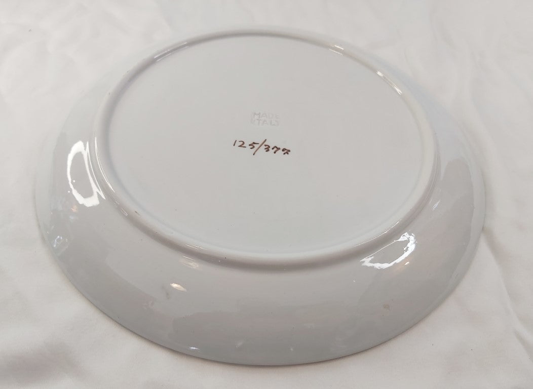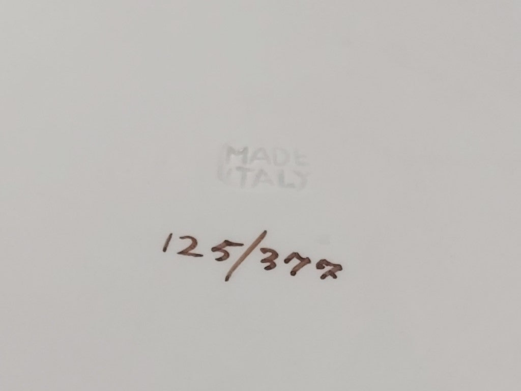 This stunning platter would make an incredible cake plate for special events like a birthday or wedding. It has an amazing vintage vibe while still being in excellent condition. It is stamped Made Italy and is numbered 125/377. There is just a minor imperfection in the glaze near the rim.