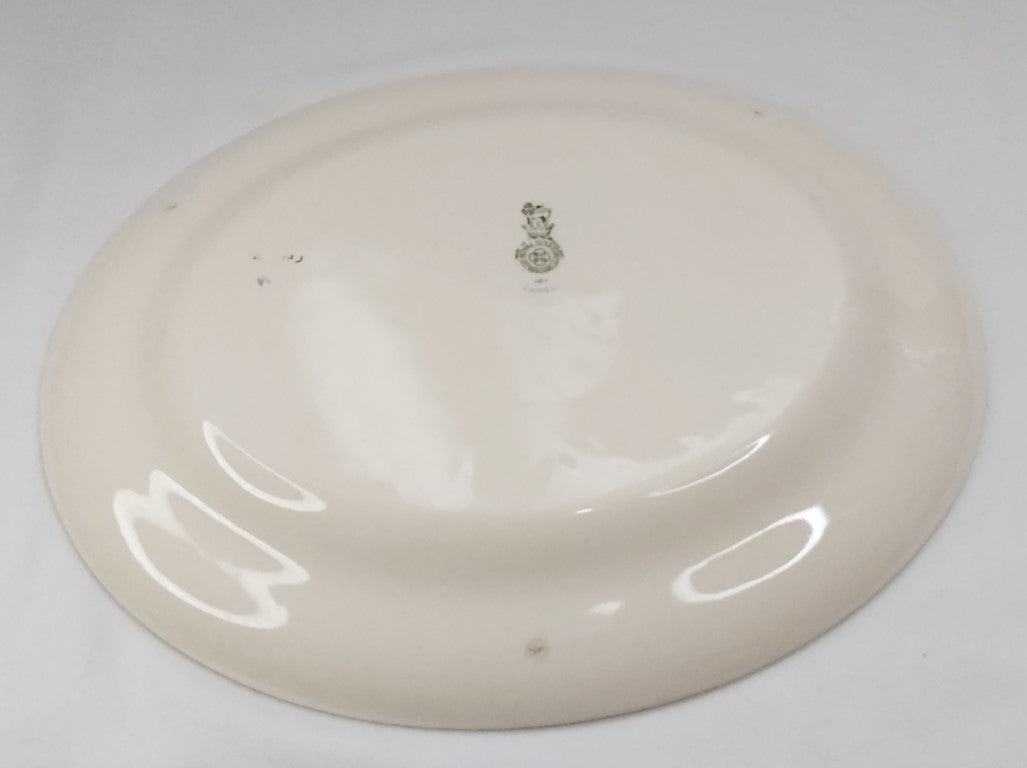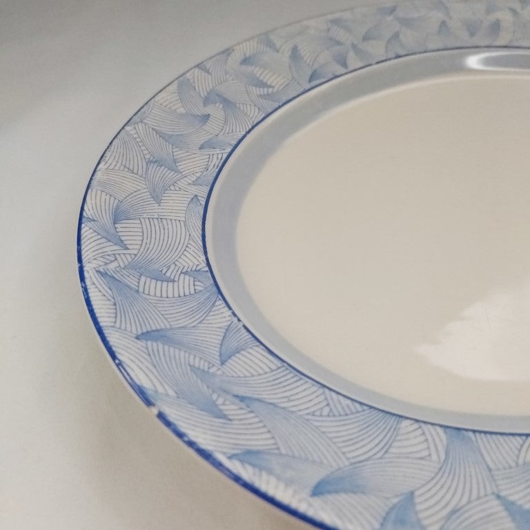 Expertly crafted in the art deco style, the Royal Doulton Envoy Oval Platter is an exquisite antique piece from the 1920s - 1930s. With no chips or cracks, this platter showcases its age in stunning condition. You can see the 3 kiln firing stilts marks on the outside. The blue accents show only minor wear, adding to the charm of this vintage piece.