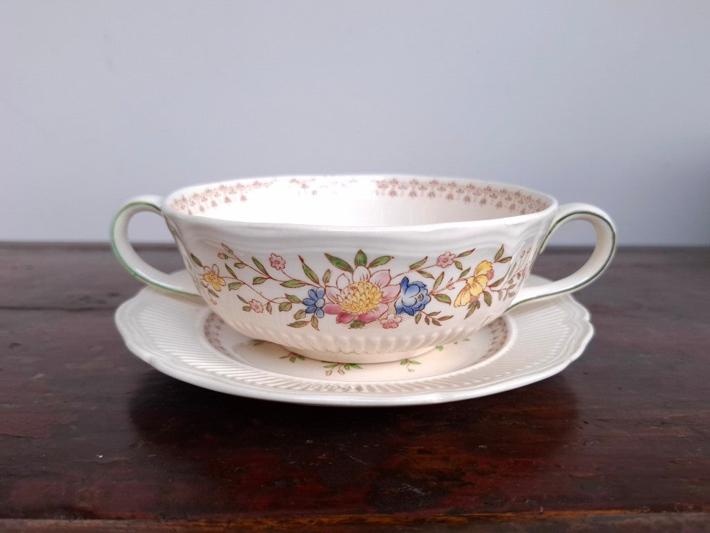This 1930s Royal Doulton Medford cream soup bowl and side plate set is a fine example of English porcelain craftsmanship. Nearly antique and in excellent condition, it shows no chips or cracks, making it a beautiful addition to any collection or table setting.
