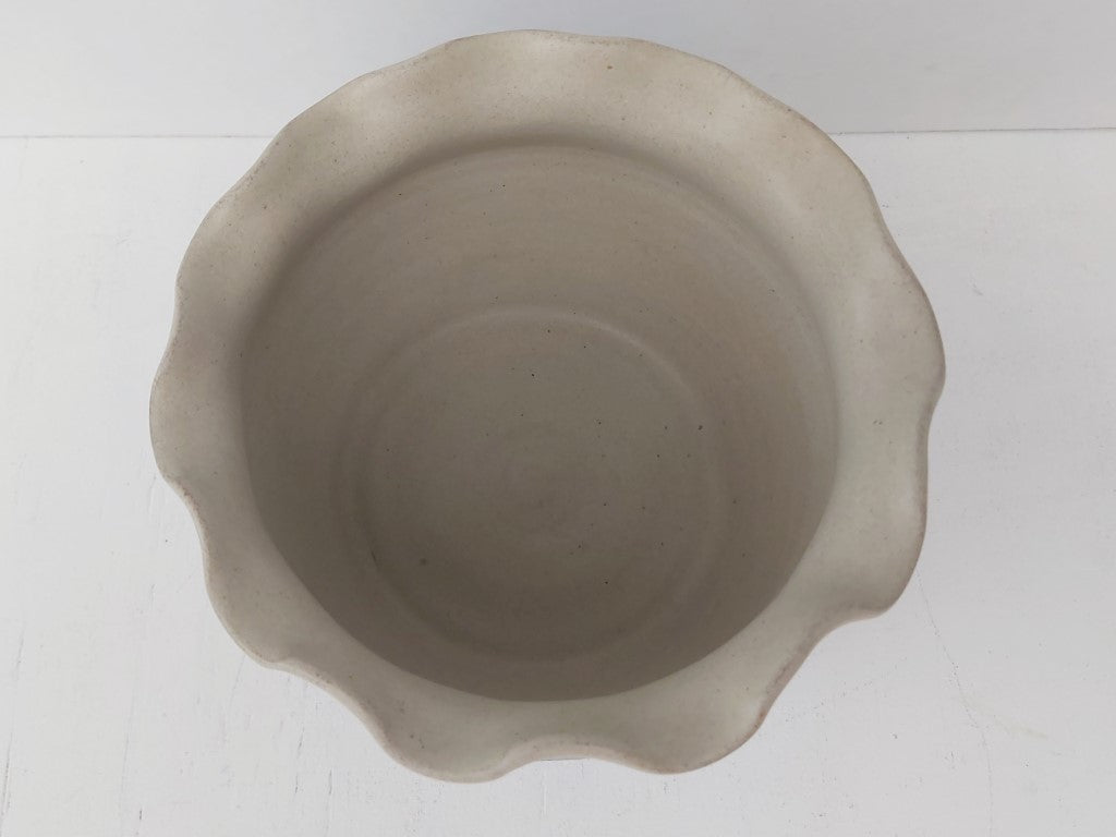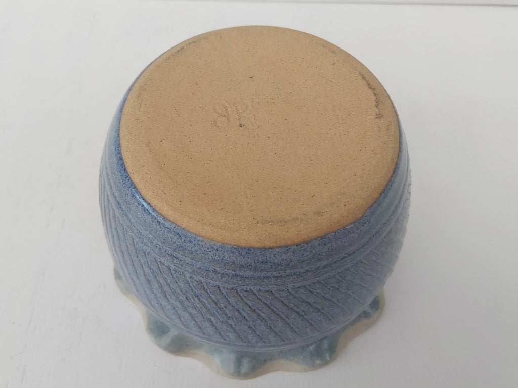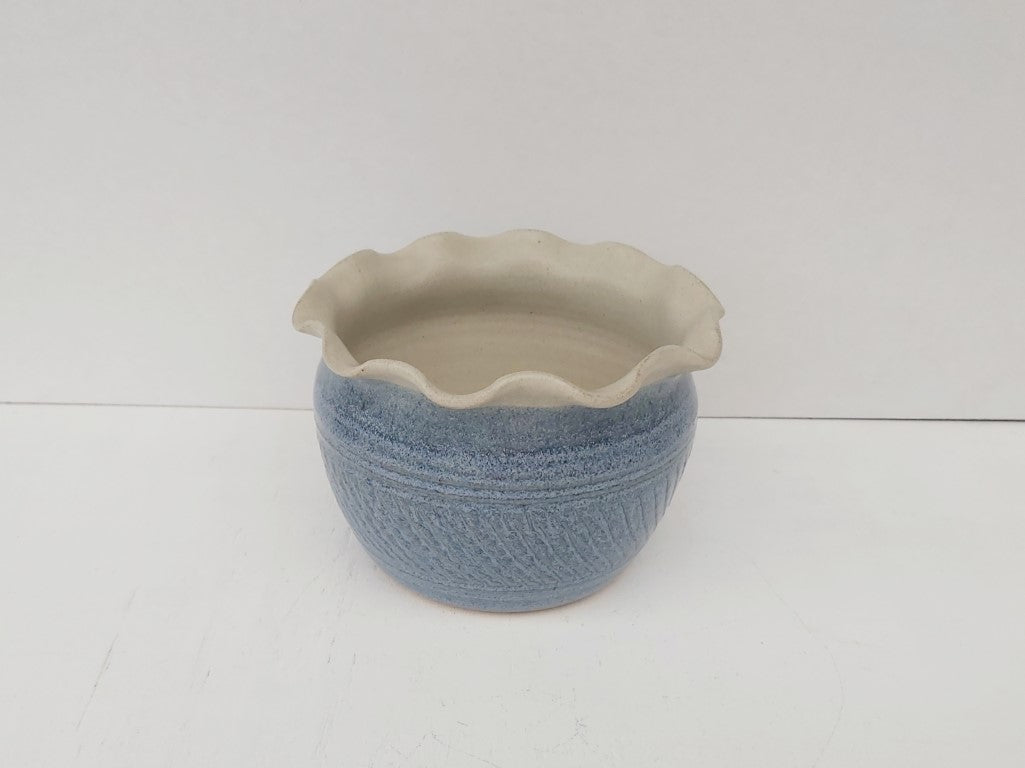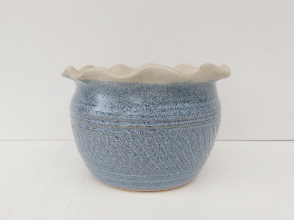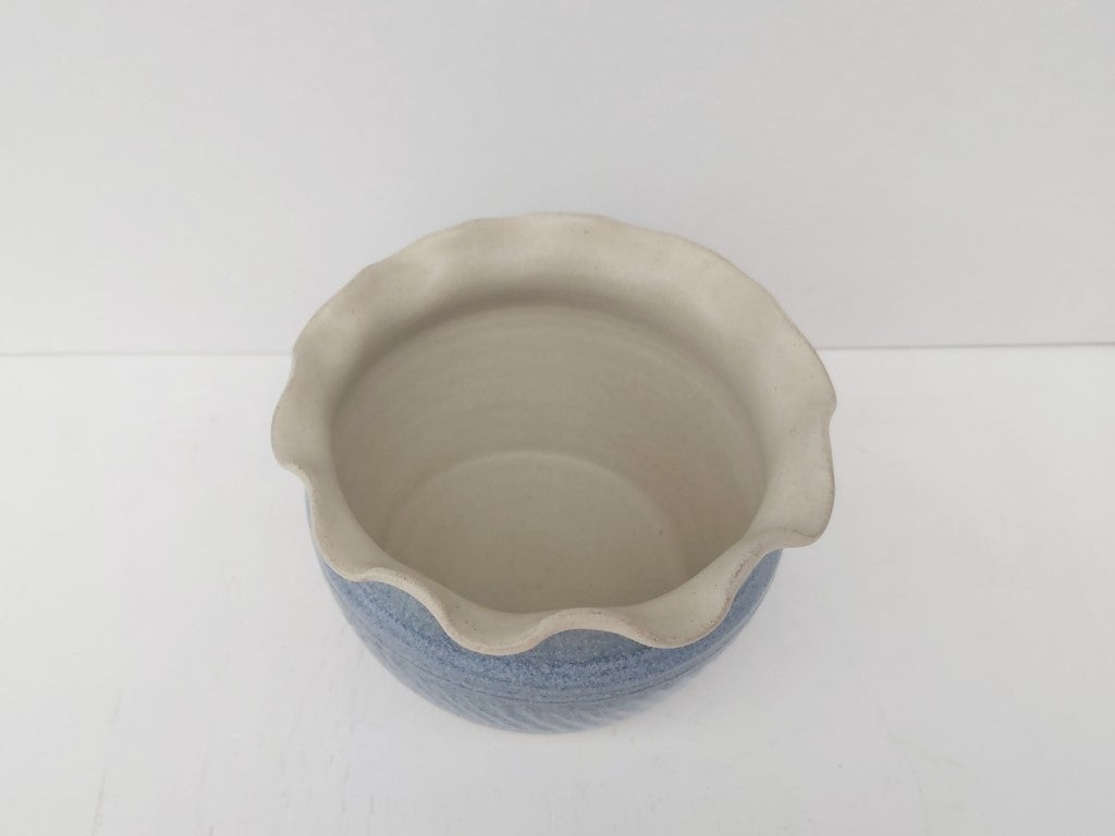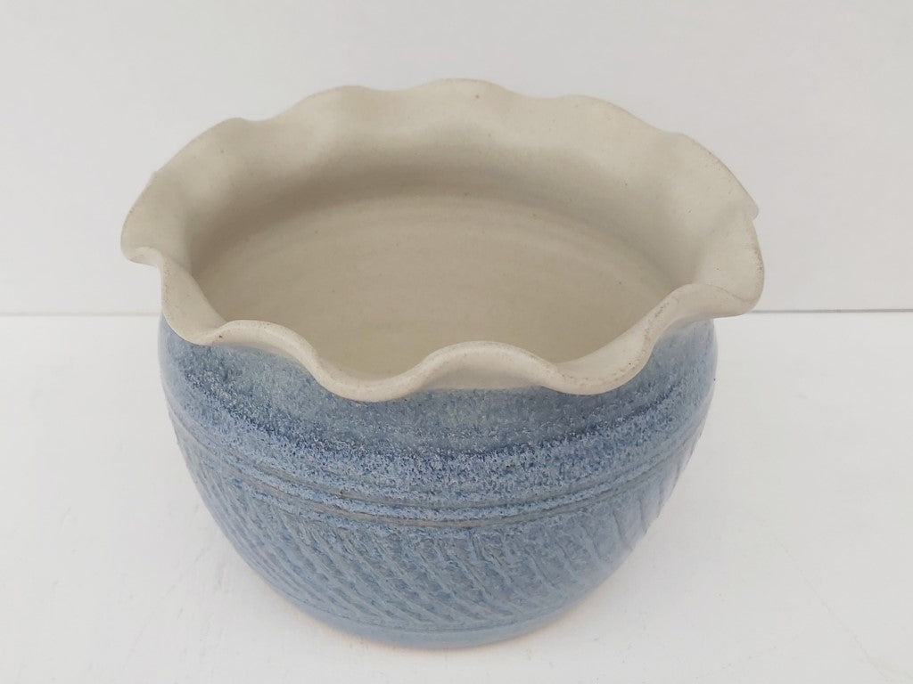Elevate your plant game with our Ruffled Rim Blue Studio Pottery Planter. Crafted from durable stoneware, this pretty cottage core planter features a unique ruffled rim and is marked "JR" on the base. Perfect for any plant lover, it also makes a great gift. Add a touch of charm to your space today! In excellent condition.