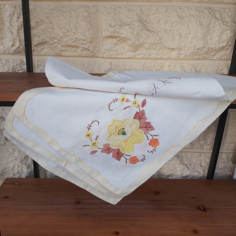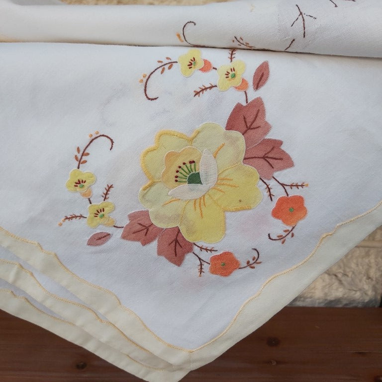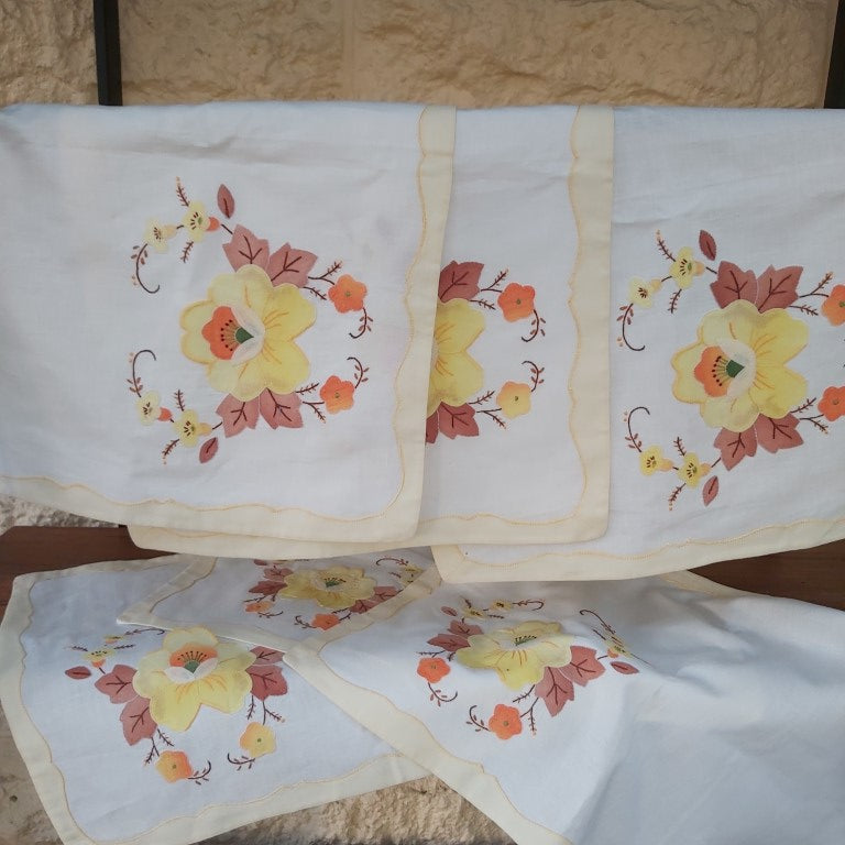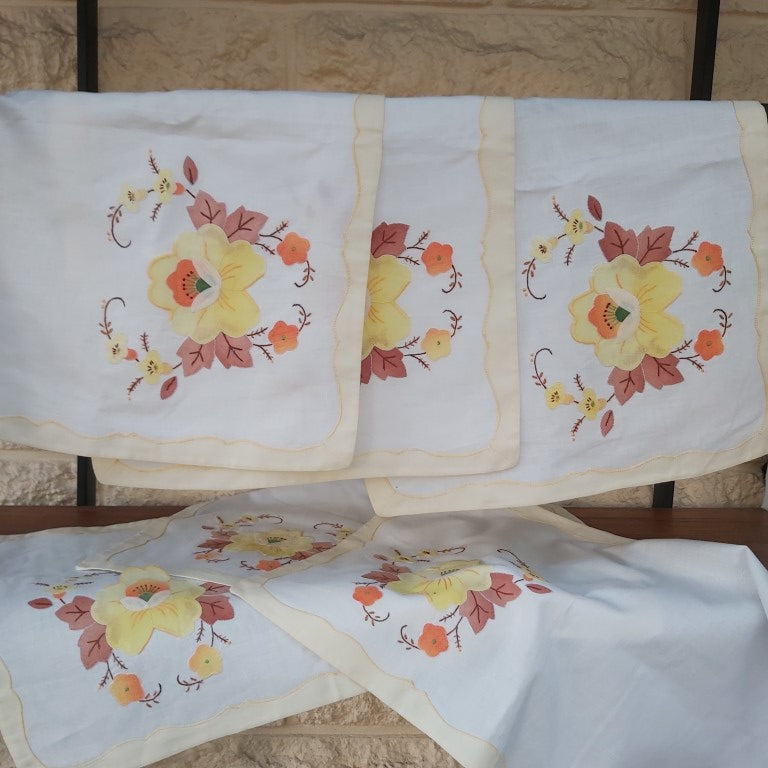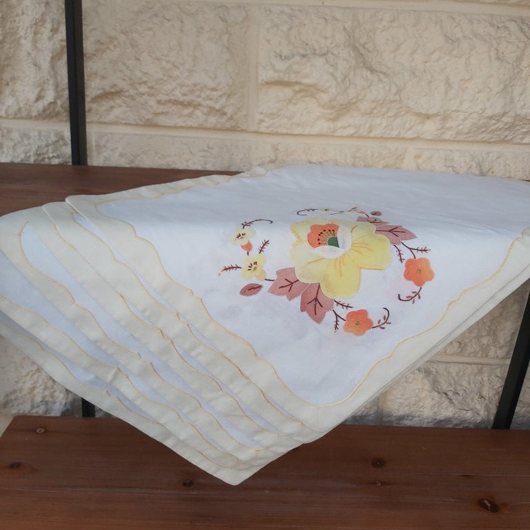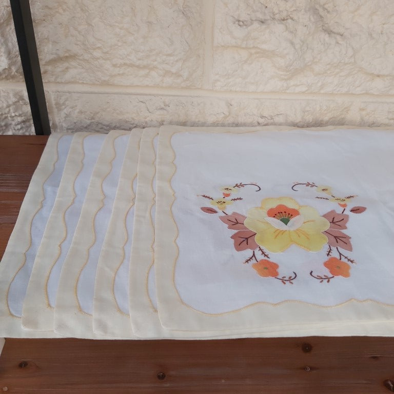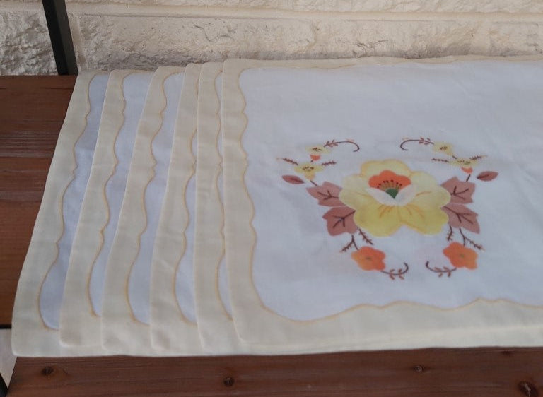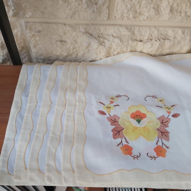 Update your table setting with this set of hand-stitched floral yellow placemats. Made with cutlery pockets, these placemats are not only beautiful but also practical. You can also repurpose them for different projects such as a quilt, bag, or as decorations on clothes. Versatile, quirky, and in great condition.