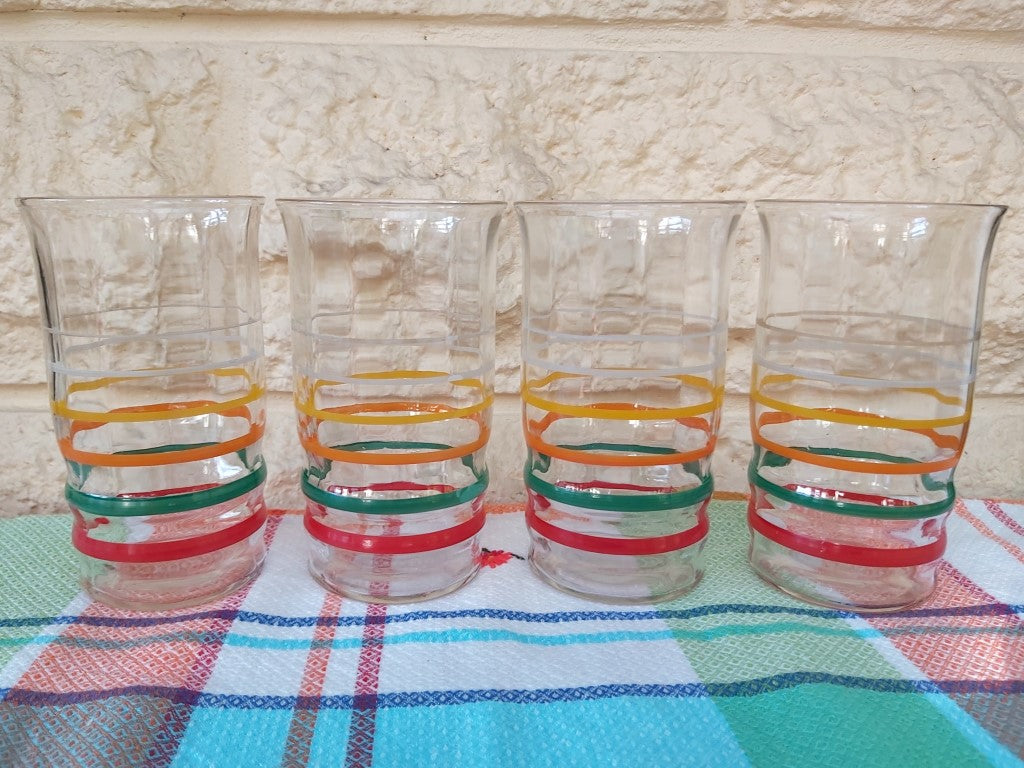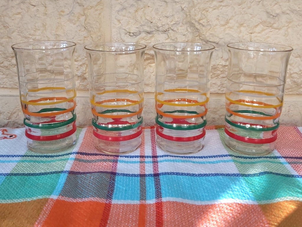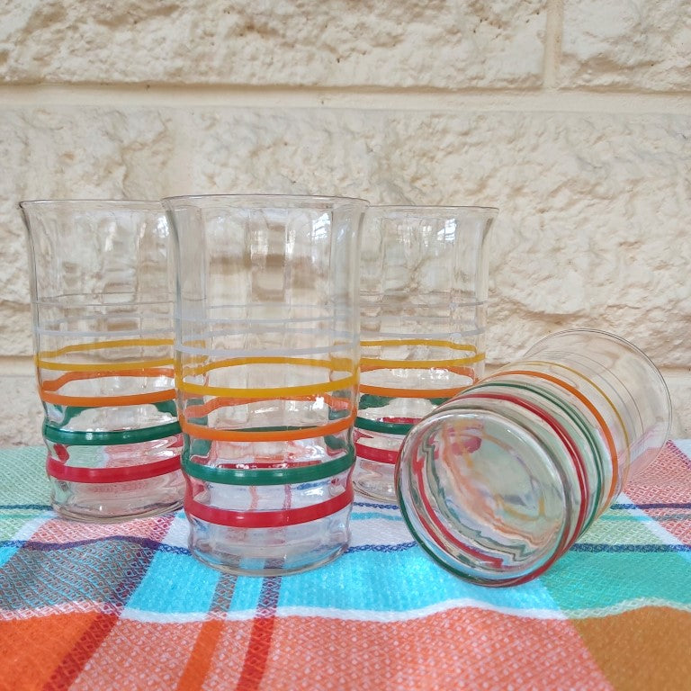 Spice up your kitchen with this set of vintage drinking glasses! These striped glasses are not just easy on the eyes, but also in great condition with minimal wear. From research I believe these to be either Fiesta ware or Anchor Hocking. Perfect for adding a touch of retro charm to your next dinner party. Cheers!
