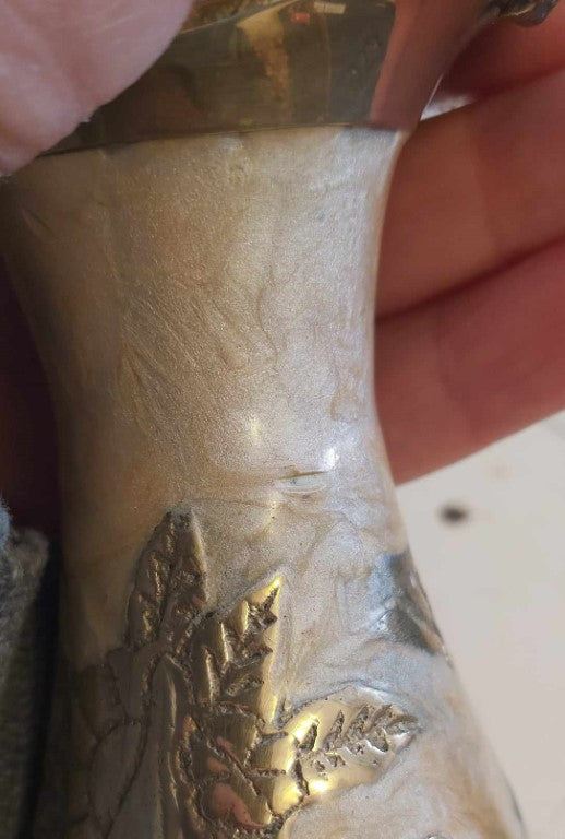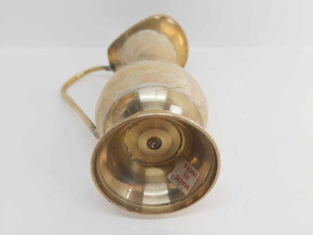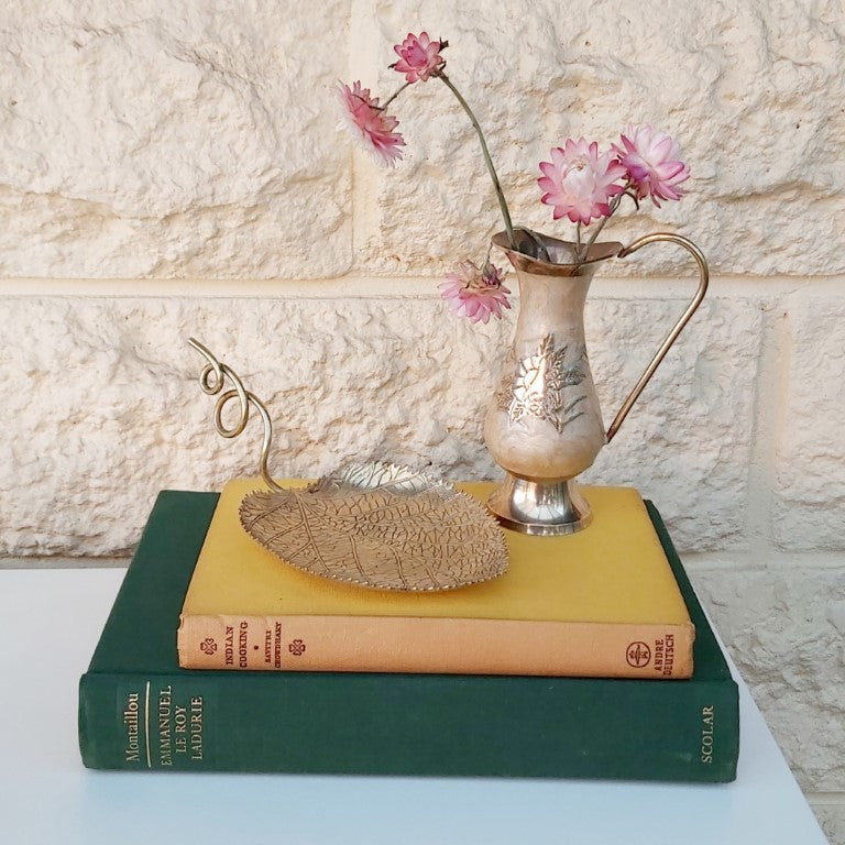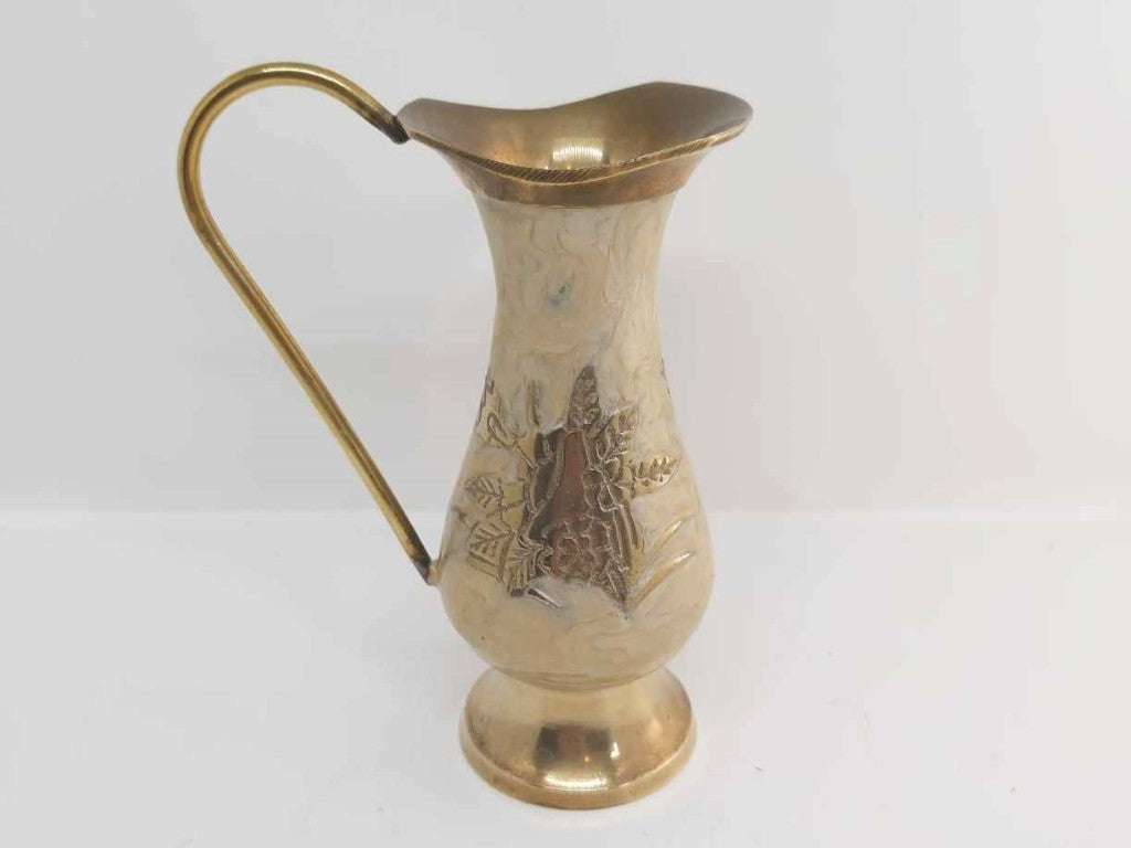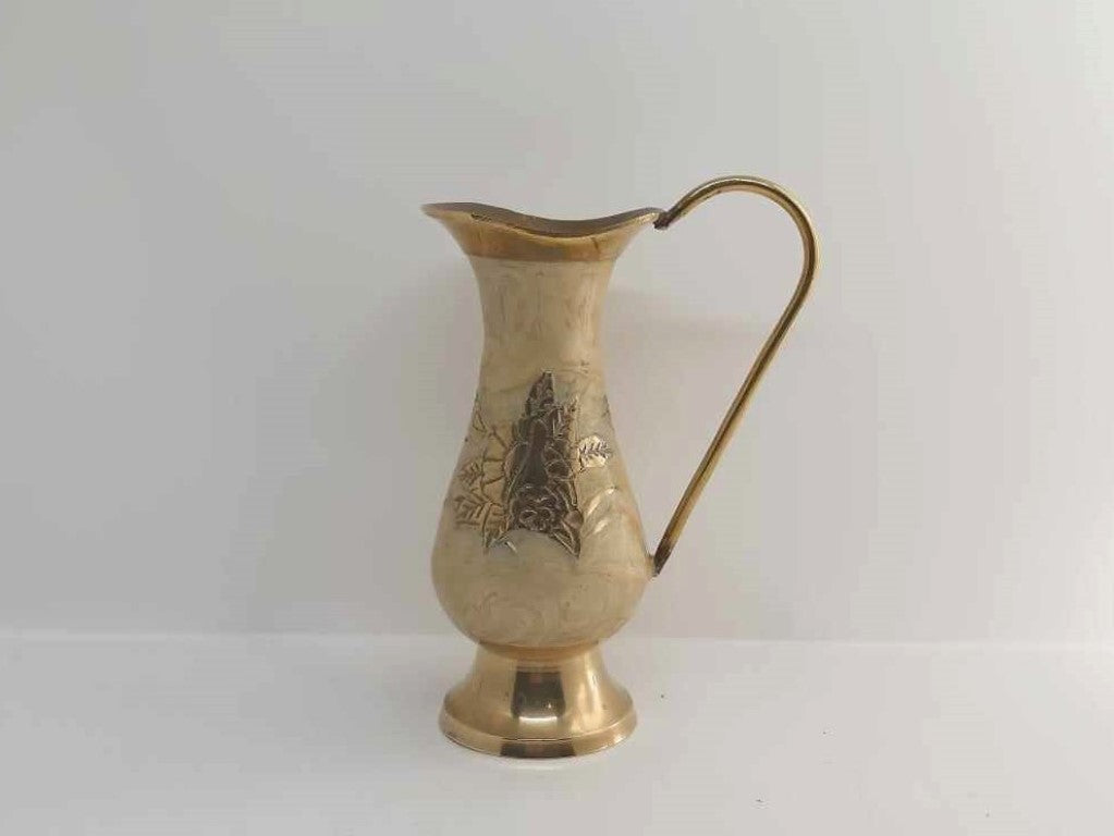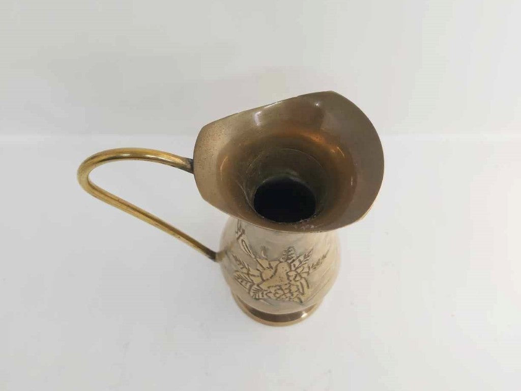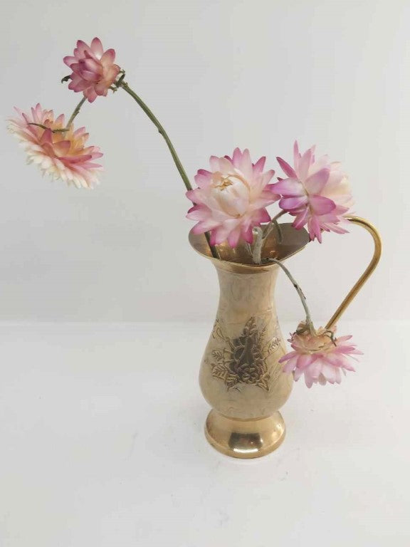 This unusual and somewhat rare brass pitcher with pearlised enamel and floral design was made in India. Cute size for a small posy, or even a single stem. In good preloved condition with one very small mark on the enamel and some minor wear and patina.