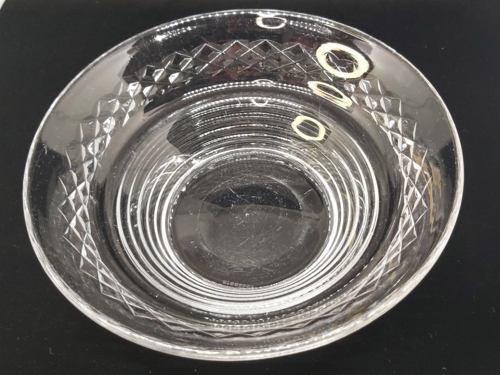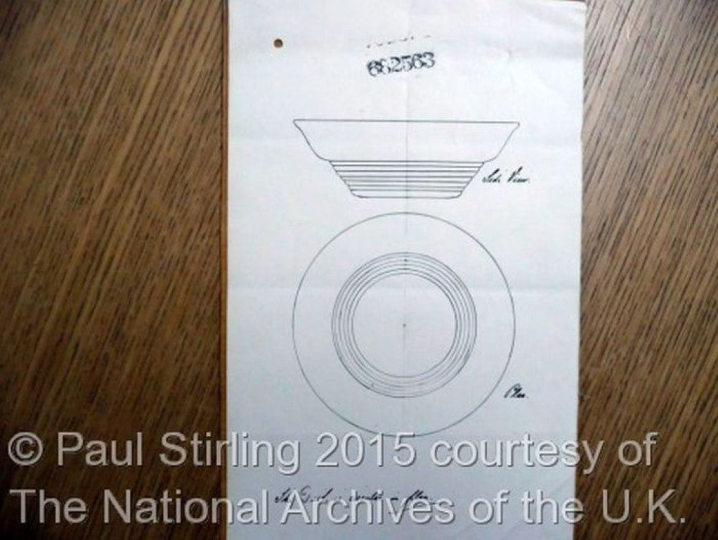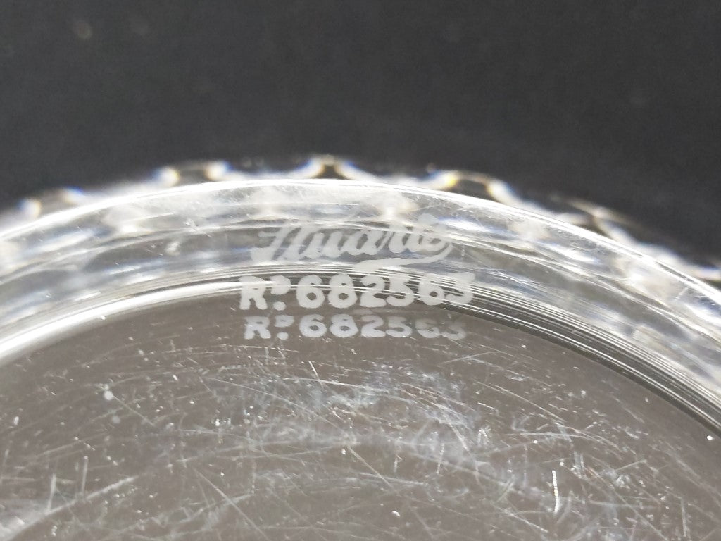 This beautiful Stuart crystal bowl is marked with Stuarts RD682563. This pattern number is for the Stratford Rings and it was produced in 1921 (see photo). I think it has the Beau design on the belly with Stratford Rings base, but despite an extensive search online (yes I went down a very deep rabbit hole) I couldn't find another one like it! It is in excellent condition with only a very small amount of very light scratching.