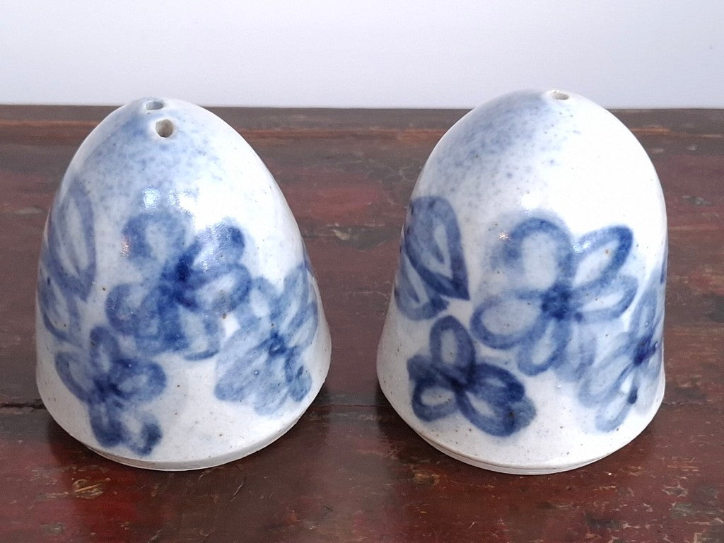 From New Zealand potter, Sue Monk, these salt and pepper shakers are in excellent condition, complete with original corks. Featuring a beautiful salt glaze floral design, they add a classic touch to any kitchen.