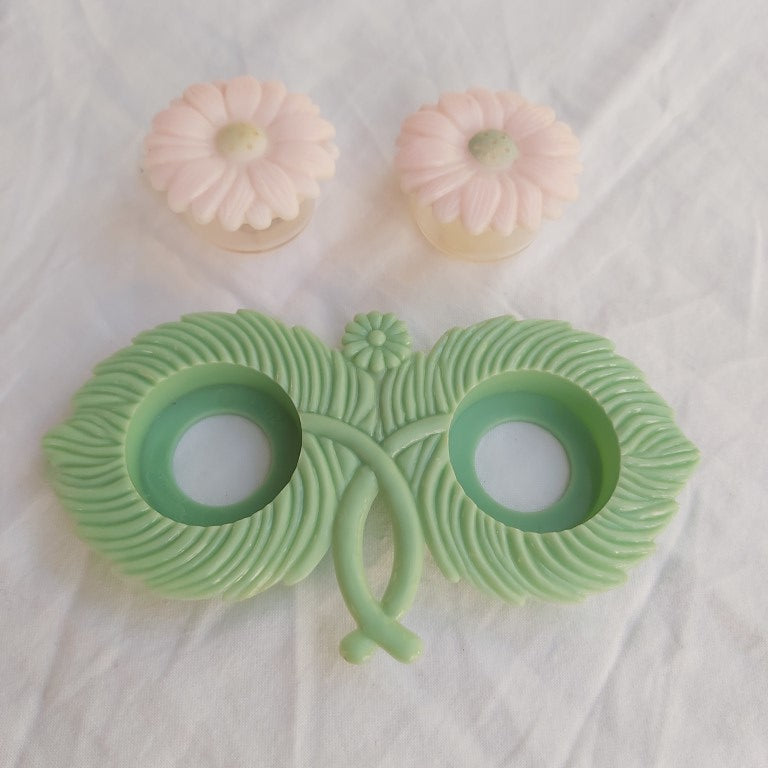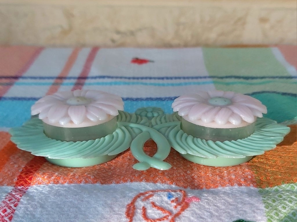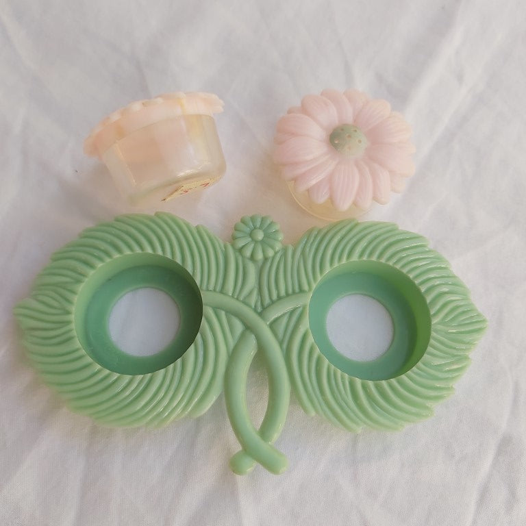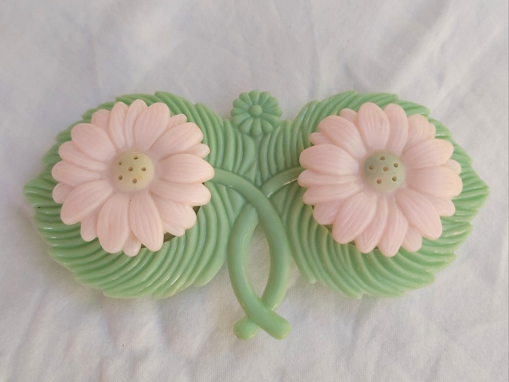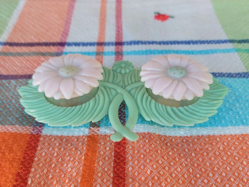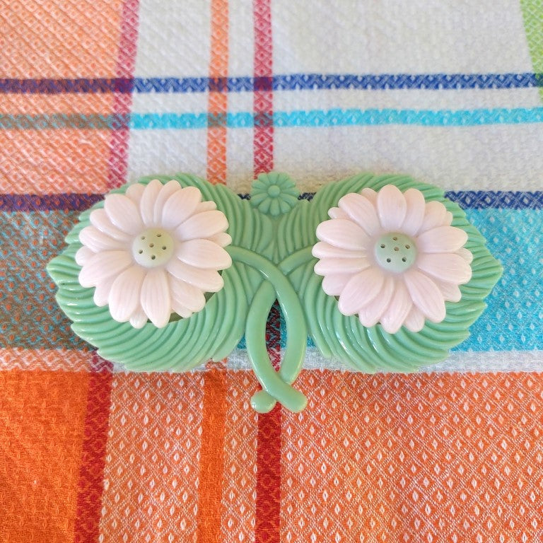 The must-have caravan and picnic essential: Vintage Daisy Salt & Pepper Travel Shakers! Made from lightweight plastic, these pretty shakers are perfect for seasoning on the go. Possibly from Jay Don in the 1950's, a darling (and practical) addition to any outdoor adventure. In excellent condition.