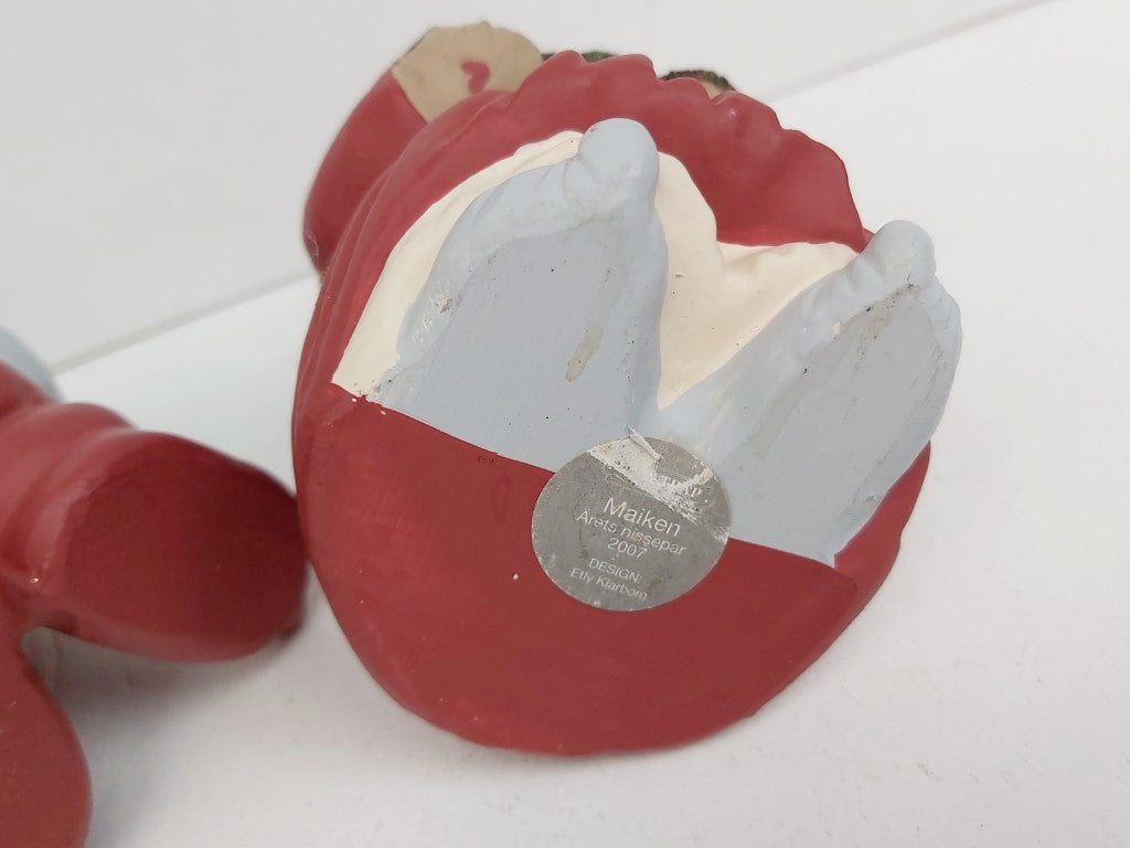 Decorate your home for the holidays with these Trip Trap Maiken and Marcus Christmas Pixie Figurines. These adorable Scandinavian figurines add a touch of whimsy to any space and are sure to bring a smile to everyone's face. Enjoy the festive spirit with these playful and unique decorations. They are from the 2007 collection and are in excellent condition with no chips or cracks. Price is for the pair.