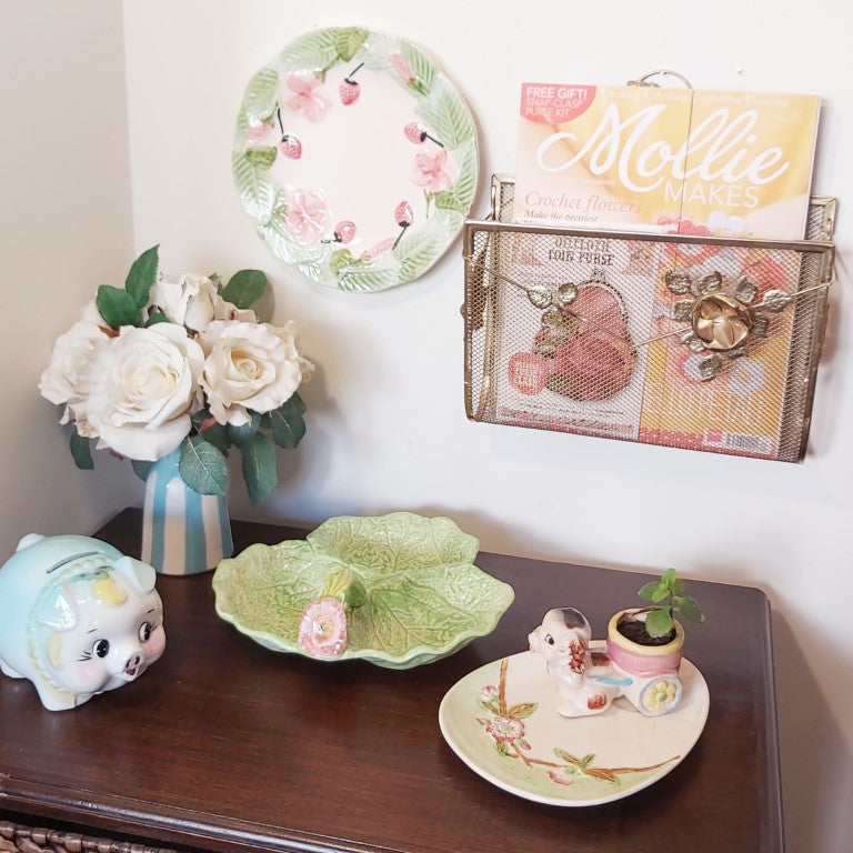 What a cutey! This kitsch happy wee piggy bank makes great decor and can be used for its original purpose if you are able to find a cork or plug or duct tape to close the hole at the bottom. In great vintage condition with a little crazing and a tiny hairline crack near the coin slot (see photo).