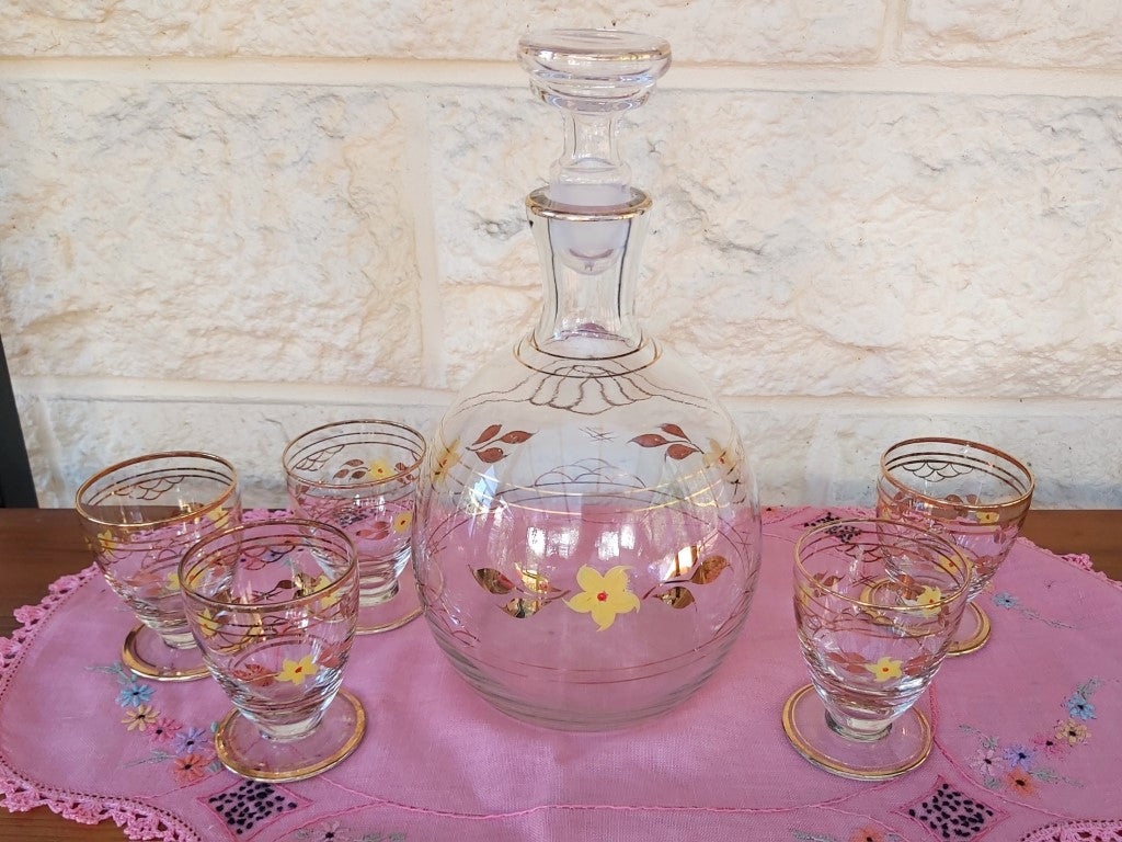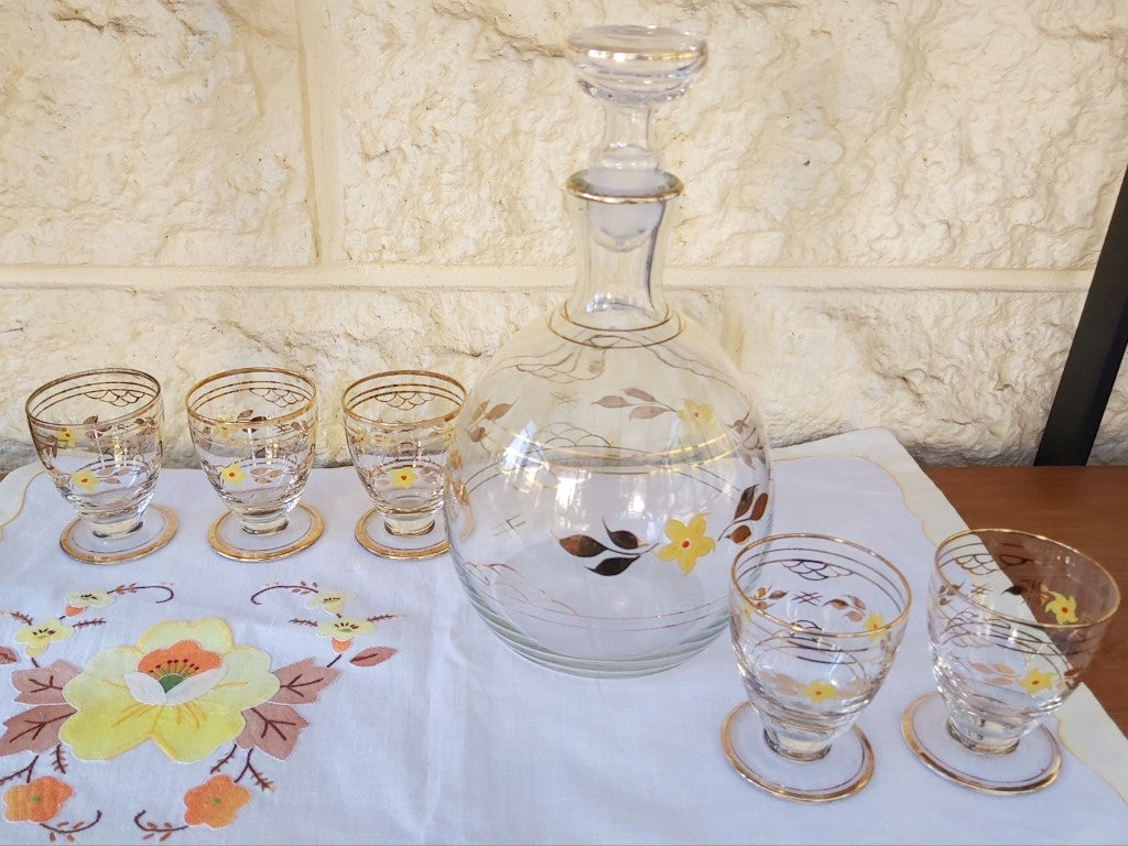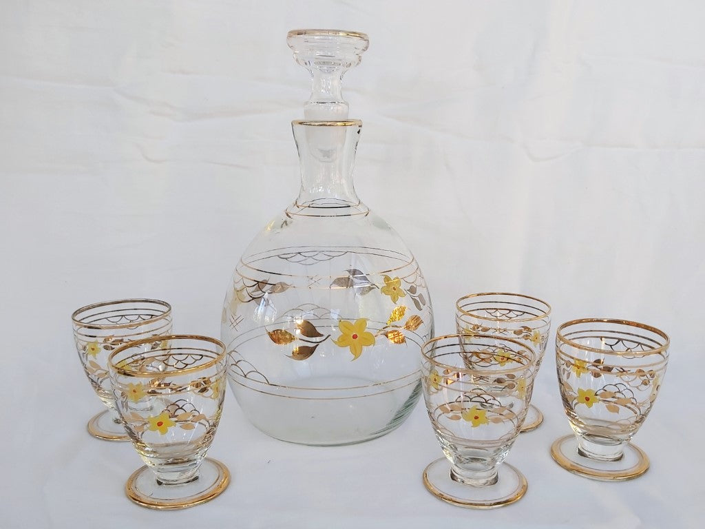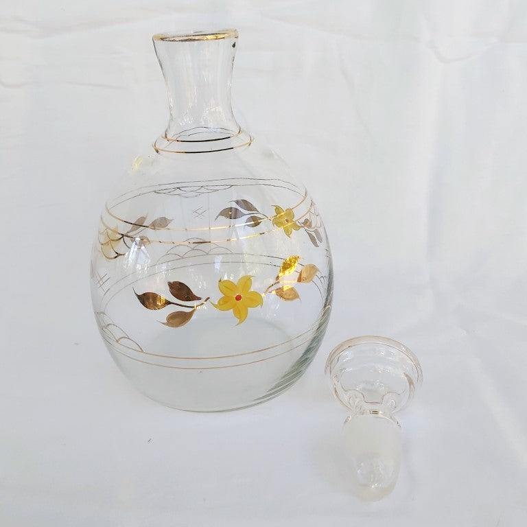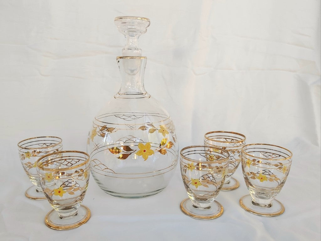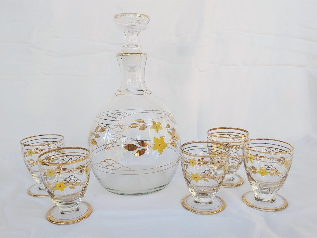 Beautiful vintage glass decanter and glasses, hand painted with a delicate yellow flower and gold pattern. Comes with a decanter with stopper and 5 glasses. In great vintage condition with just a few surface scratches.
