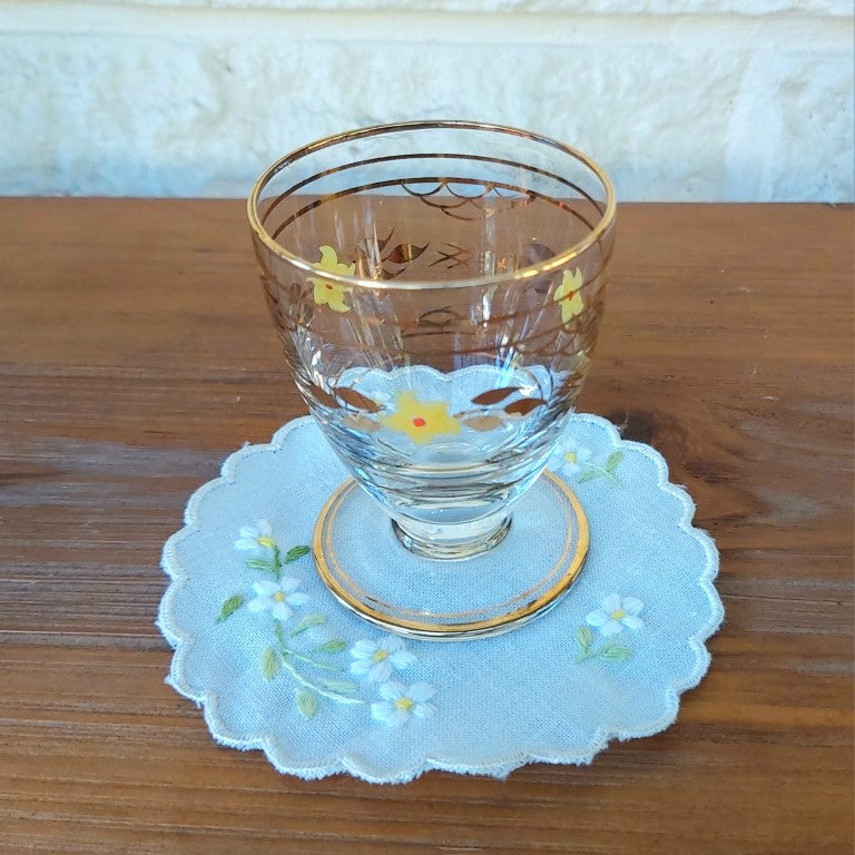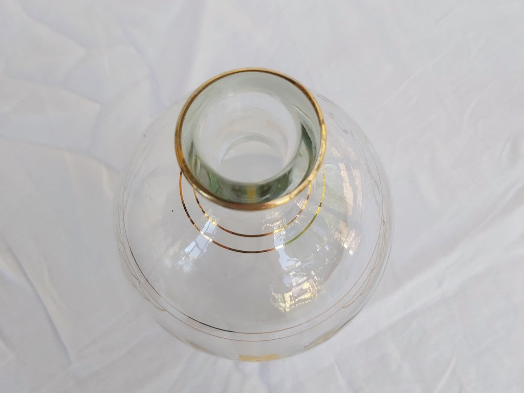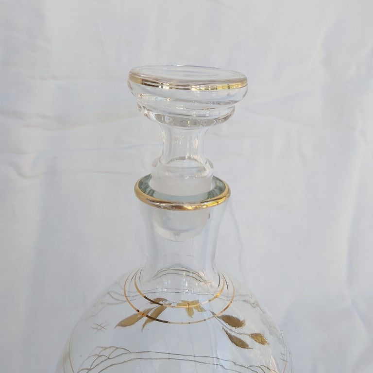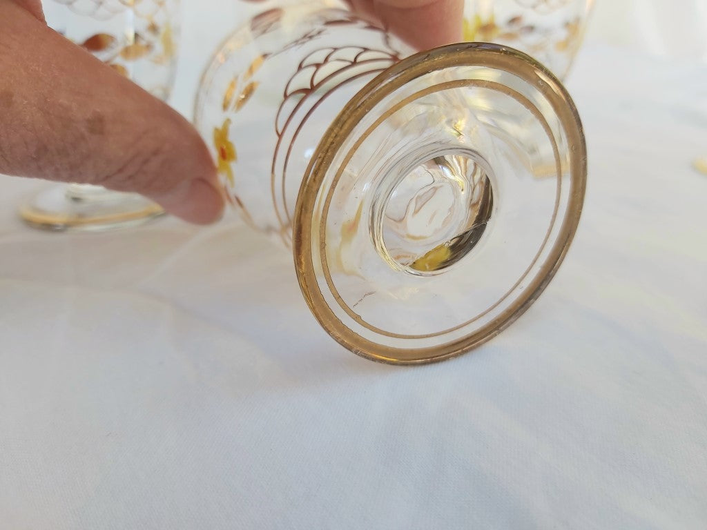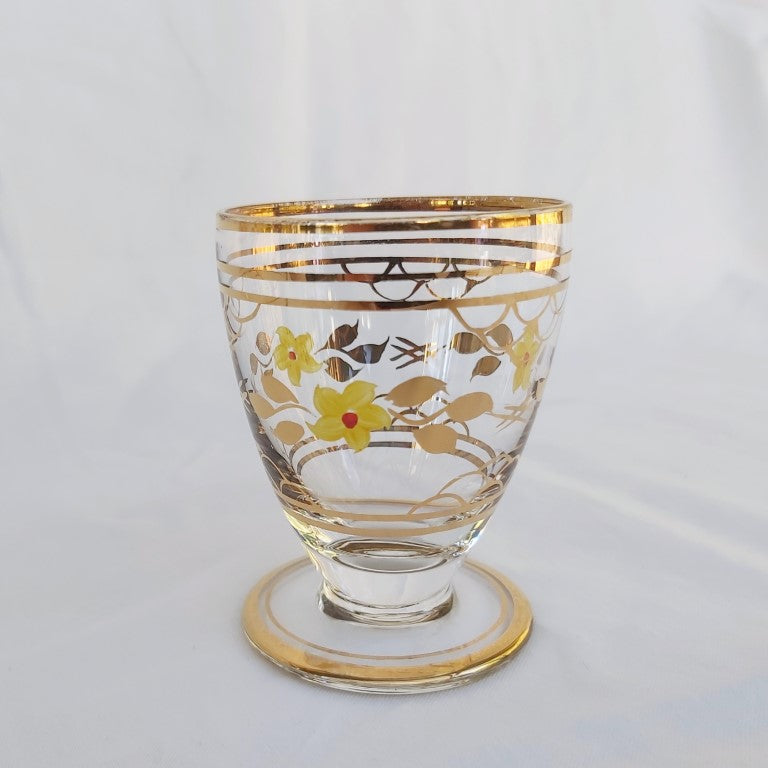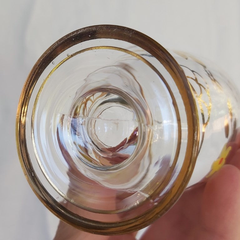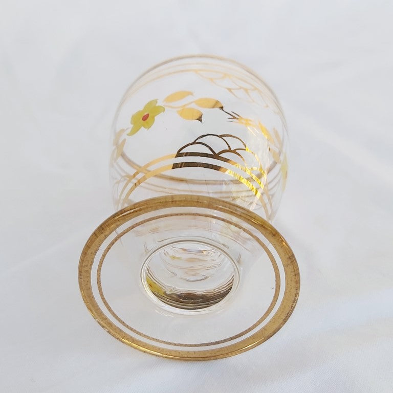 Beautiful vintage glass decanter and glasses, hand painted with a delicate yellow flower and gold pattern. Comes with a decanter with stopper and 5 glasses. In great vintage condition with just a few surface scratches.