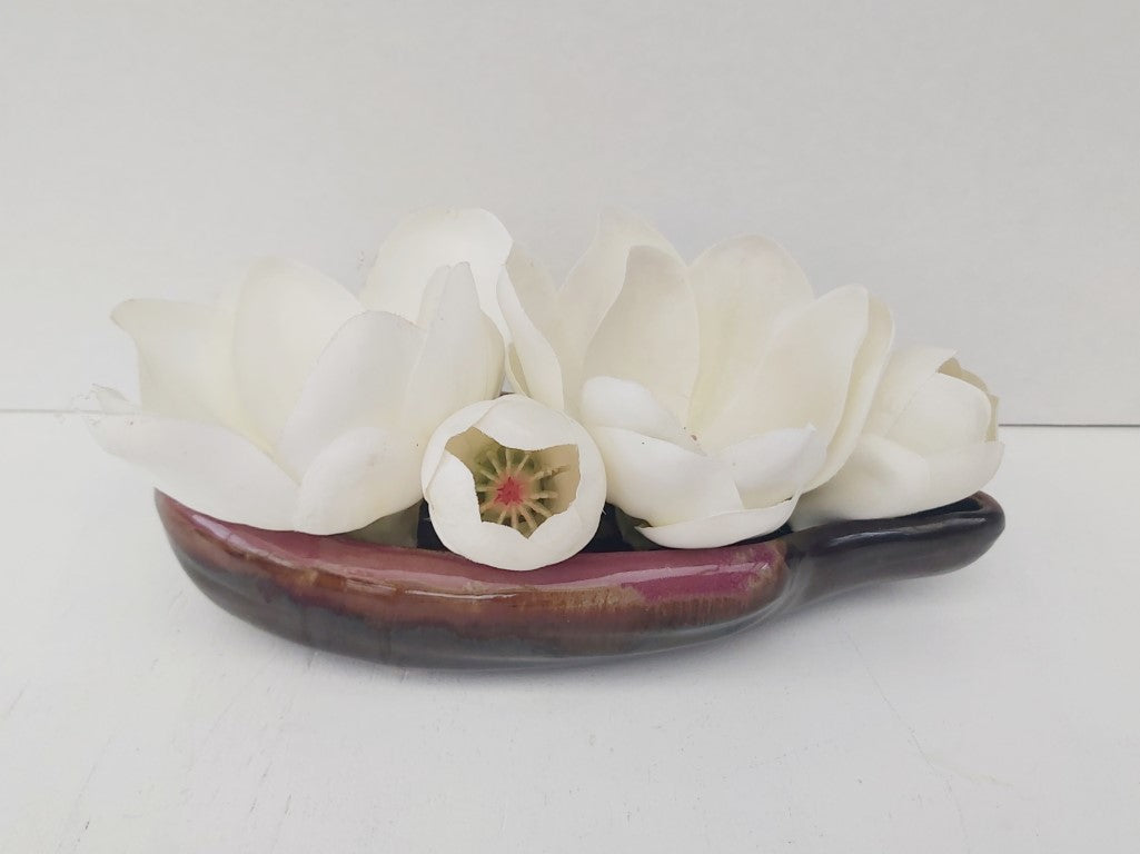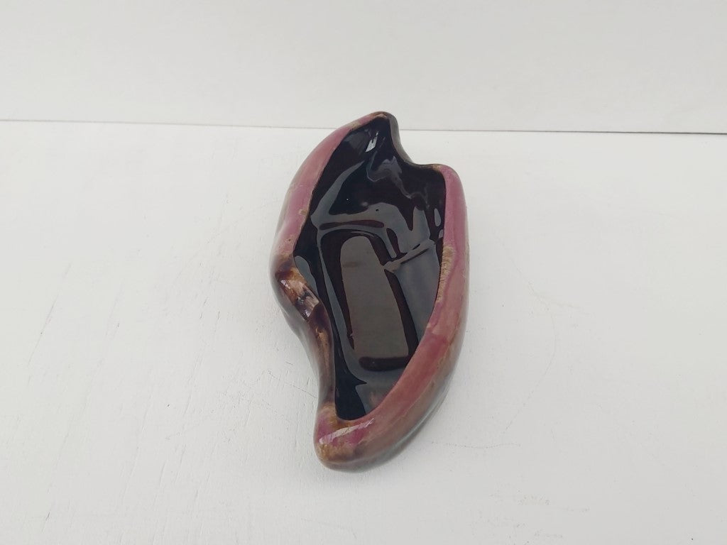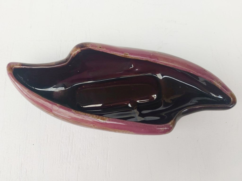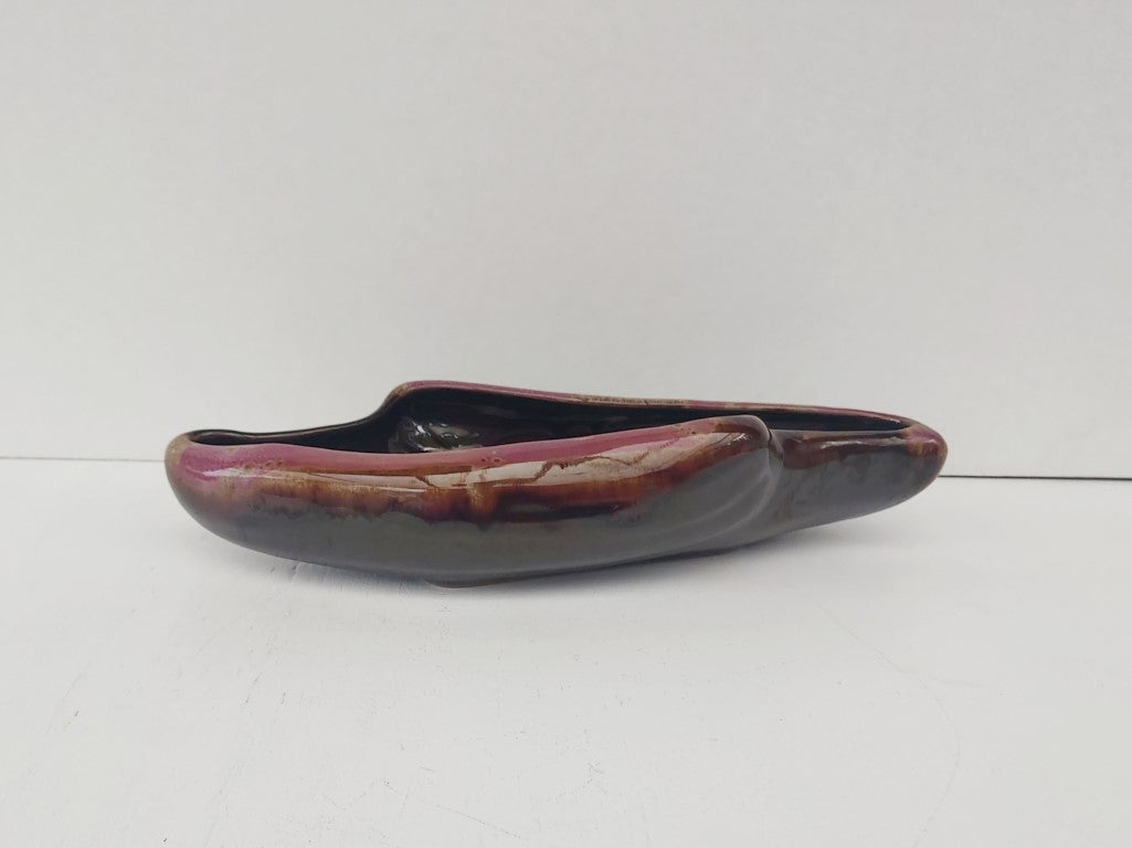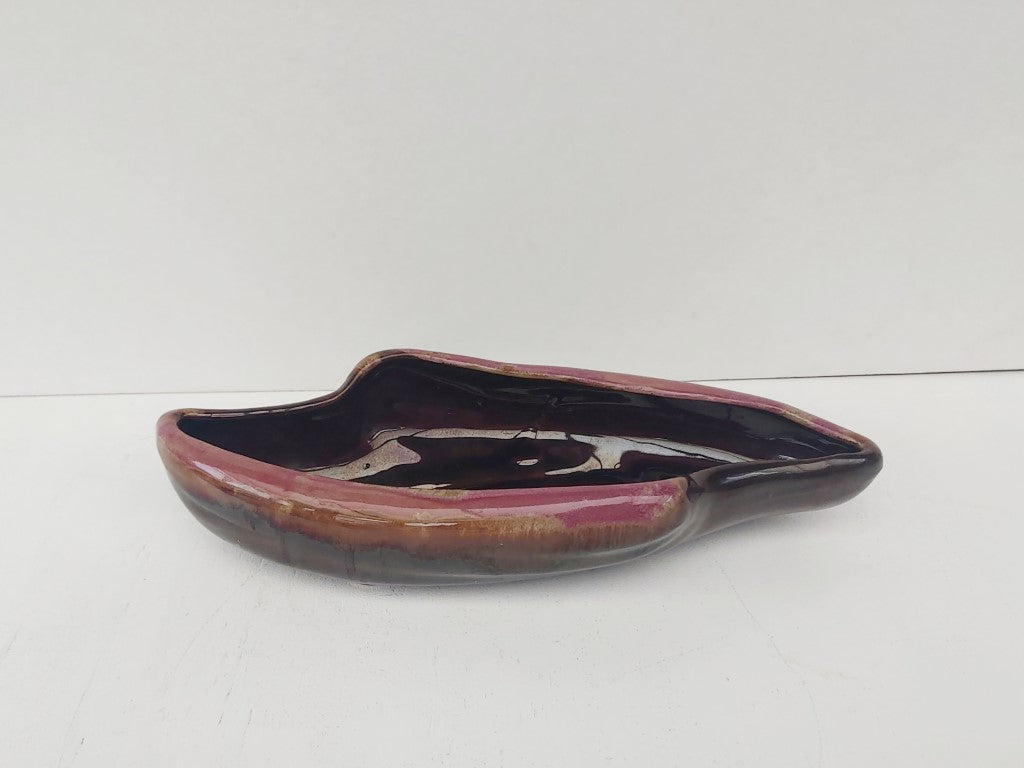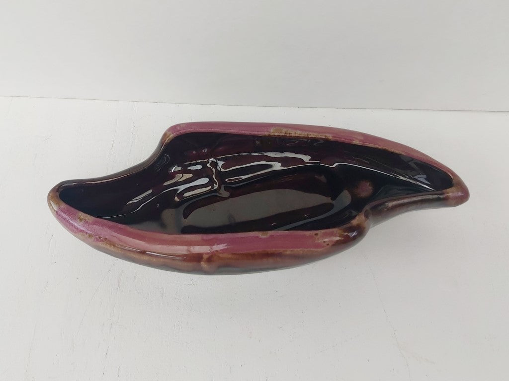 This redware planter with brown drip glaze and a beautiful purply pink edge has a stunning mid century vibe. Perfect for flower arranging or can be used as a dish. The shape and glaze means that it can also stand on its own as a decorative piece.