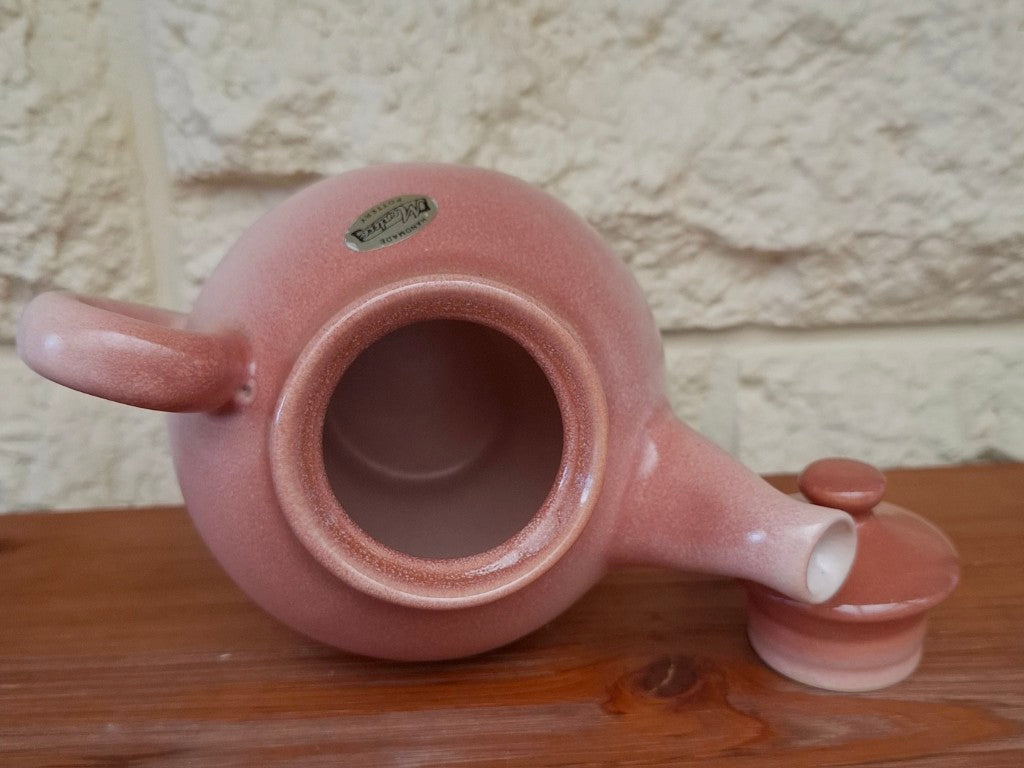 Enjoy a relaxing tea time with our Vintage Monteco Australia Studio Pottery Pink Ombre Tea Pot. In like-new condition, it features a gold makers sticker and a beautiful warm sandy pink ombre design. While there is a small flaw in the glaze hidden above the handle, it does not detract from its overall charm or function. This teapot is perfect for one person's large mug, or 2 regular tea cups.