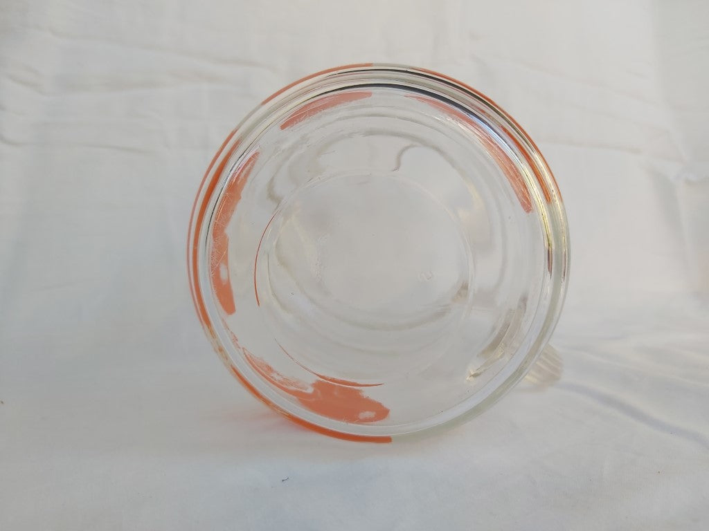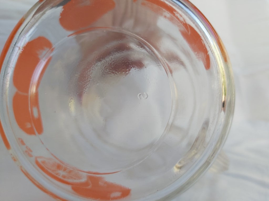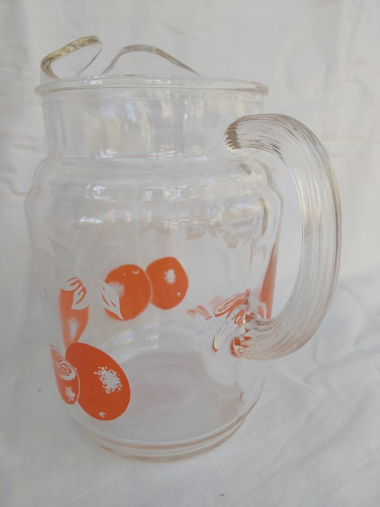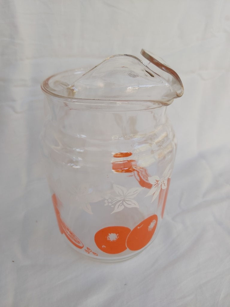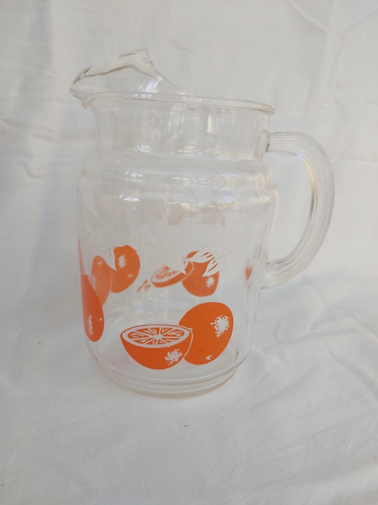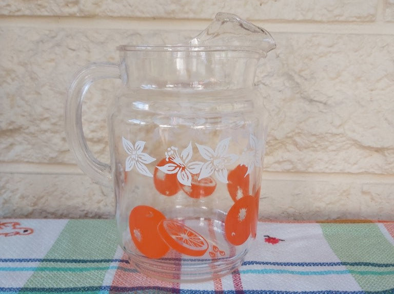 Introducing our Vintage Orange Blossom Juice Jug! This retro pitcher from the 1940's - 1950's features a charming fruit and flower design, complete with a twisted rope handle. The clear glass and vibrant paint make this a perfect addition to your kitchen collection, in excellent condition with no chips or cracks.